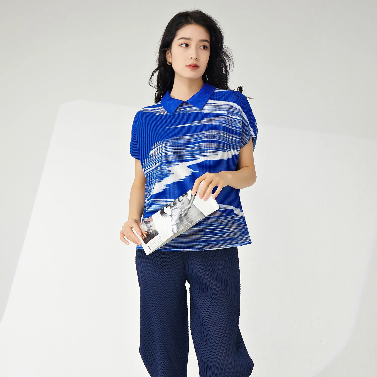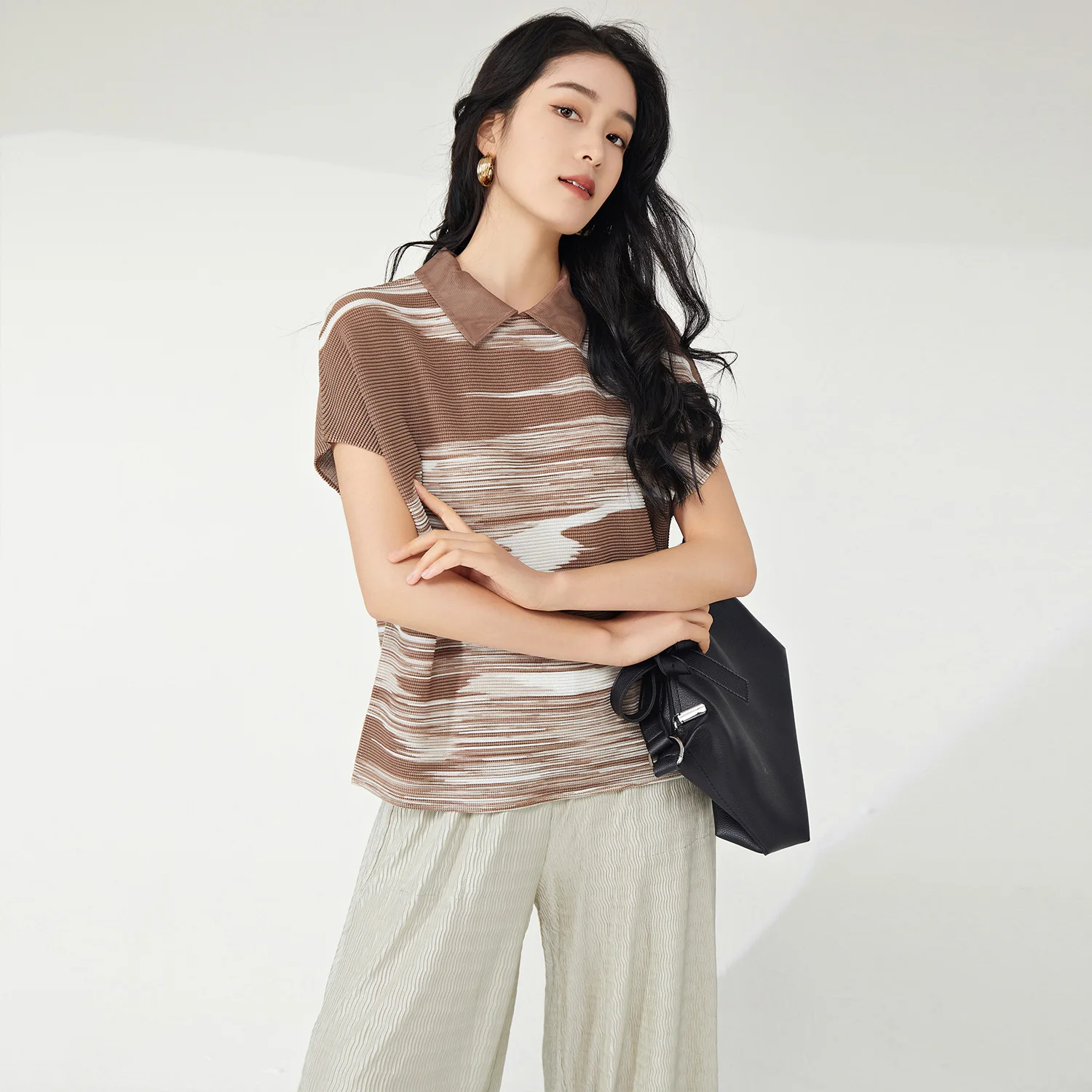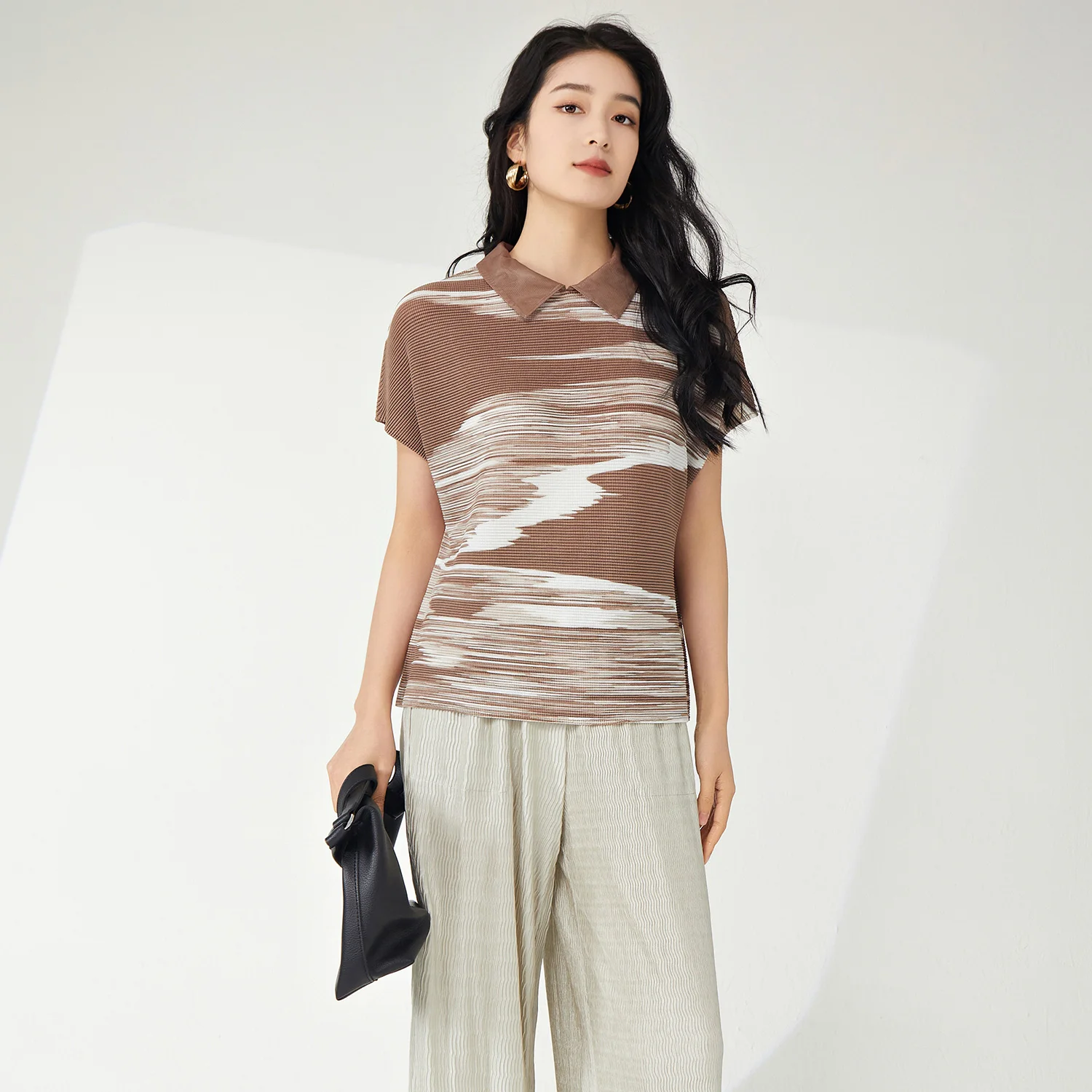 Latest Women's Vintage Summer T-Shirt Pleated Fashion Top Lapel Stretch Printed Striped Pattern Turn-Down Collar Short-Sleeved