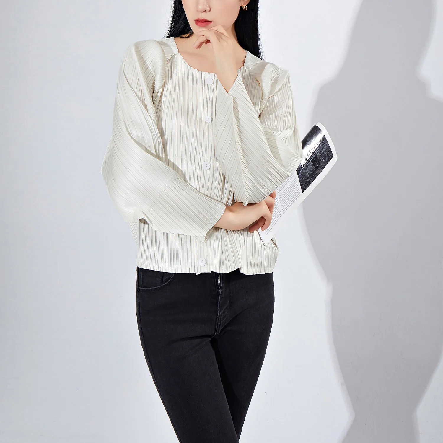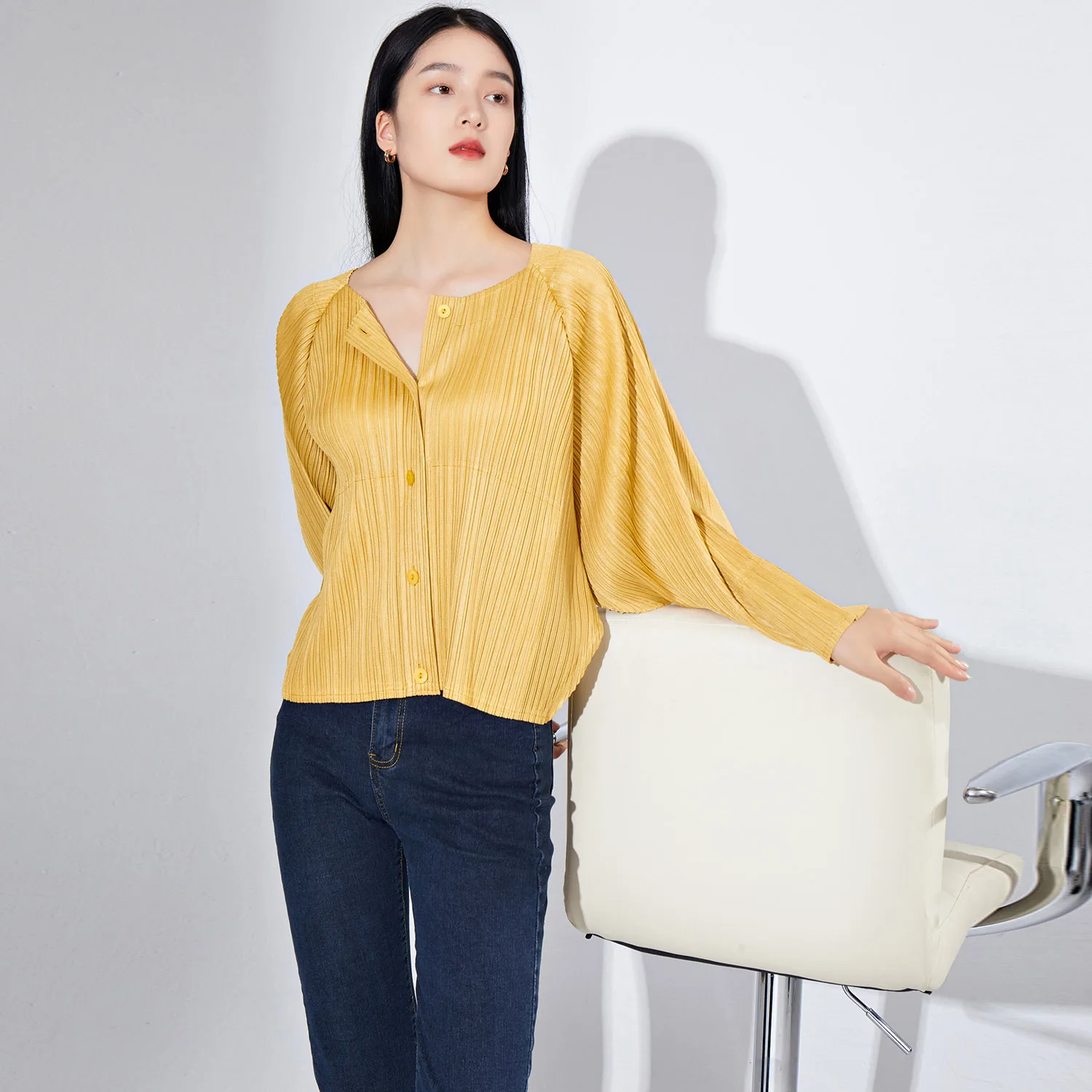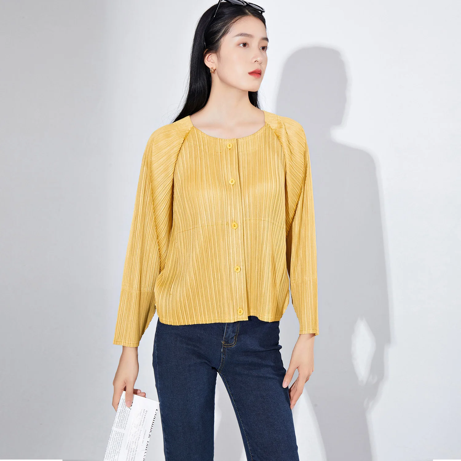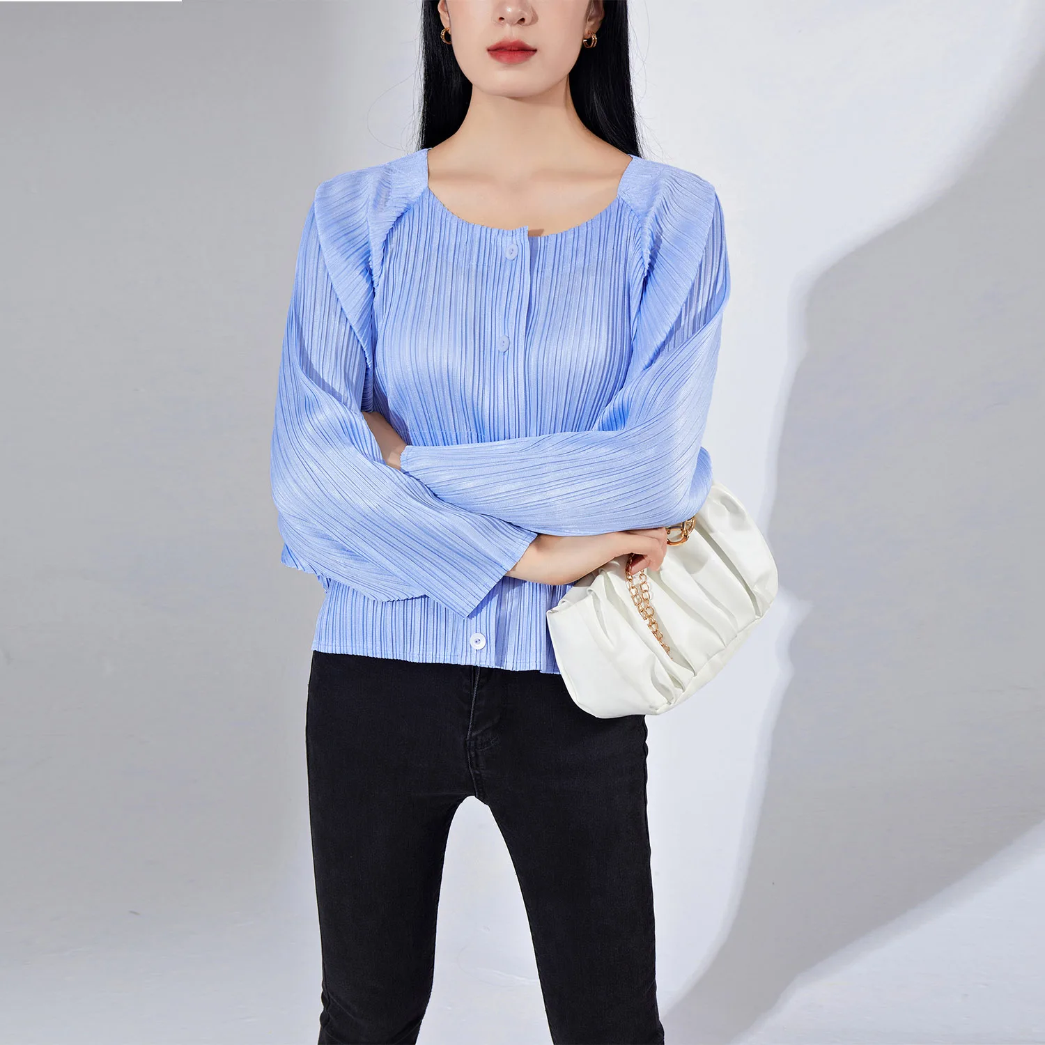 Autumn Women's Shirt Stylish Single-Breasted Long Sleeve Miyake-Inspired Pleated Cardigan Blouse Top