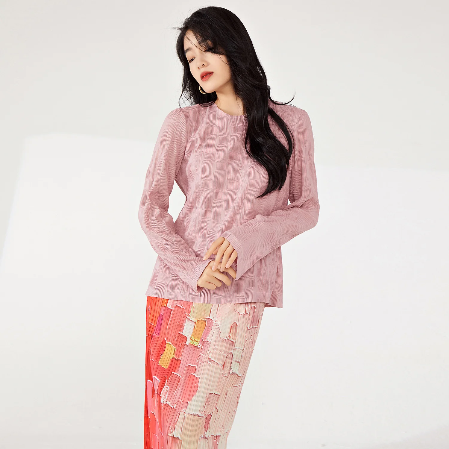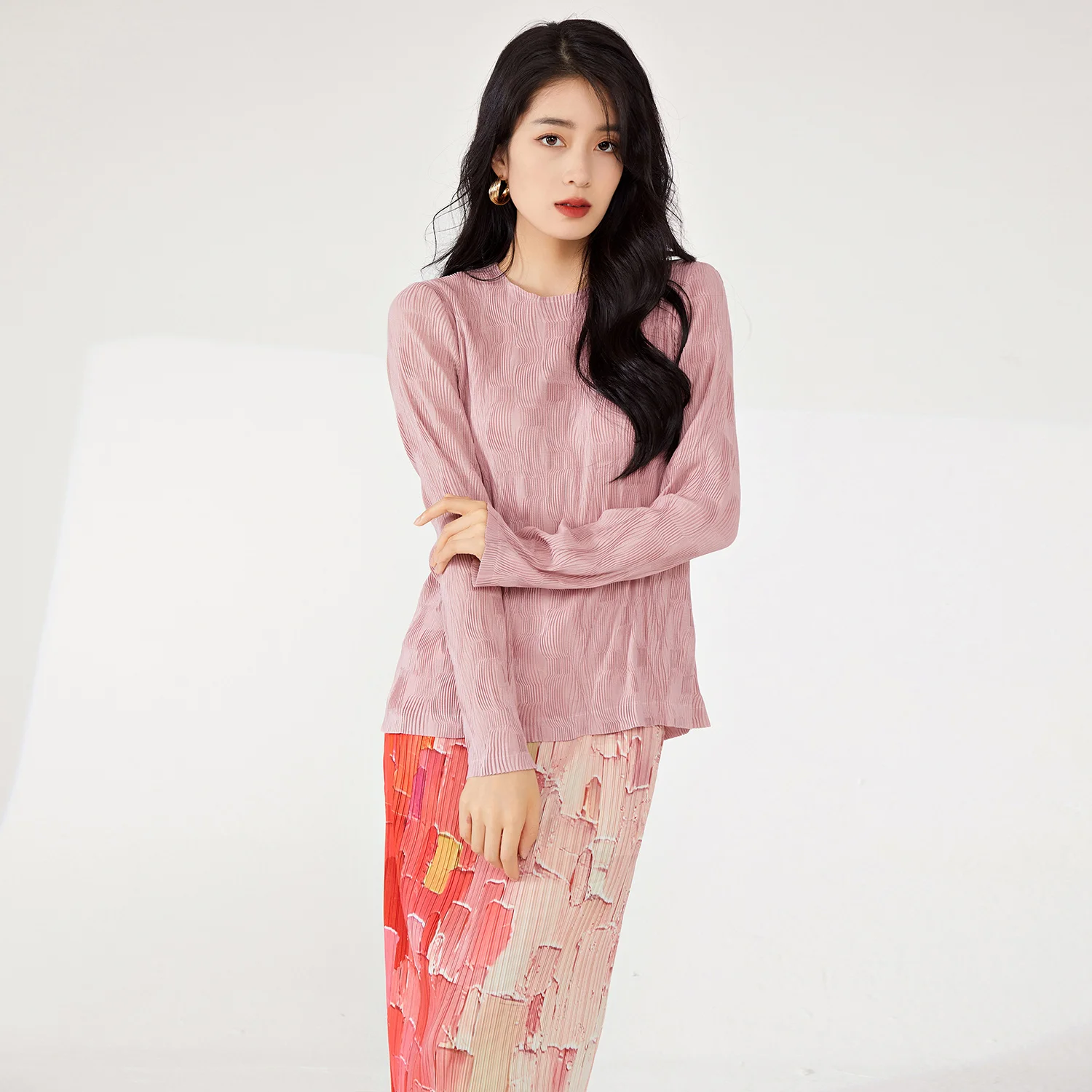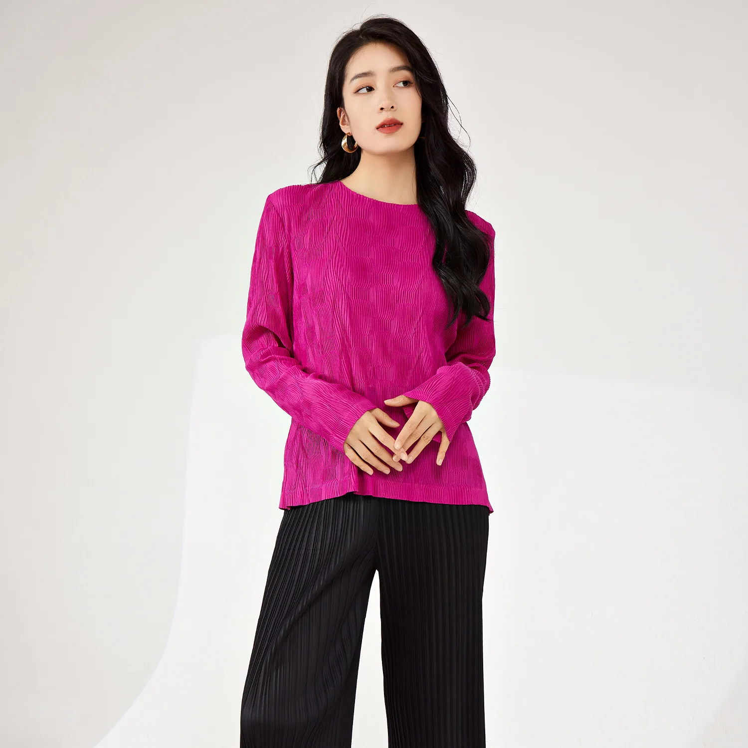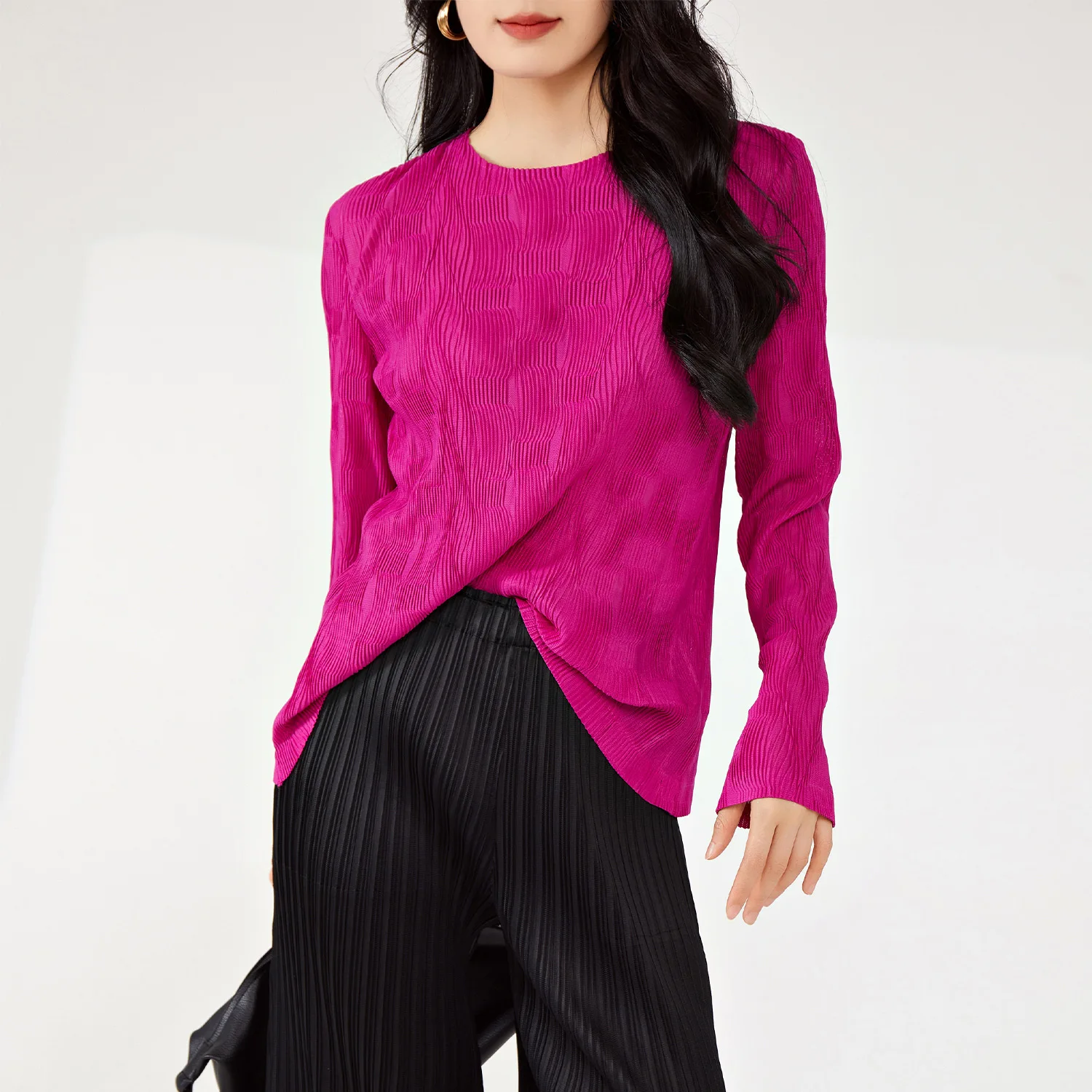 Women's High Quality Woven T-Shirt Vintage Pleated Design in Solid Colors Personalized Stretch Printed Top for Spring Summer