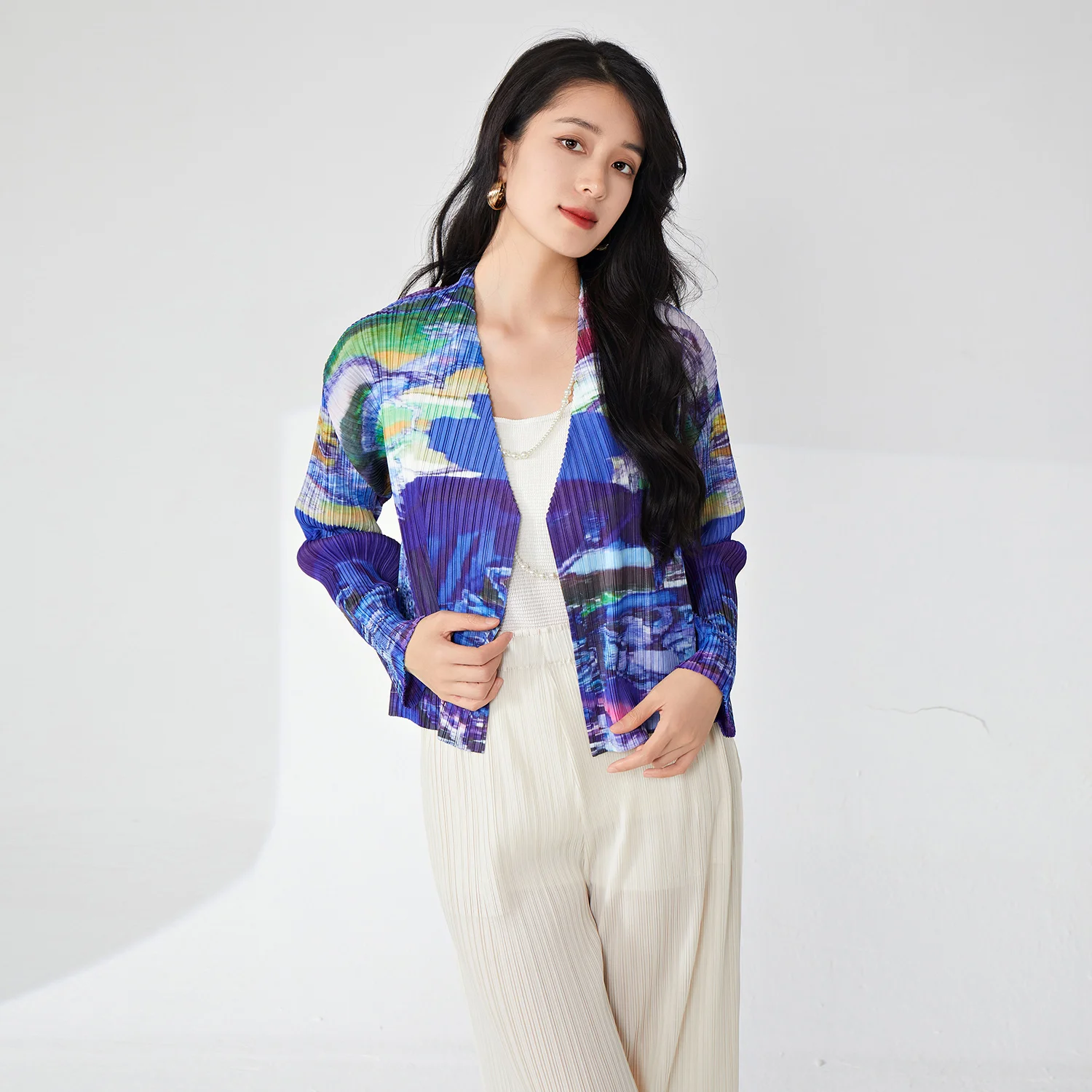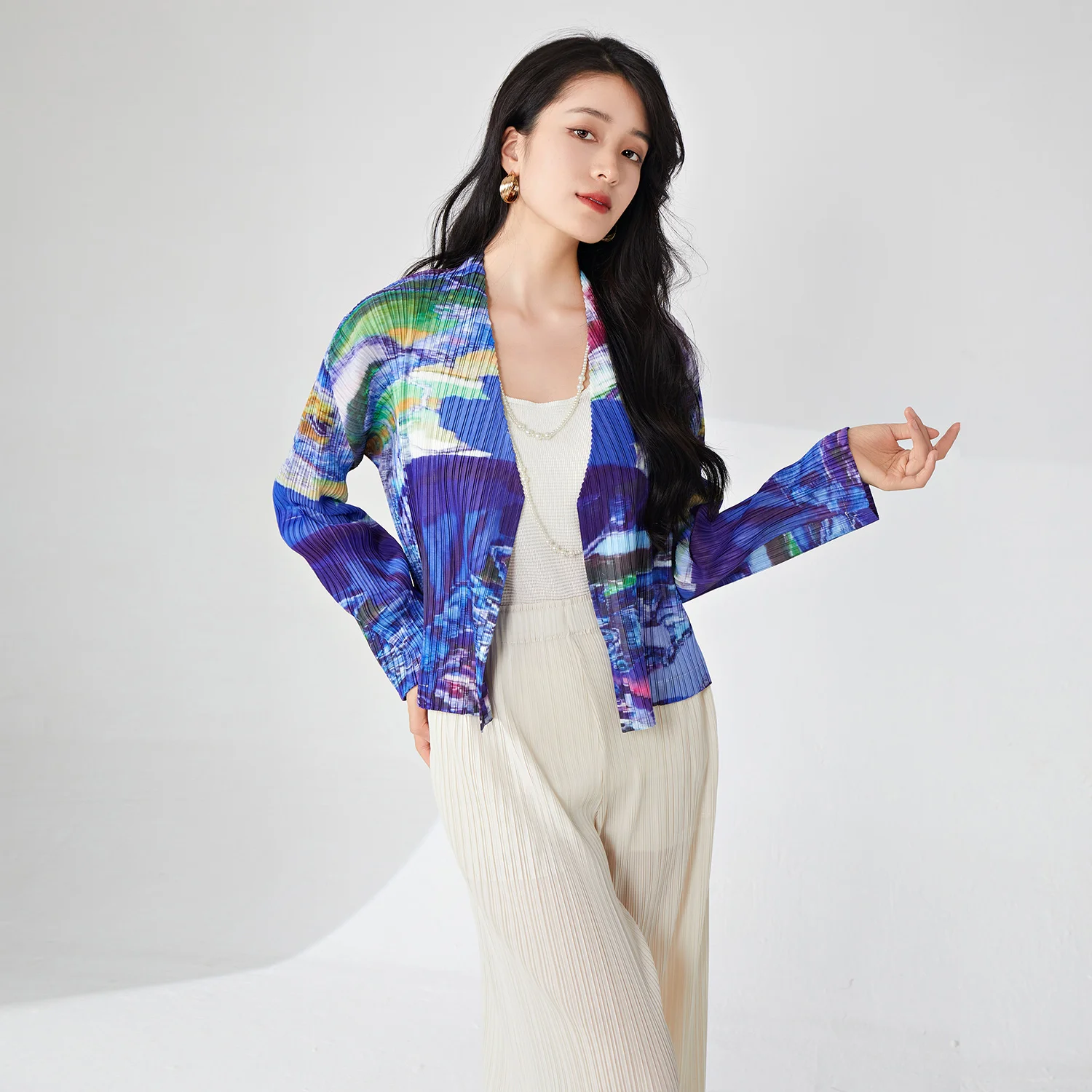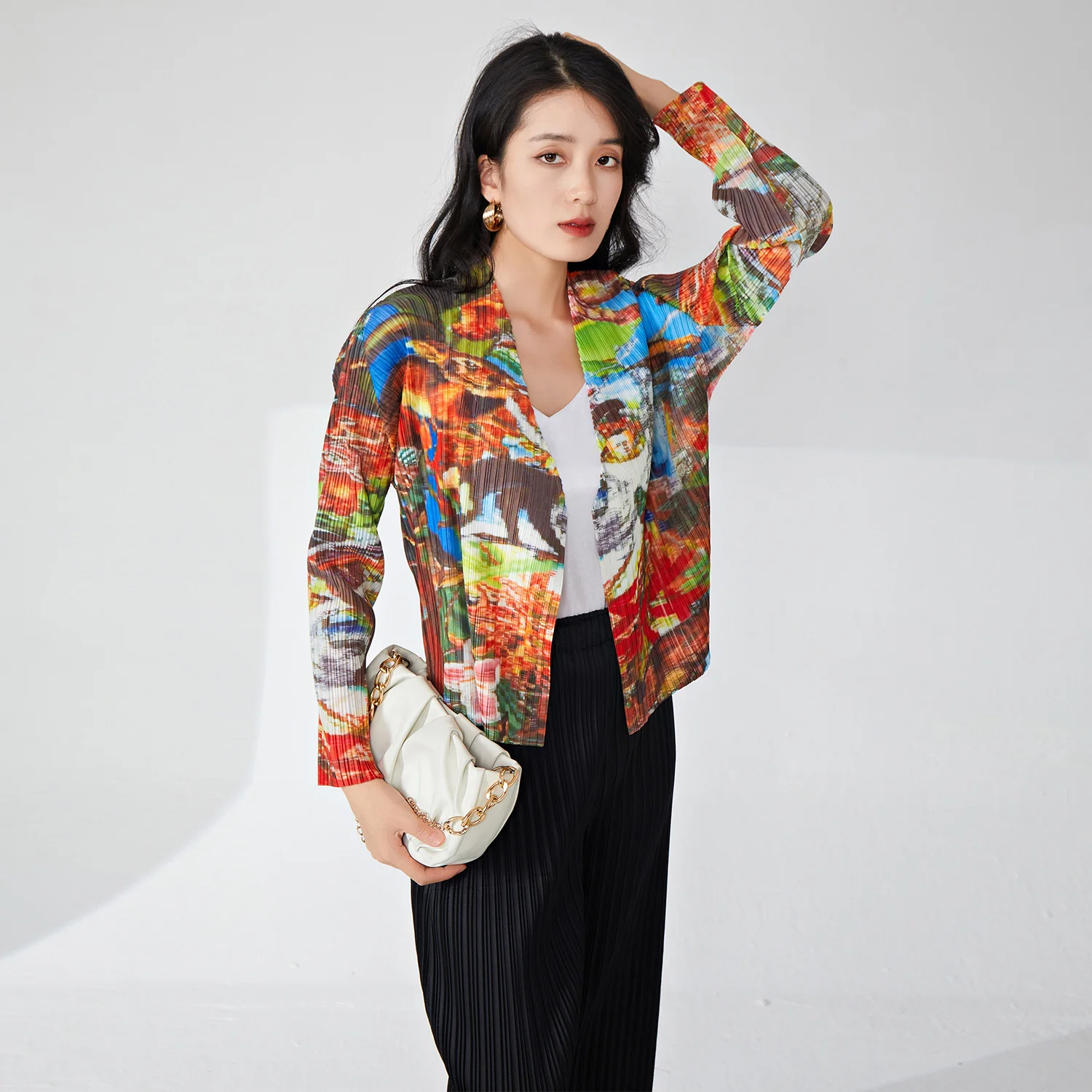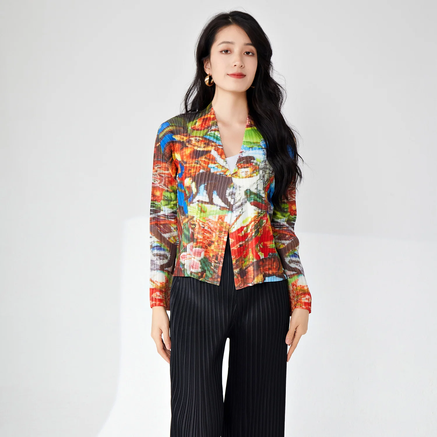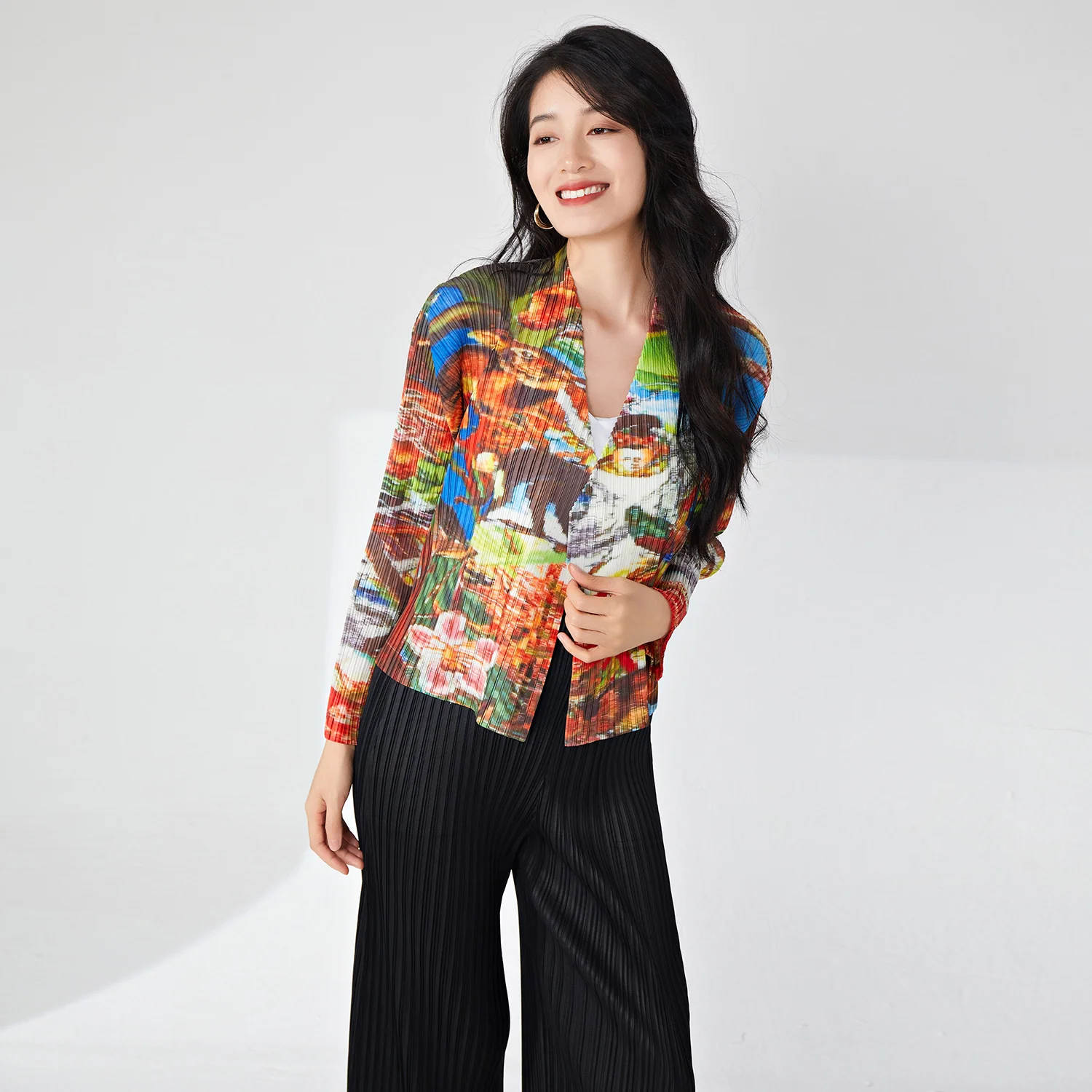 Miyake Women's Elegant Vintage Cardigan T-Shirt High Quality Pleated Fashion Top Western Printed Lapel Casual Vintage Design