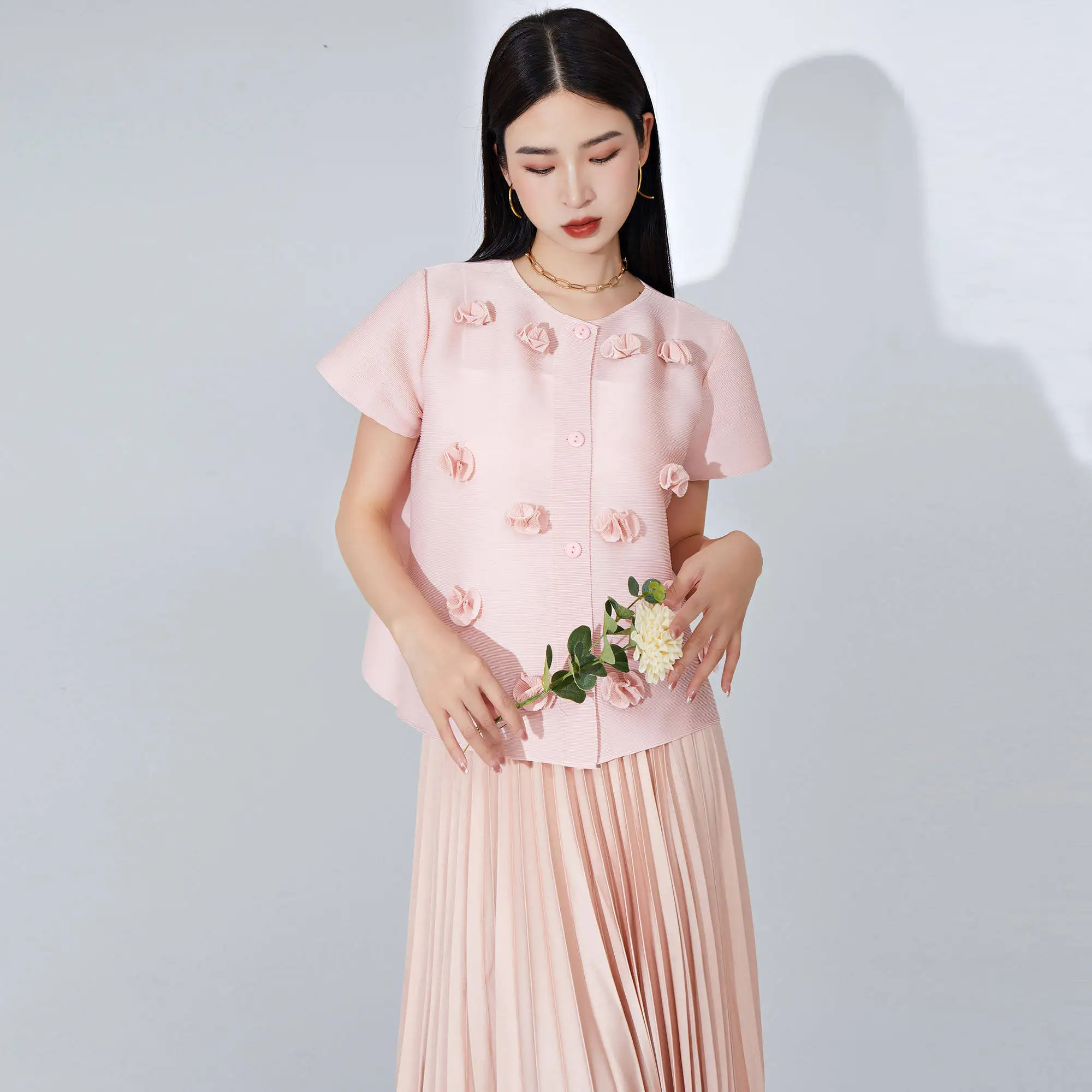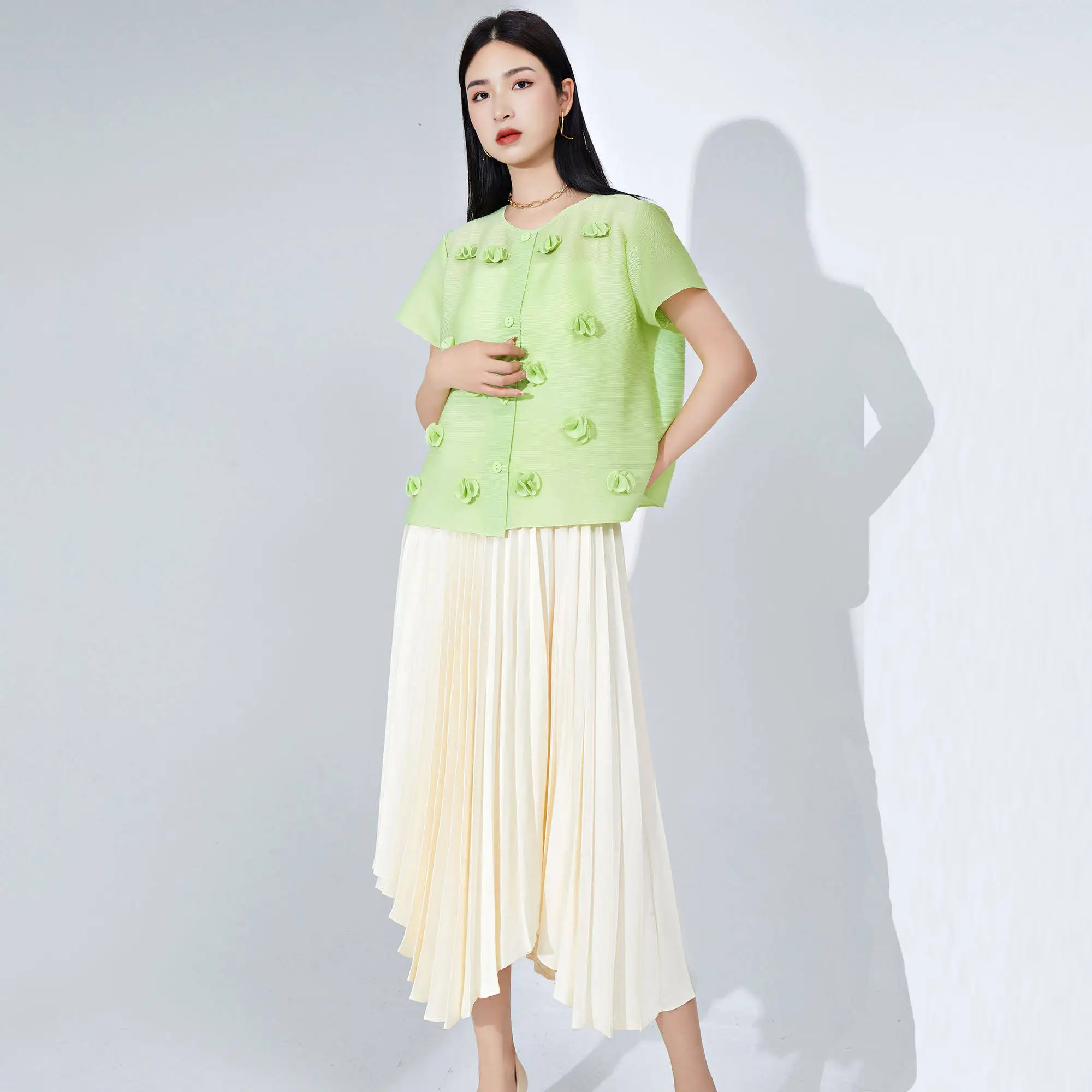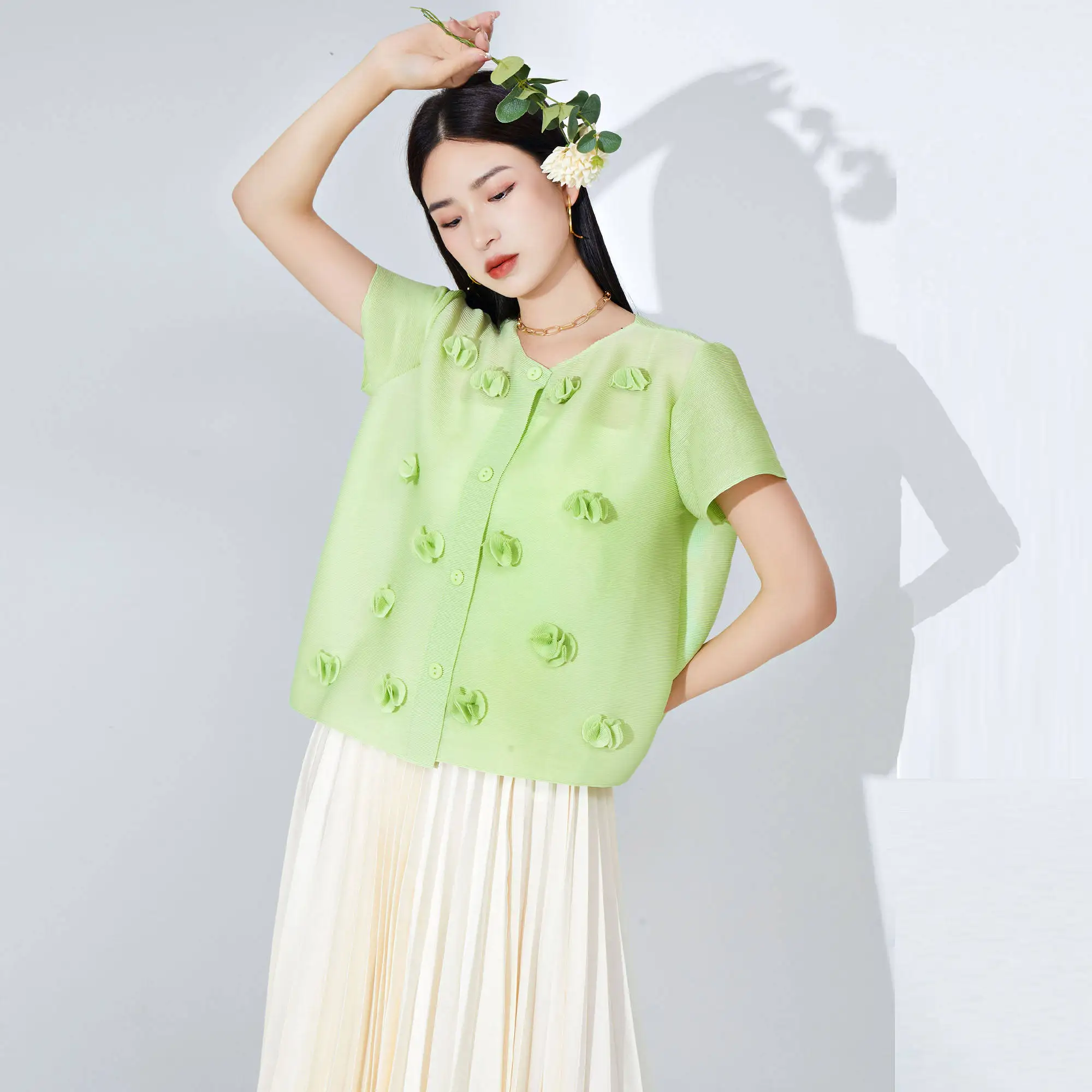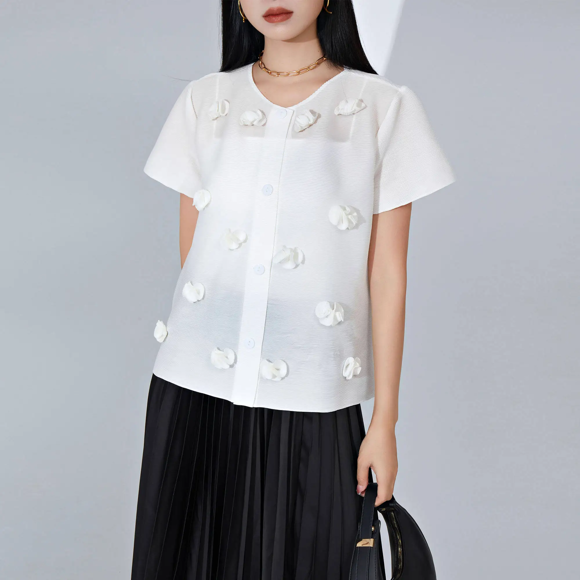 Women's Short Sleeve Top Loose Single-Breasted Cardigan Embroidered Flowers Design Fashionable Miyake Pleated T-shirt