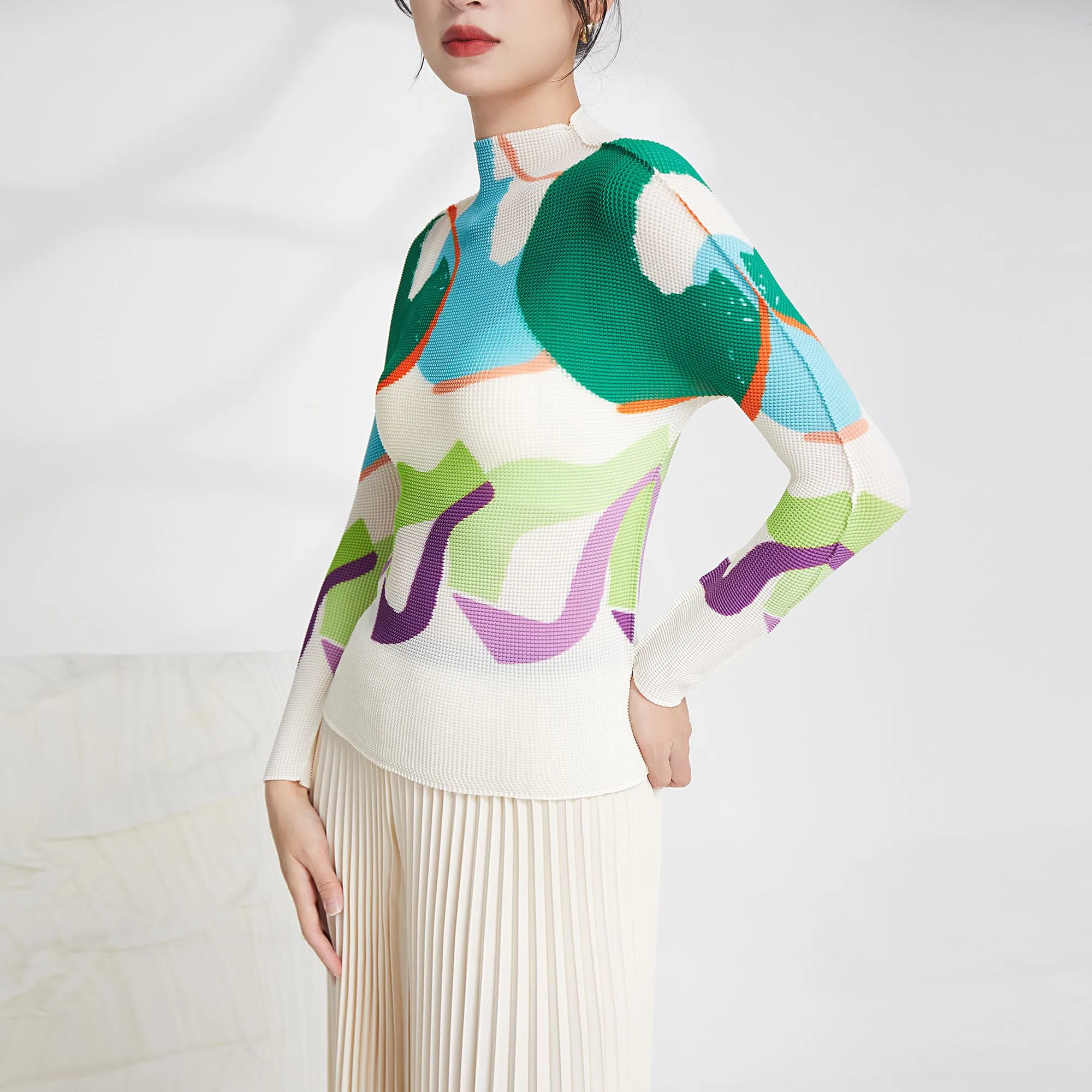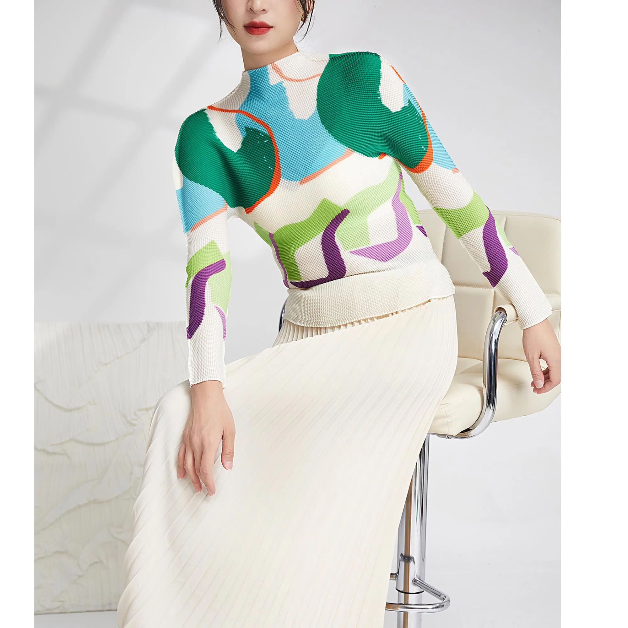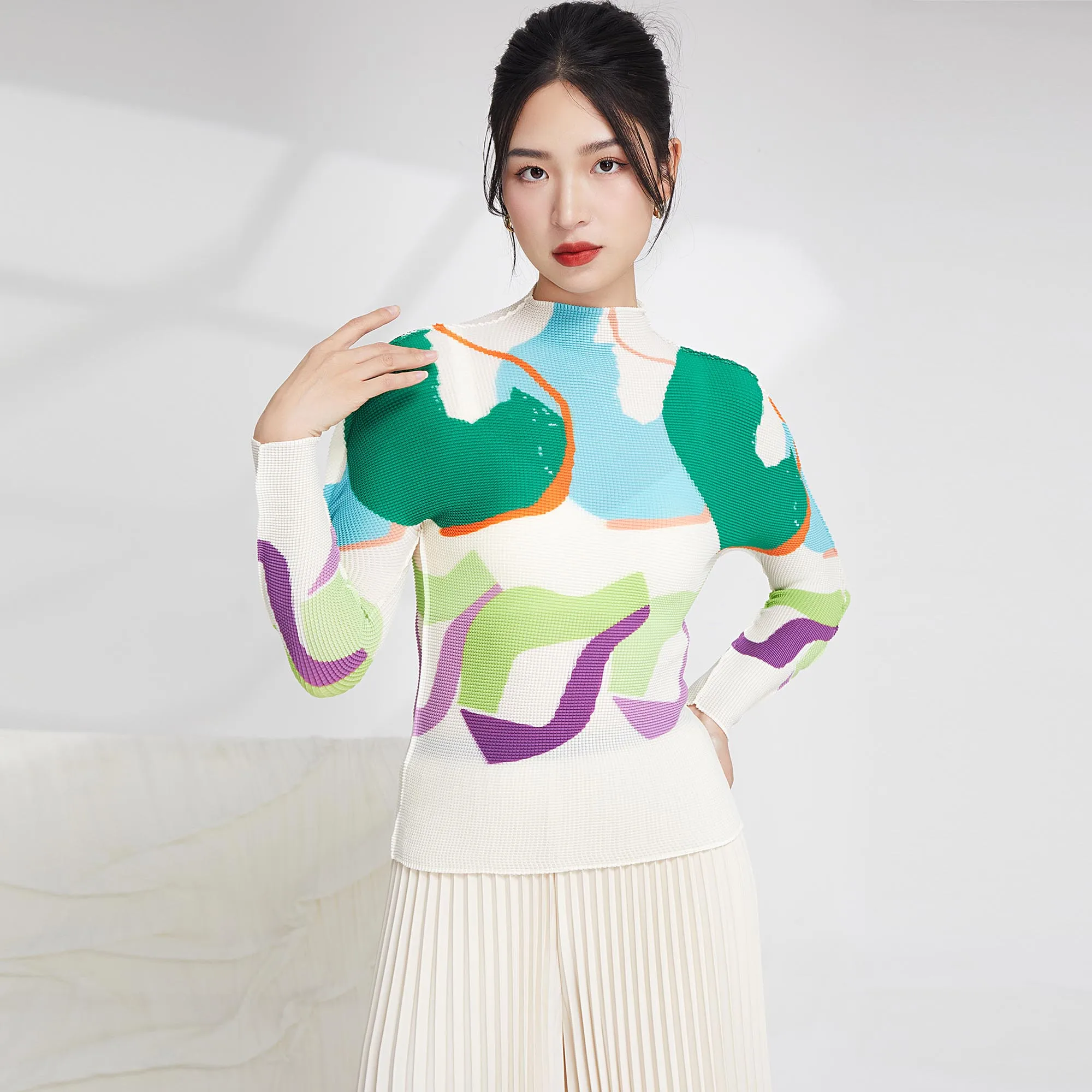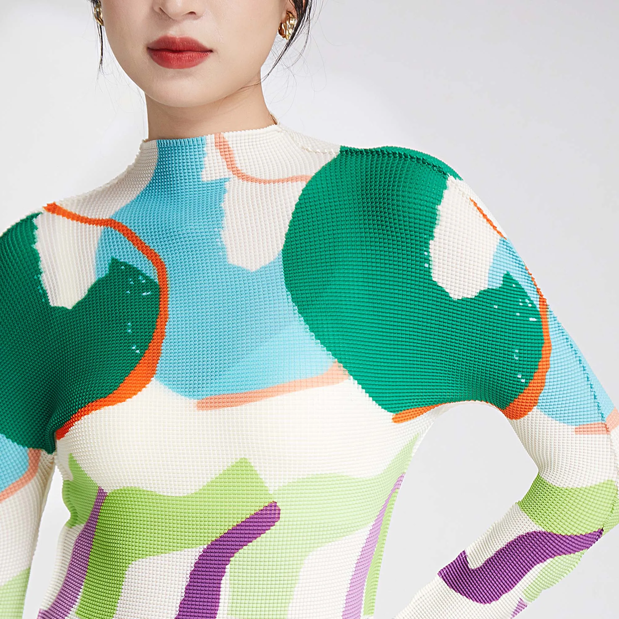 Miyake Summer Newest Design Fashion Printing Abstract Pattern Long Sleeve Tops Women Casual Shirts Stretch Pleated T-shirts