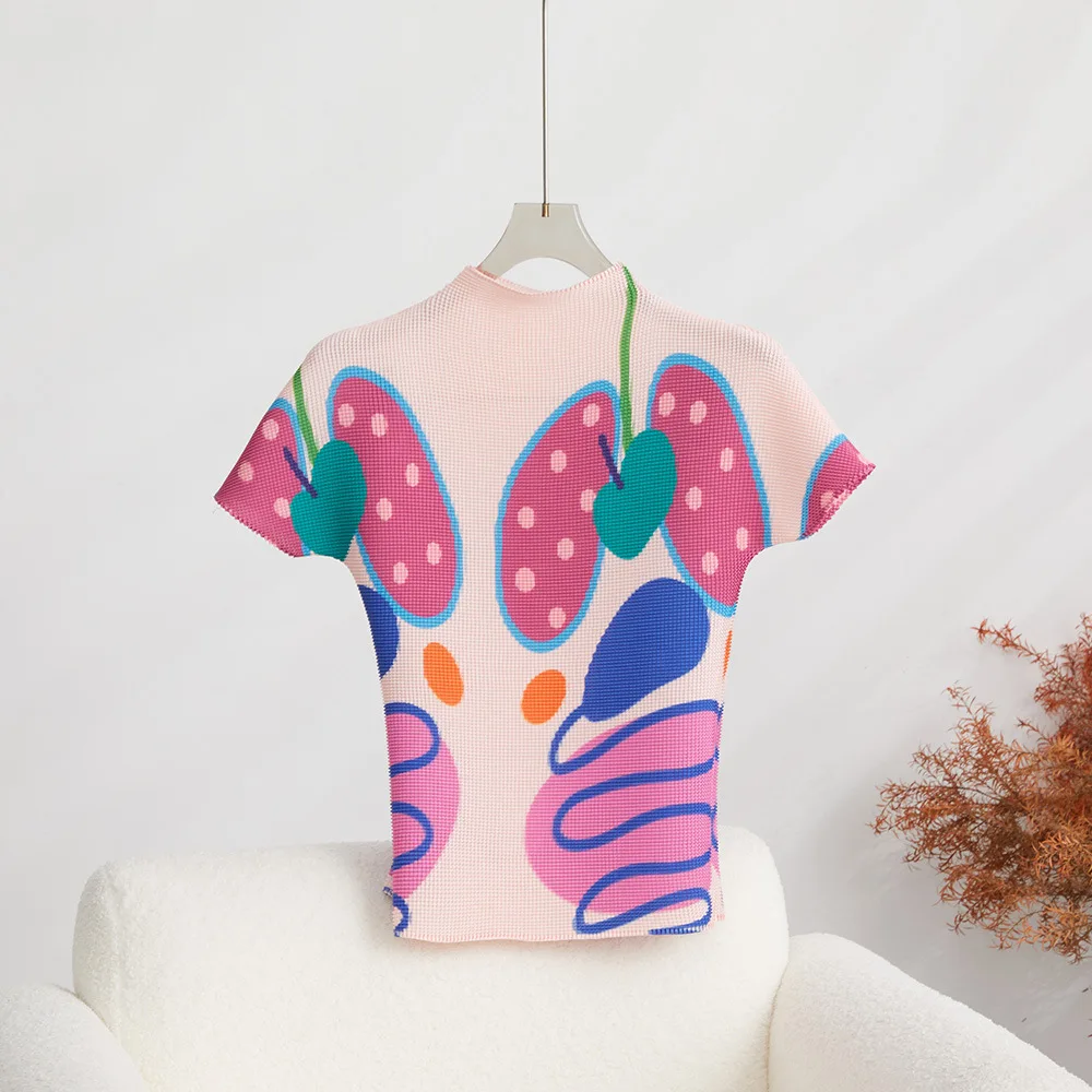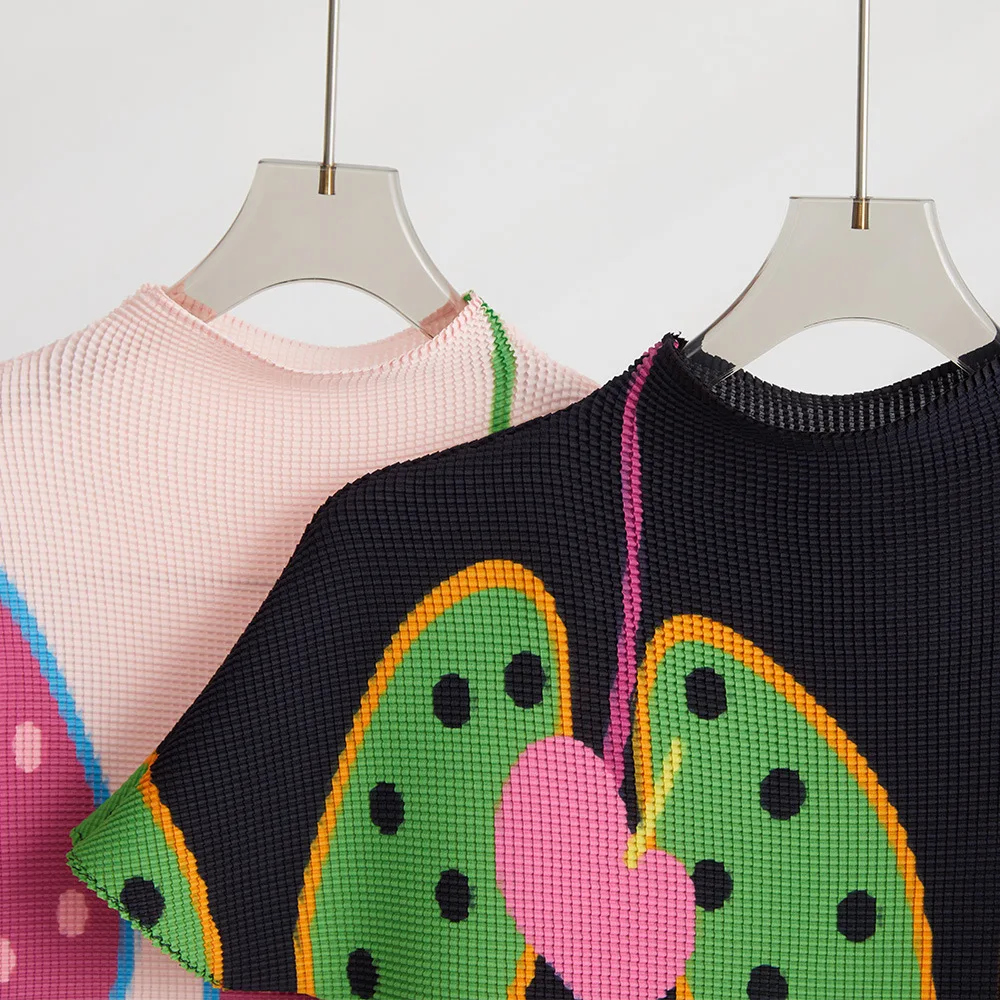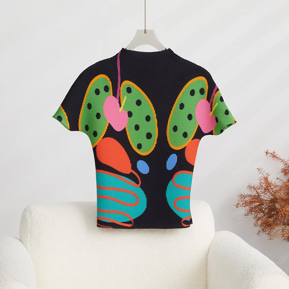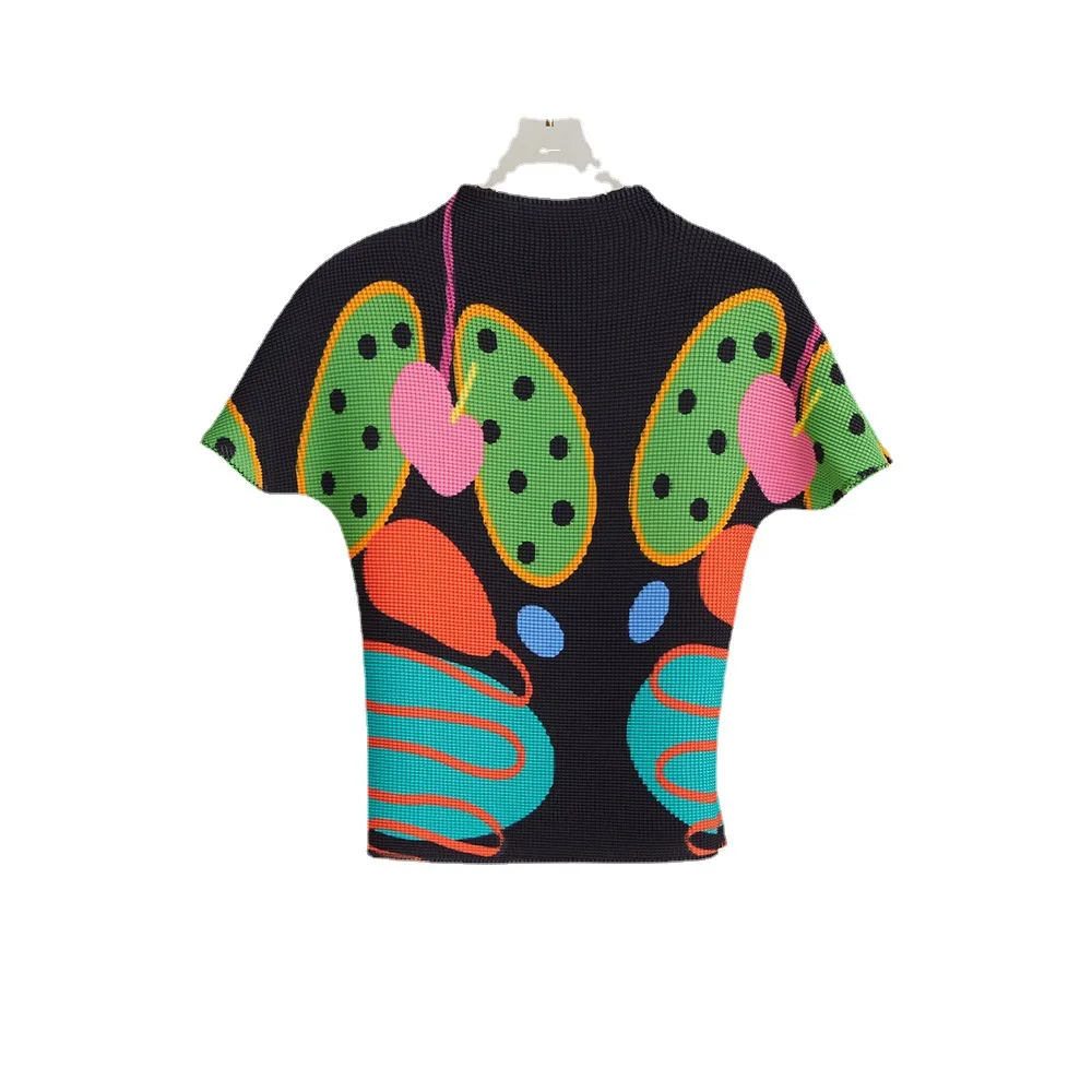 High Quality Miyake Pleated Top Ladies Summer Short-Sleeved Stretch Shirt Casual Style Printed Portrait T-Shirt
