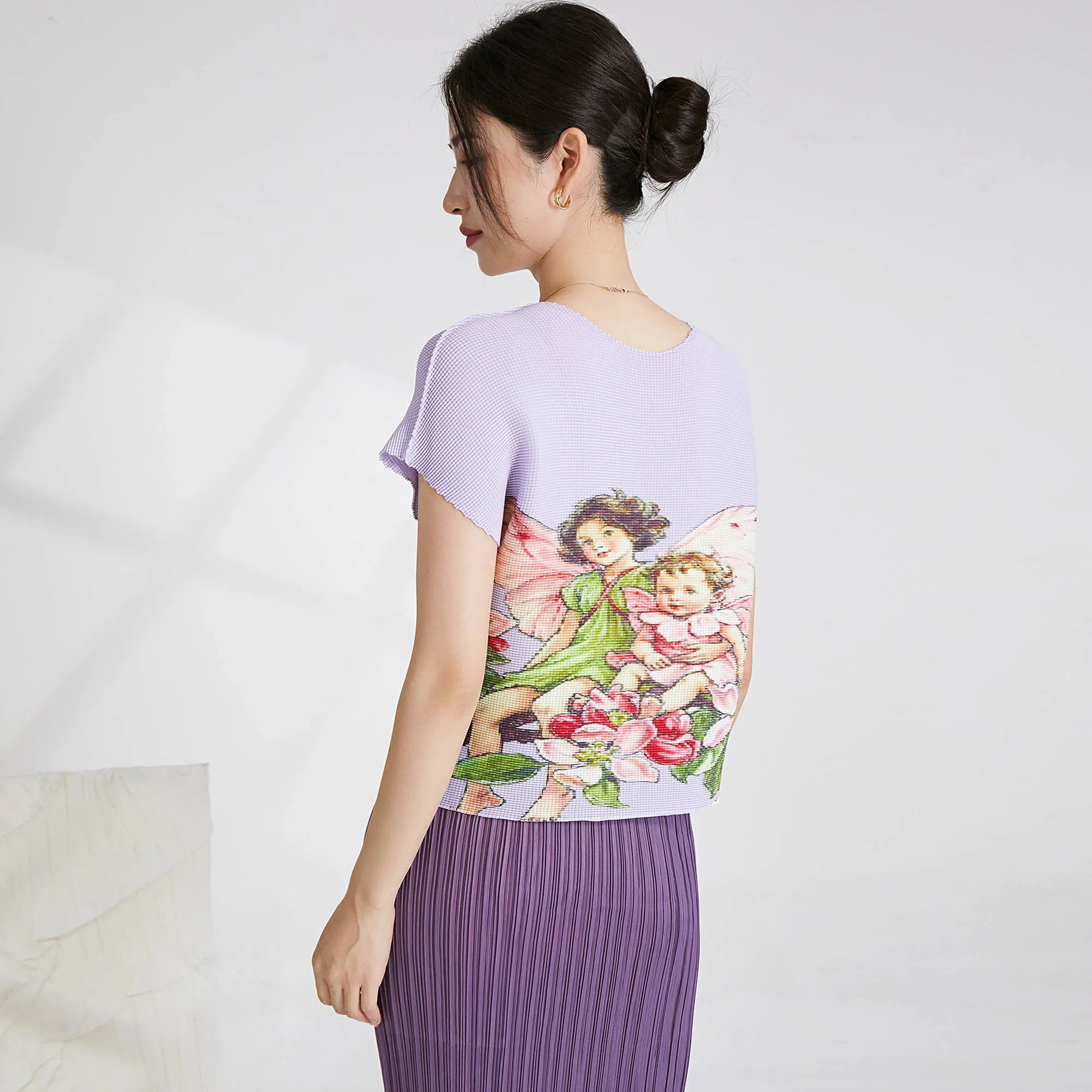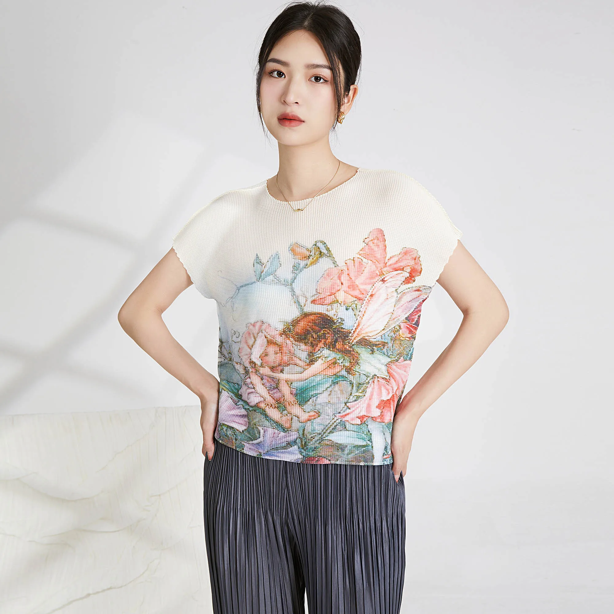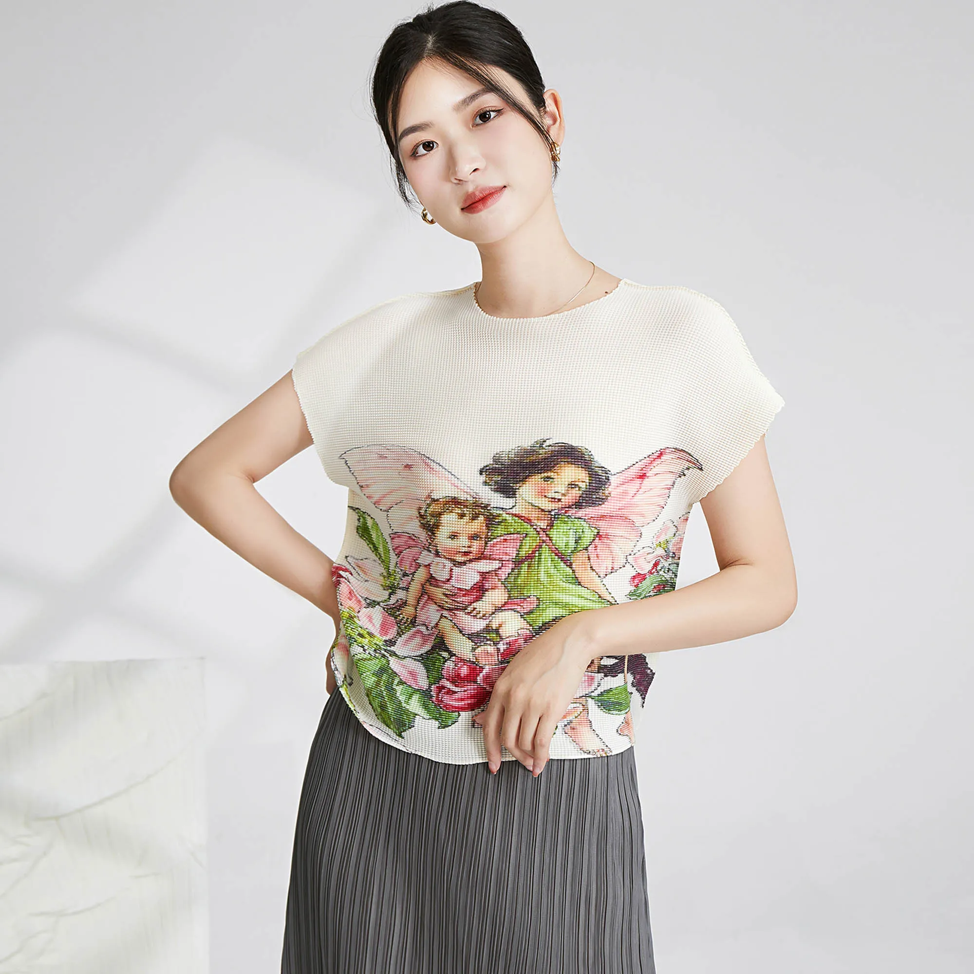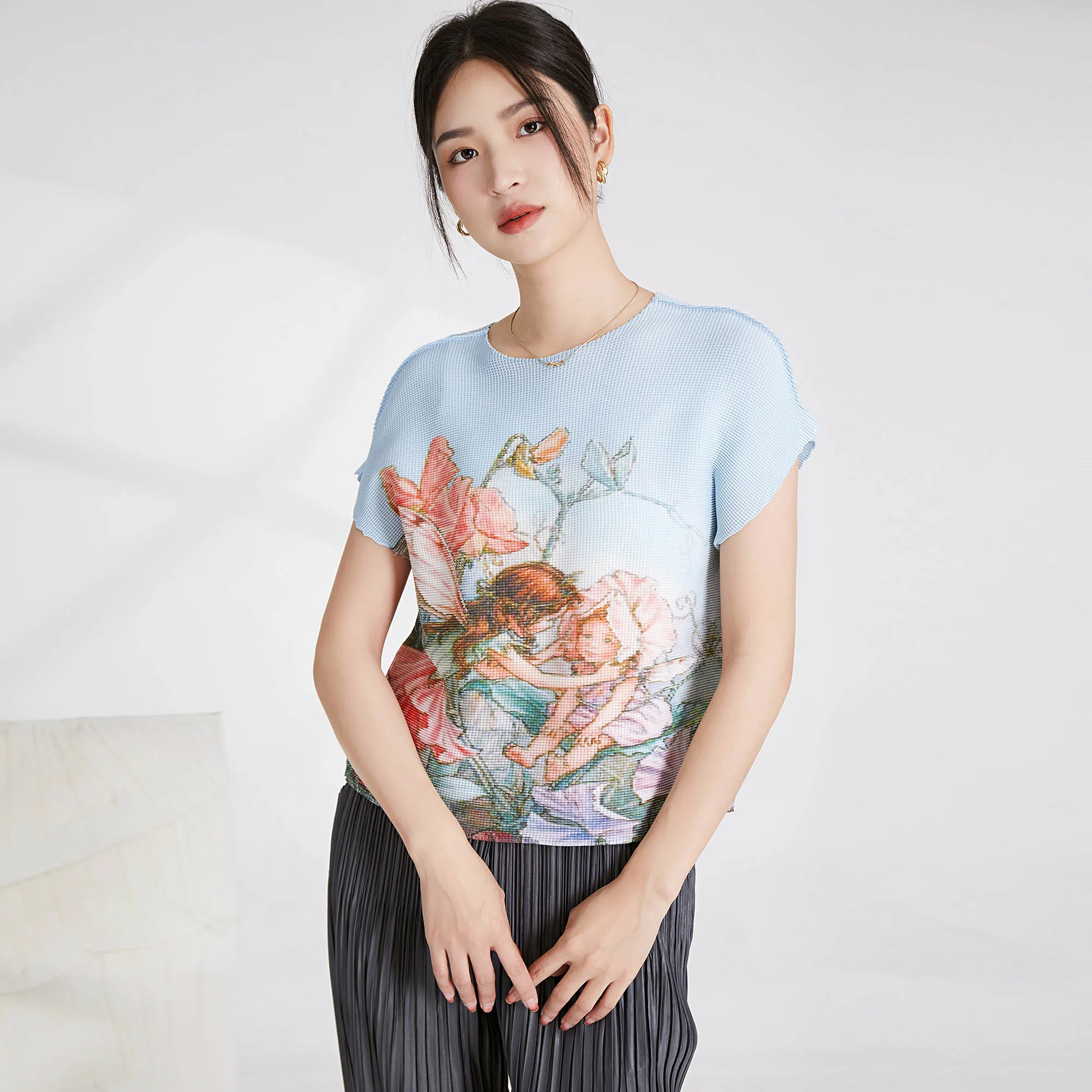 2025 Summer Miyake Latest Shirt Fashion Design Printed Short-sleeved Top Women's Casual Pleated Elastic T-shirt