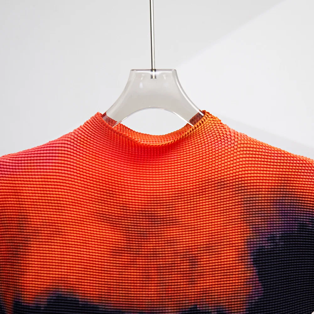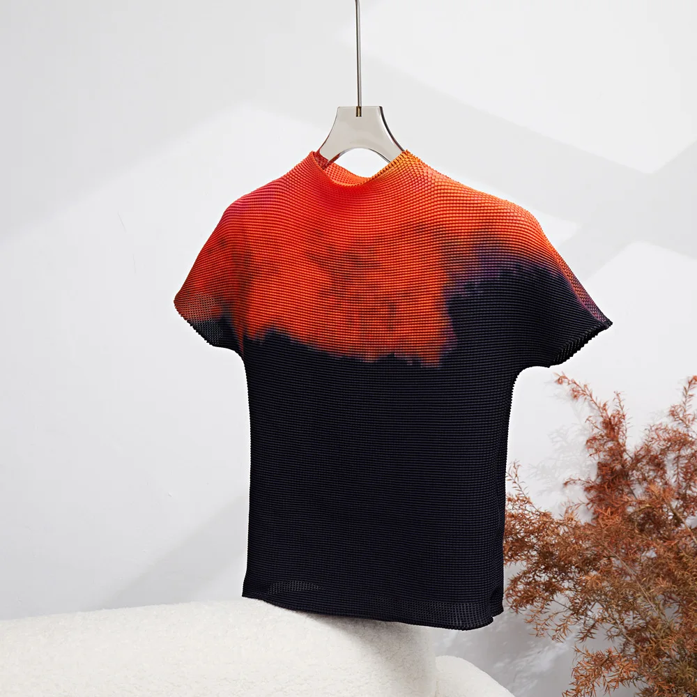 High Quality Miyake Pleated Top Women Casual Style Shirt Printed Stretch Pleats Short Sleeve T-Shirt