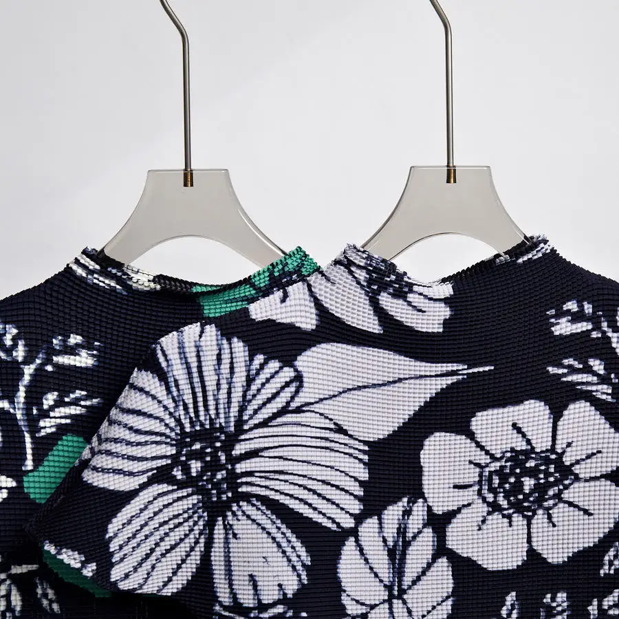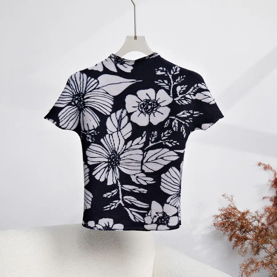 Miyake Women's Stretch T-Shirt Pleated Top Short-Sleeved Casual Style Compressed Fabric Chiffon Material for Summer