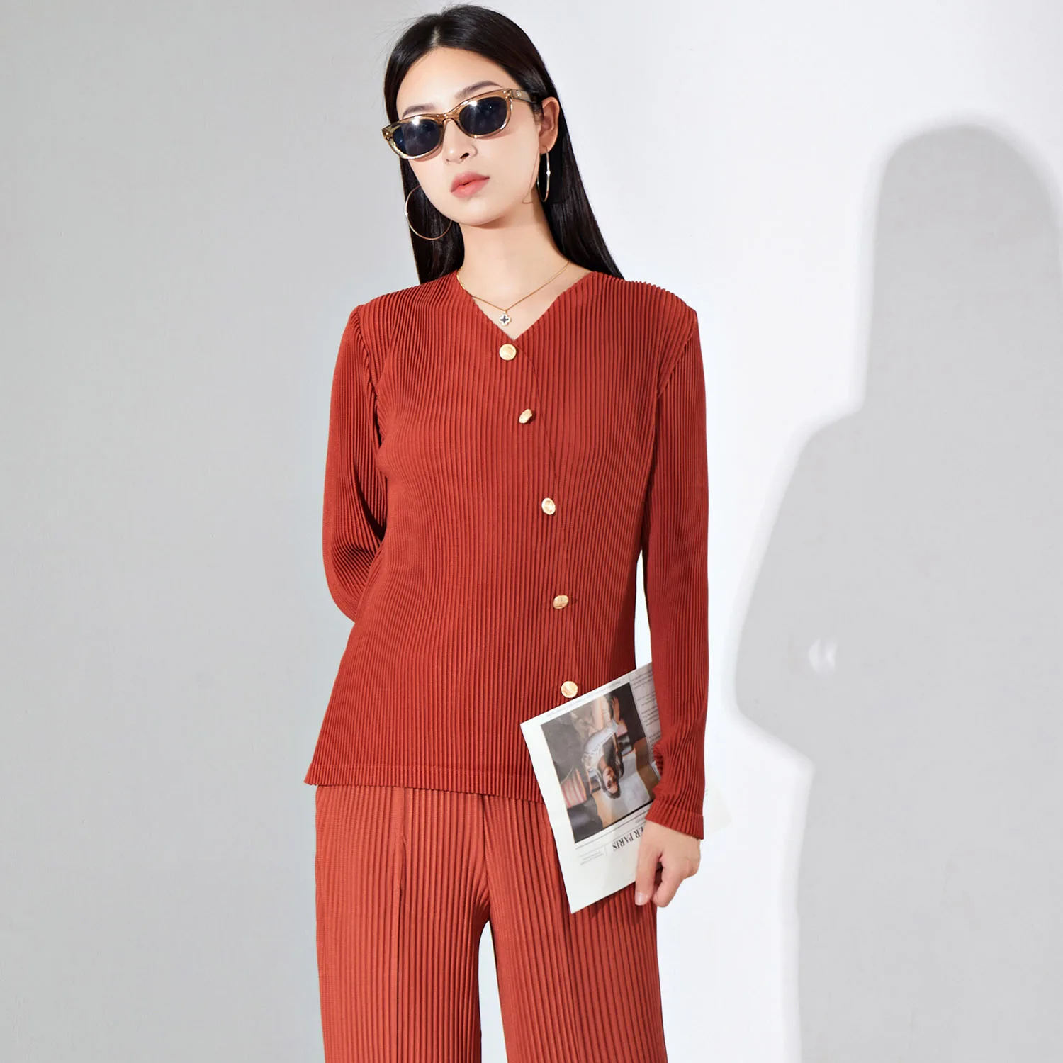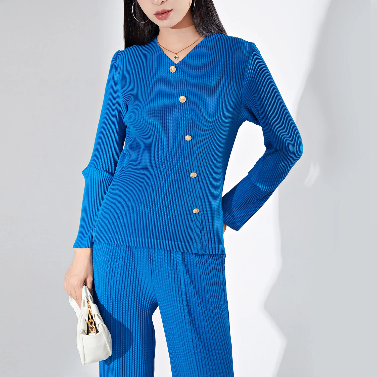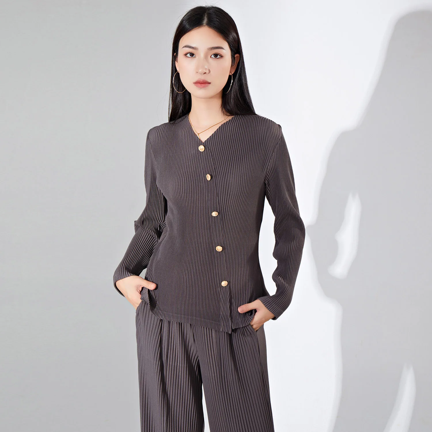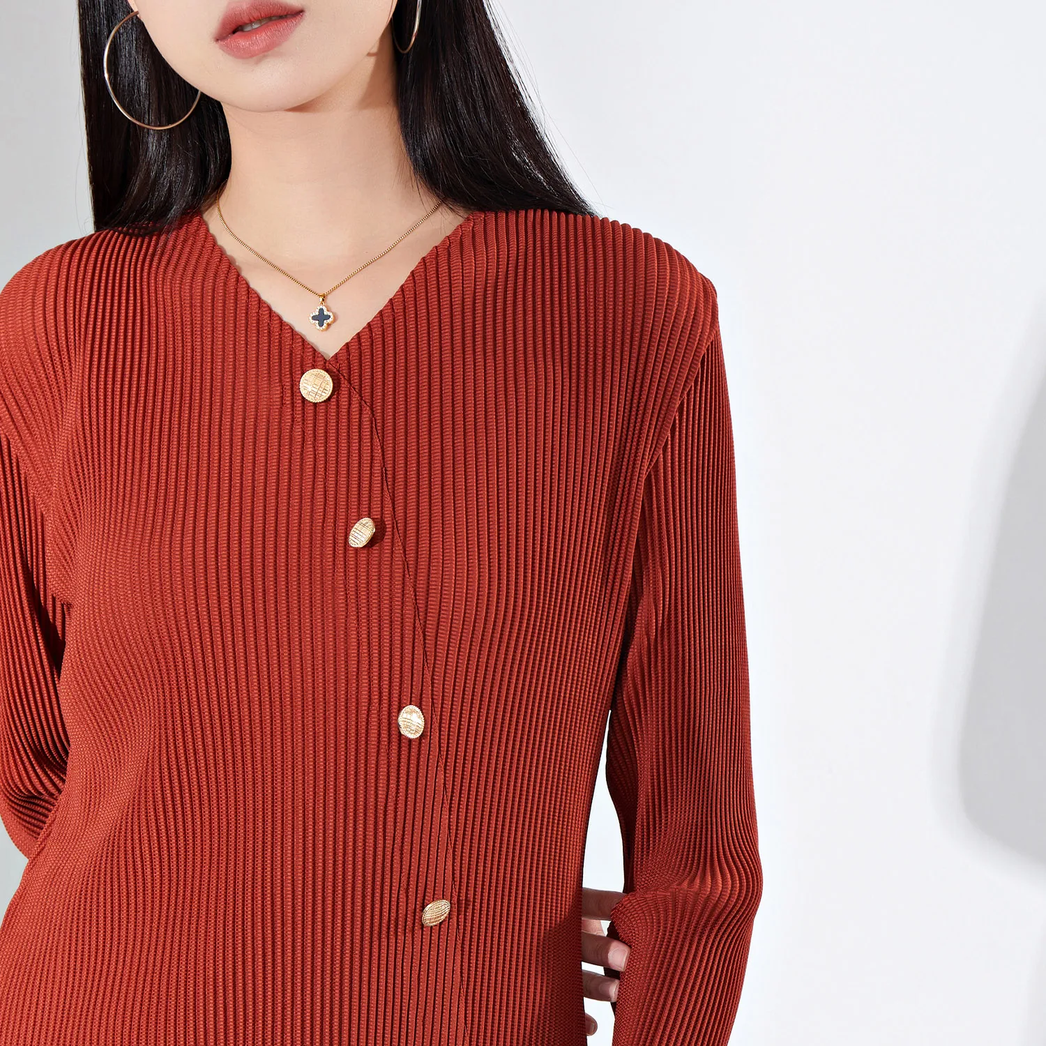 Women's V-Neck Long Sleeve Top With Elastic Stretch Decorative Buttons & Miyake Pleated-Versatile Casual Chiffon Blouses Summer