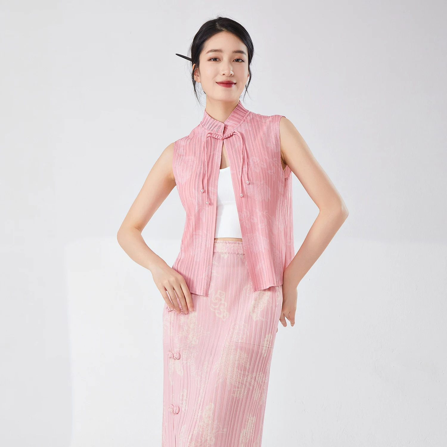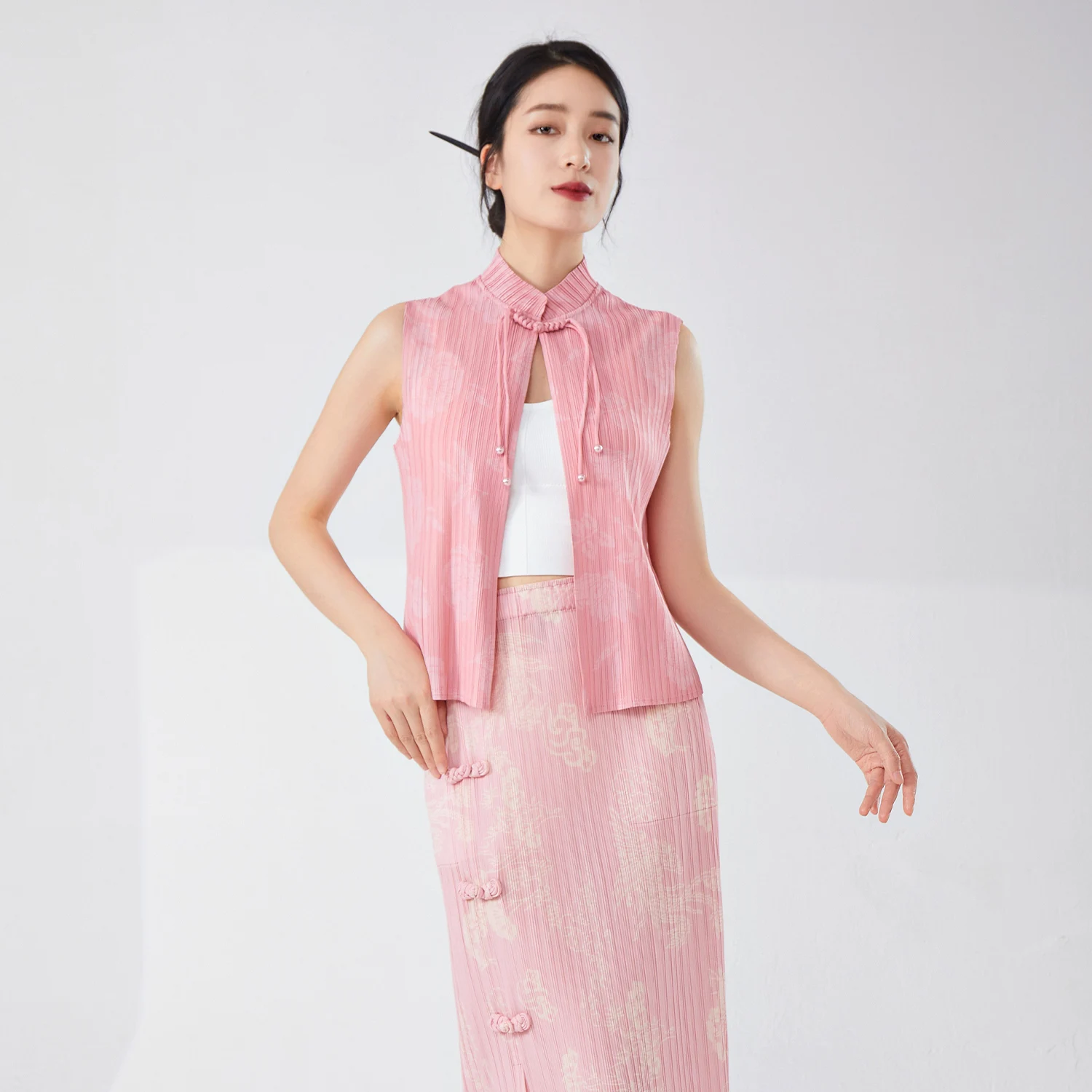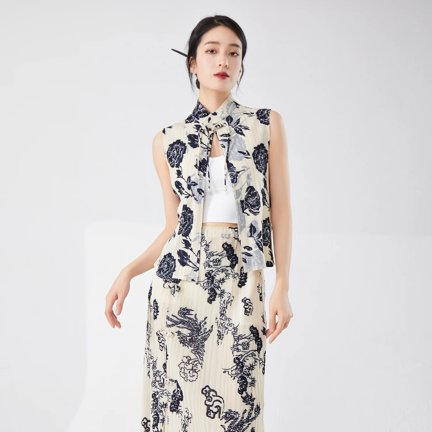 2025 Summer New Women's High Quality Vest Retro Chinese Style Casual Pleated Stand-Up Collar With Buckle Print