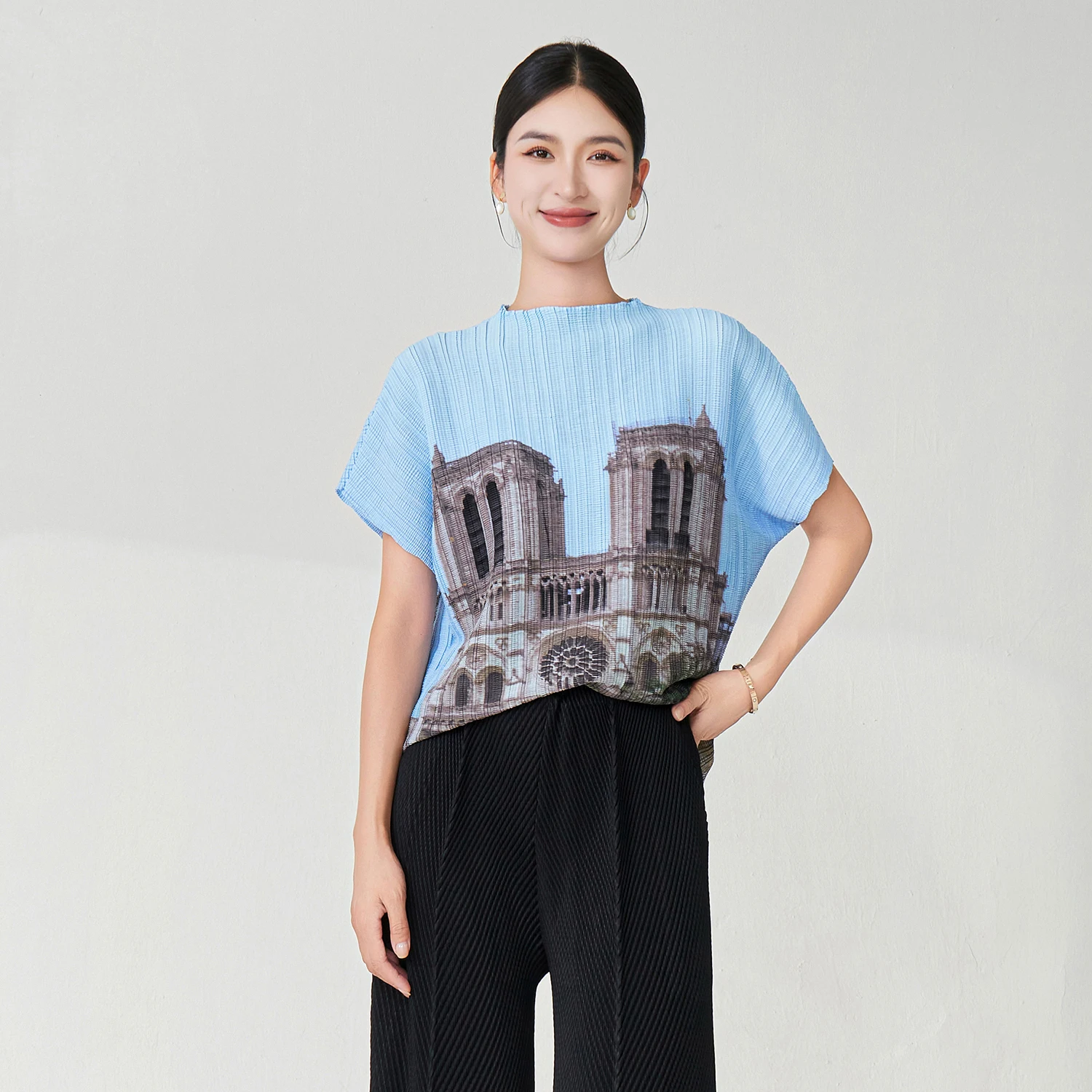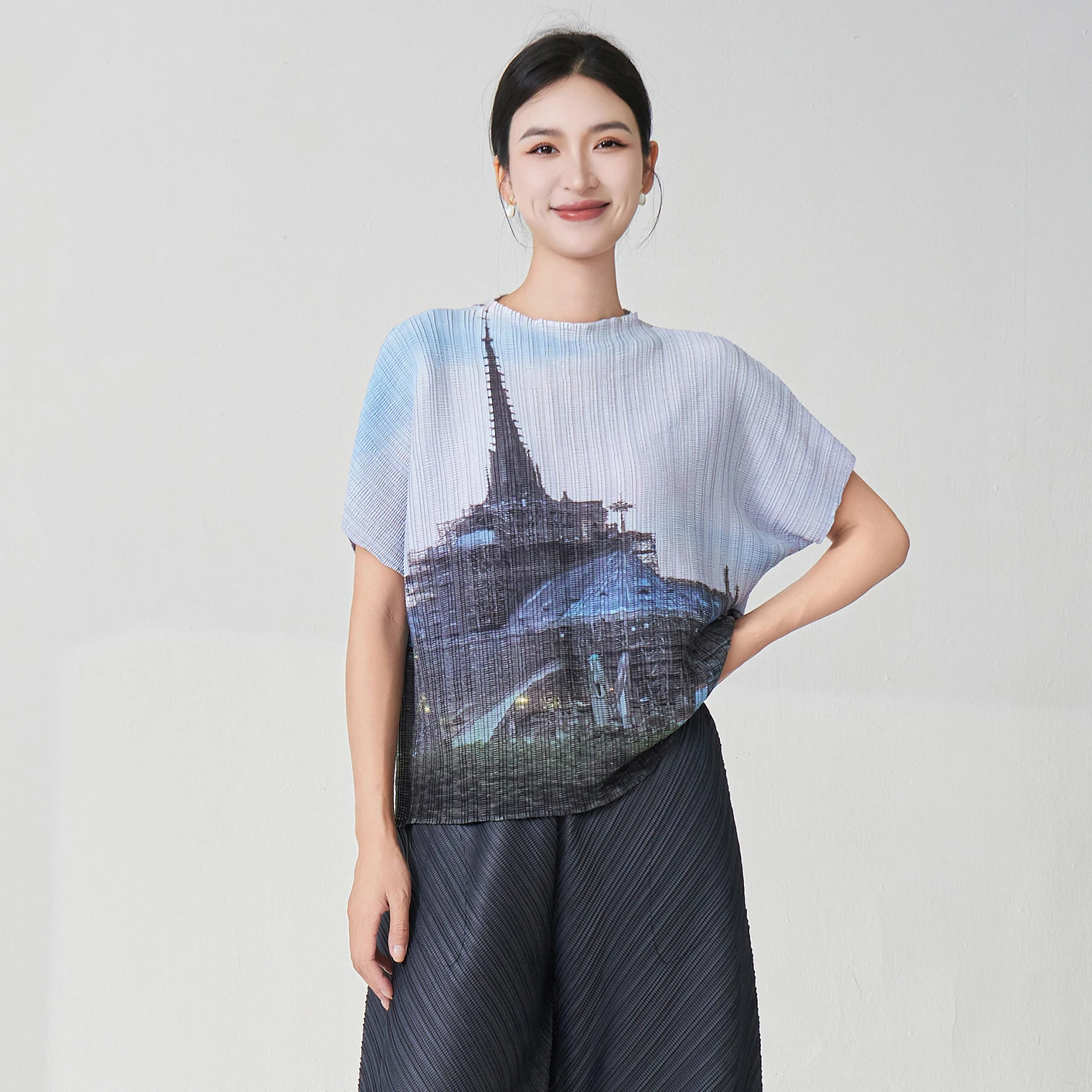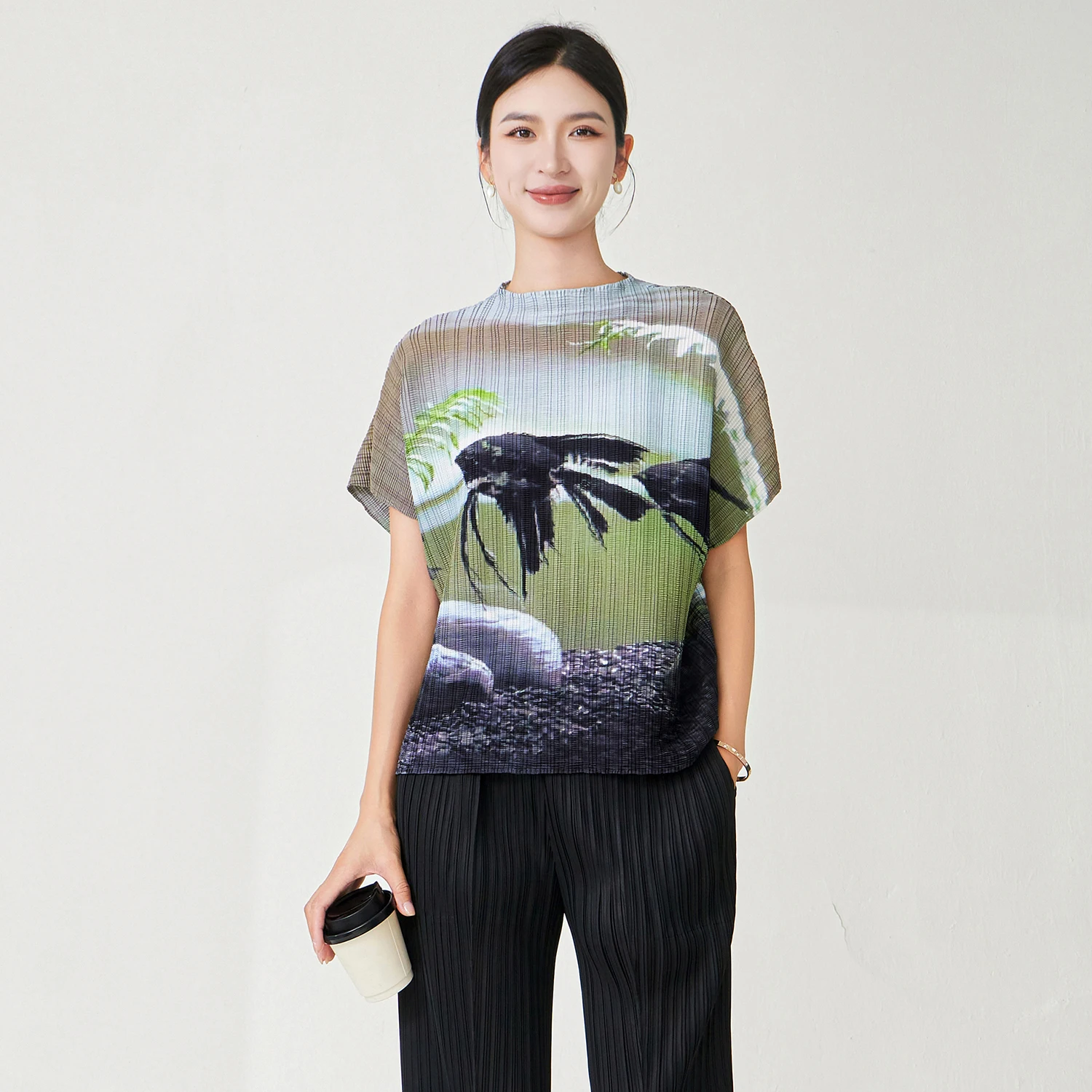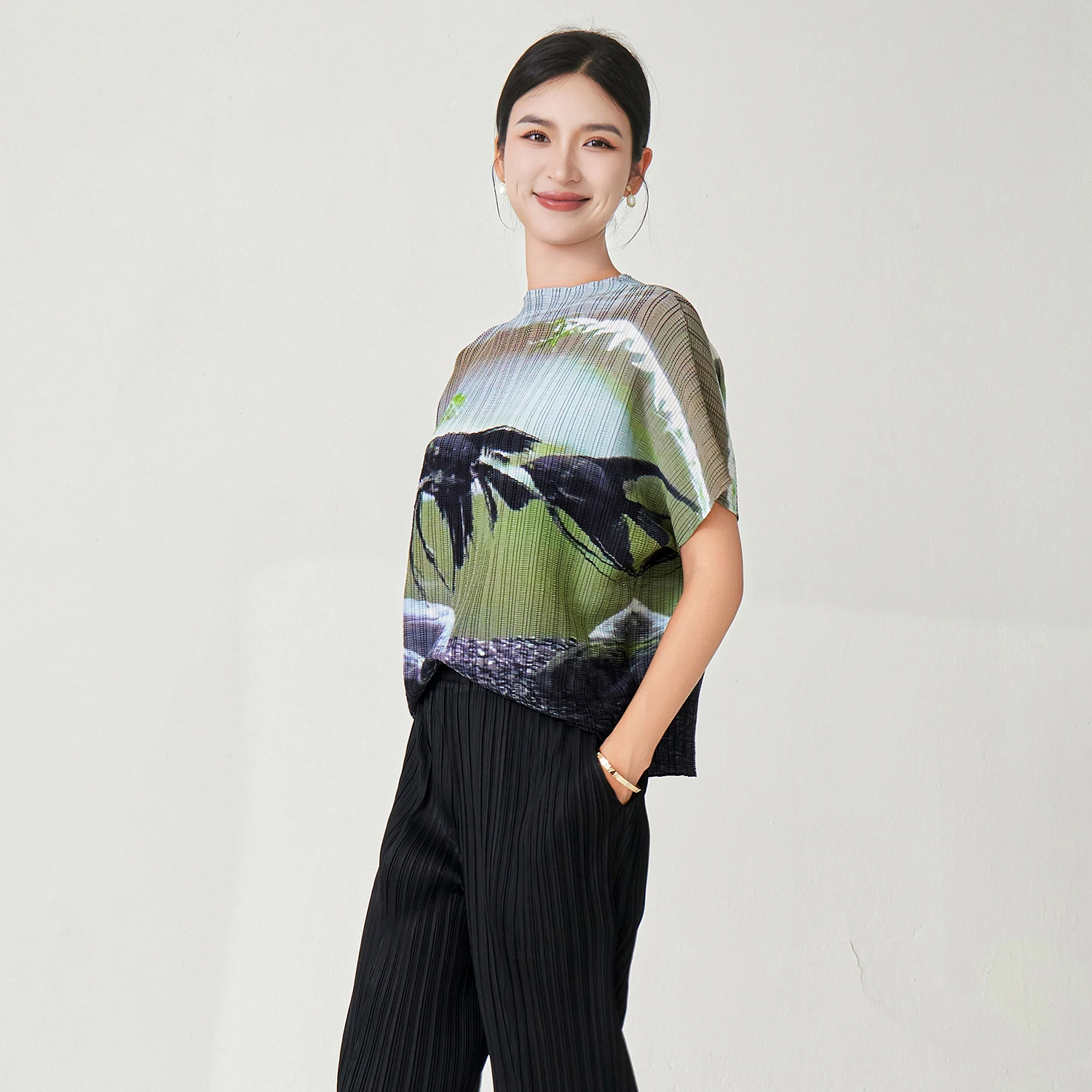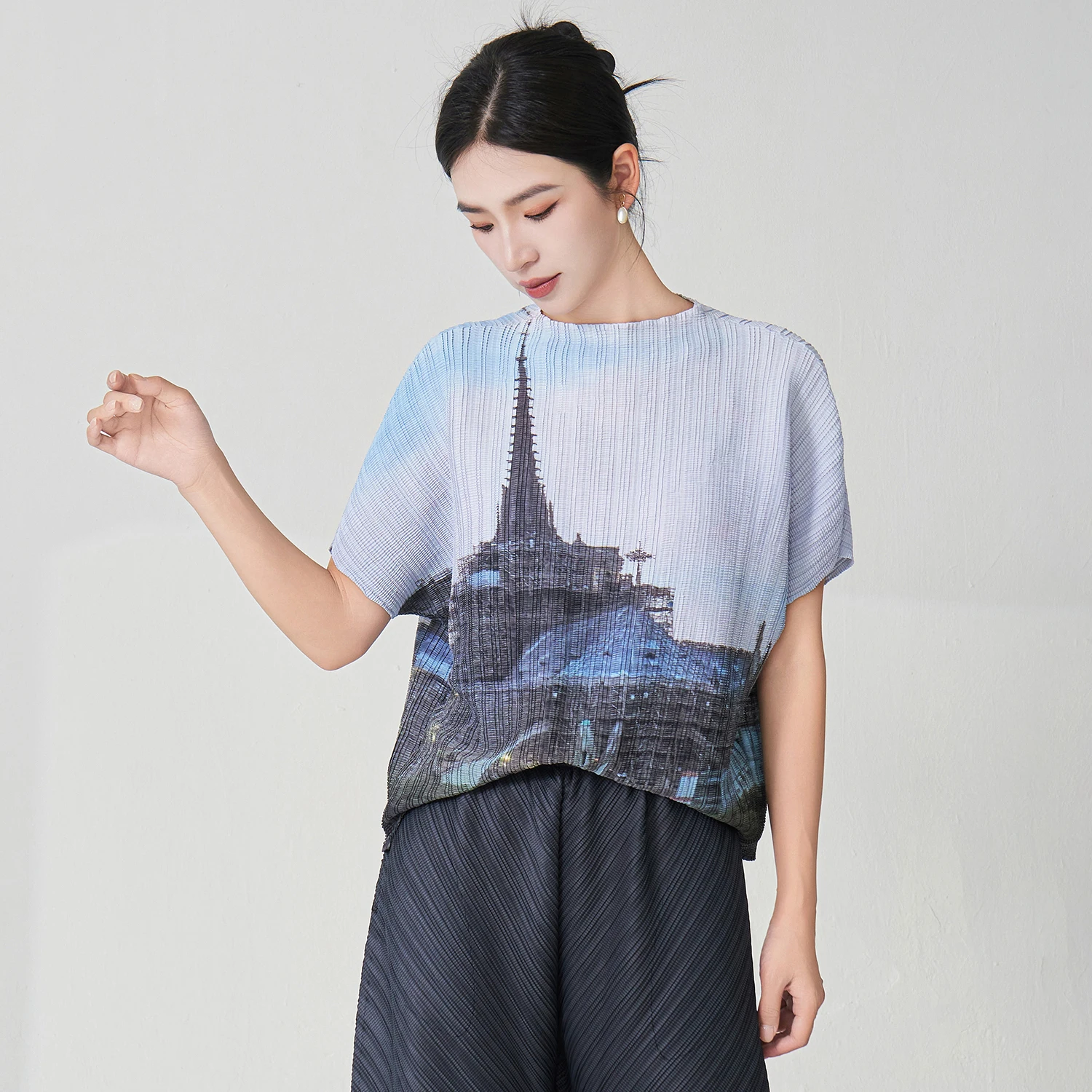 Wholesale Smocked Clothing Women's Fashion Tops Summer Stretch Print Top Miyake Pleated Tops Casual T-shirts