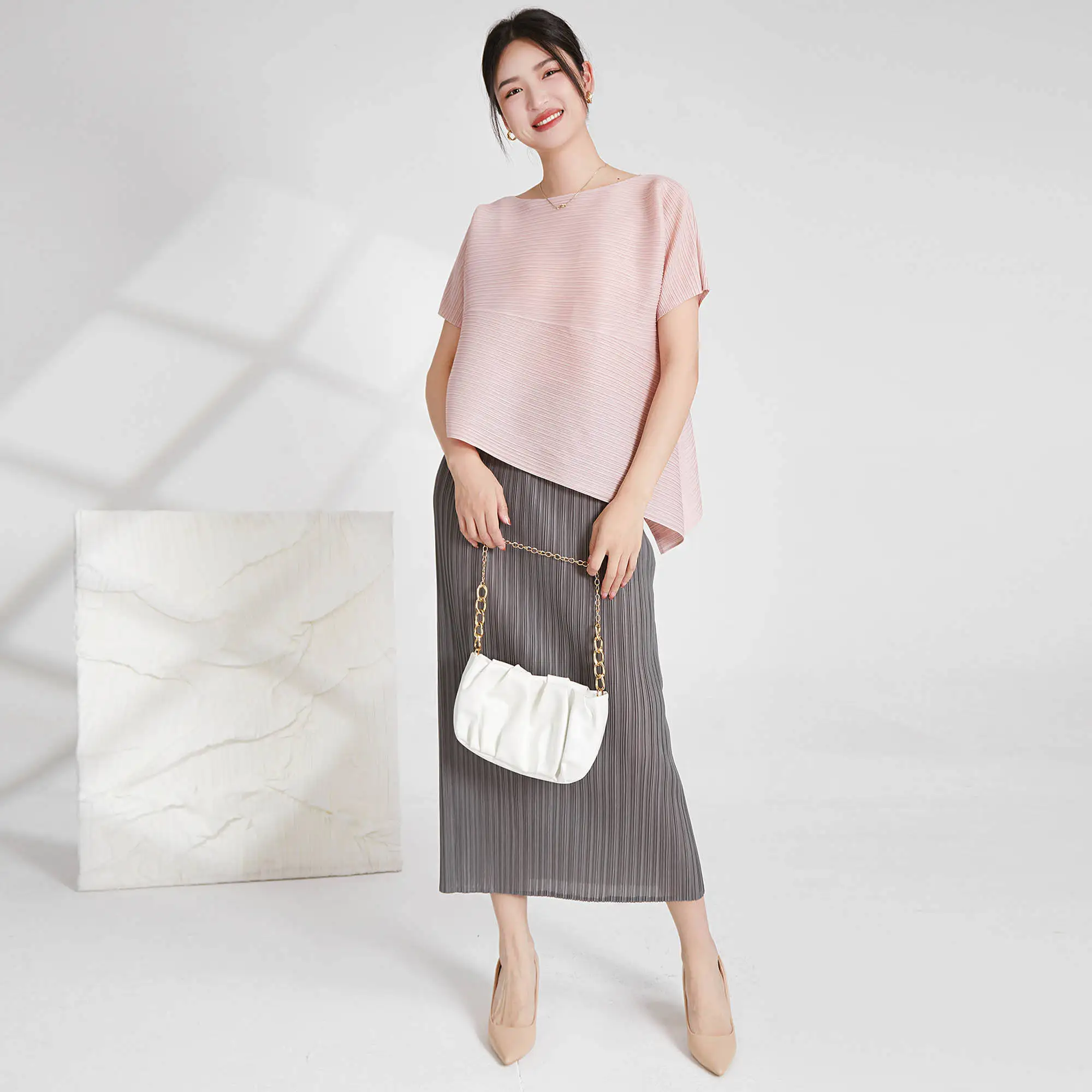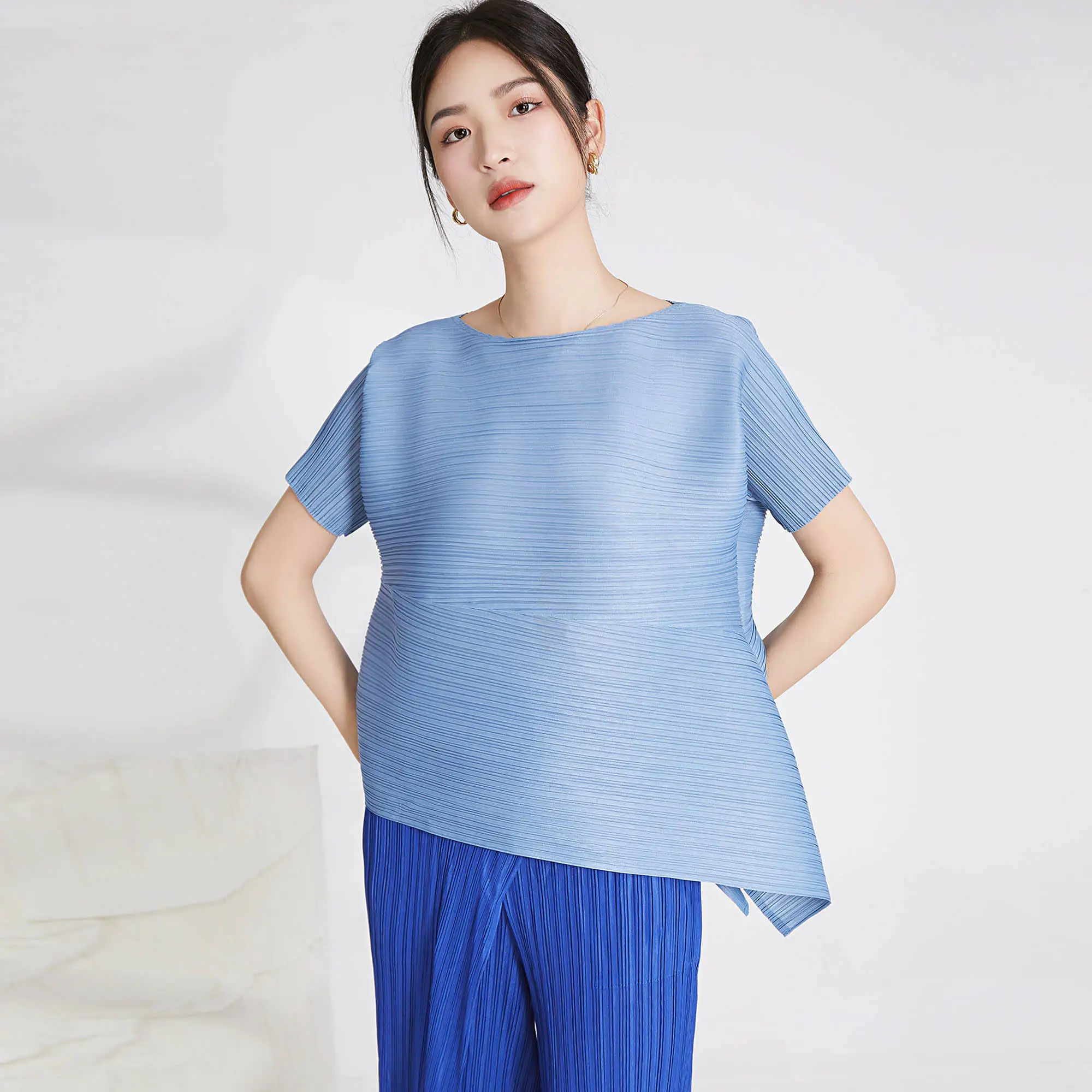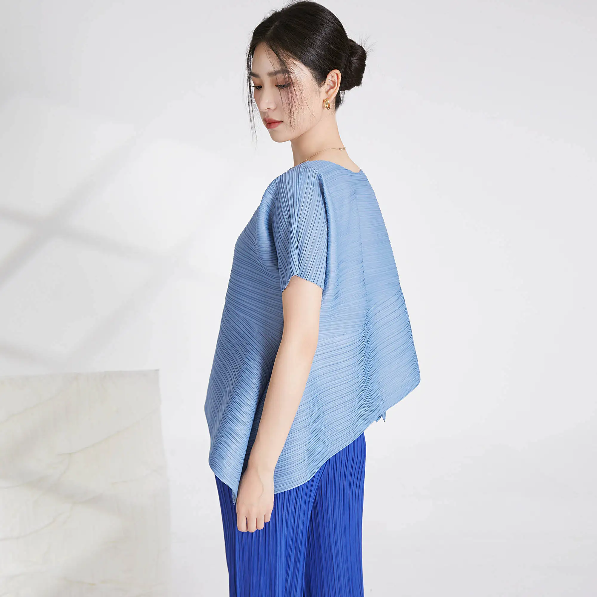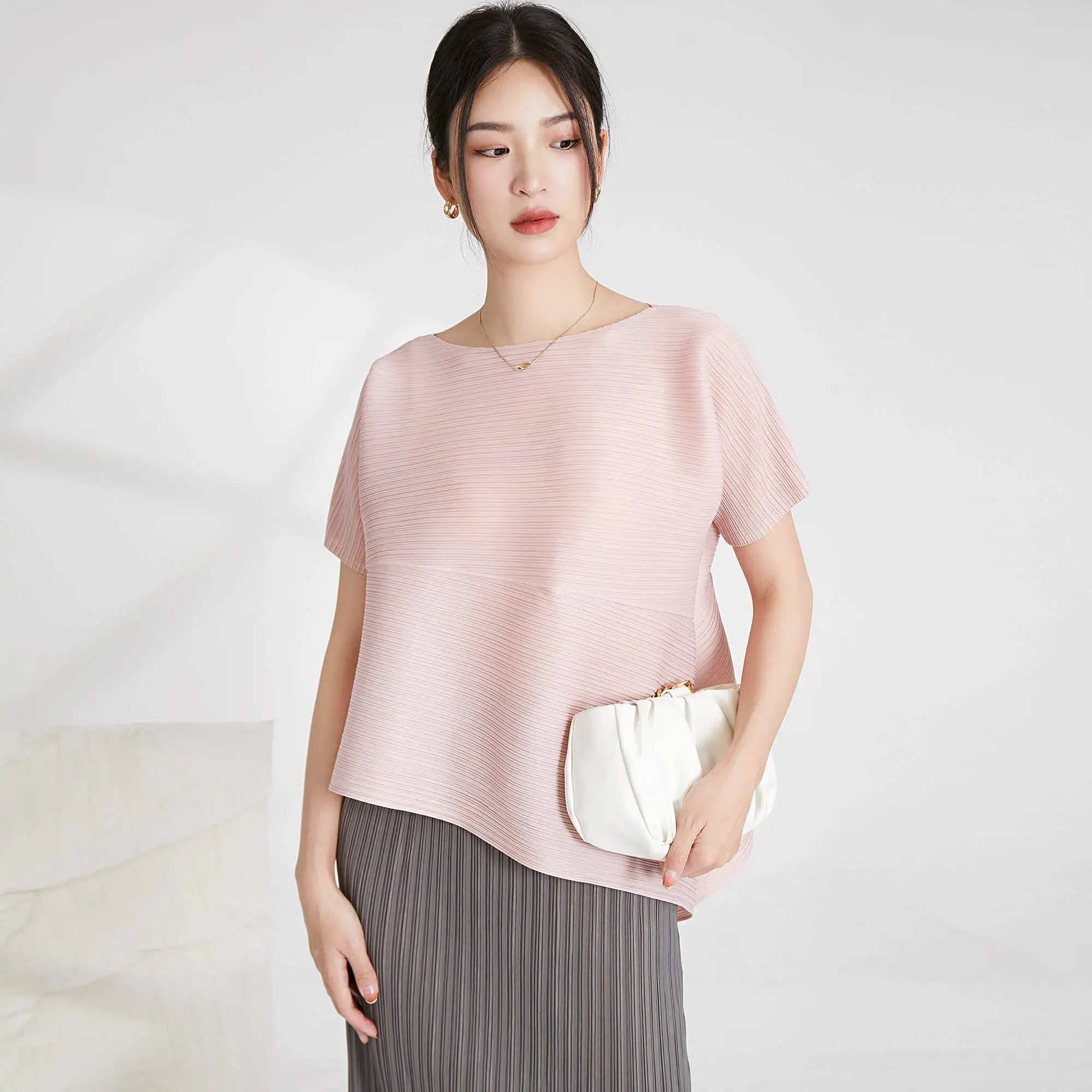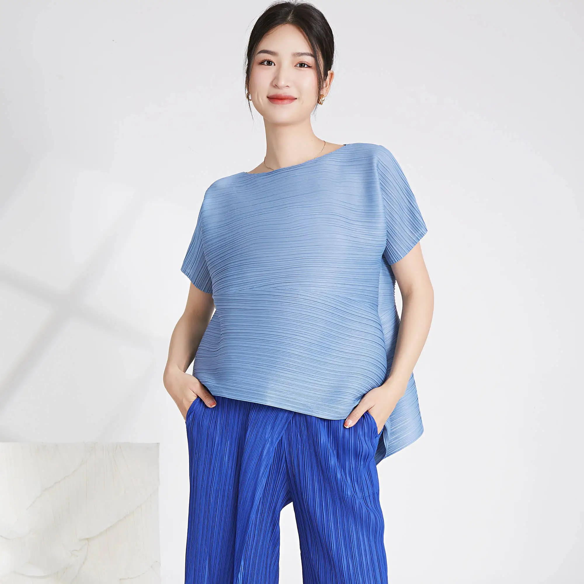 Miyake Women's Pleated T-Shirt Short Sleeve Casual Style Loose Fashionable Pleated Shirt With Printed Decoration for Summer