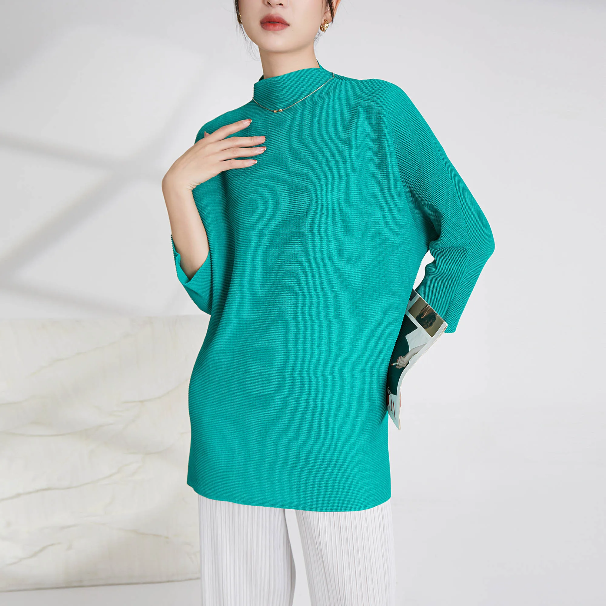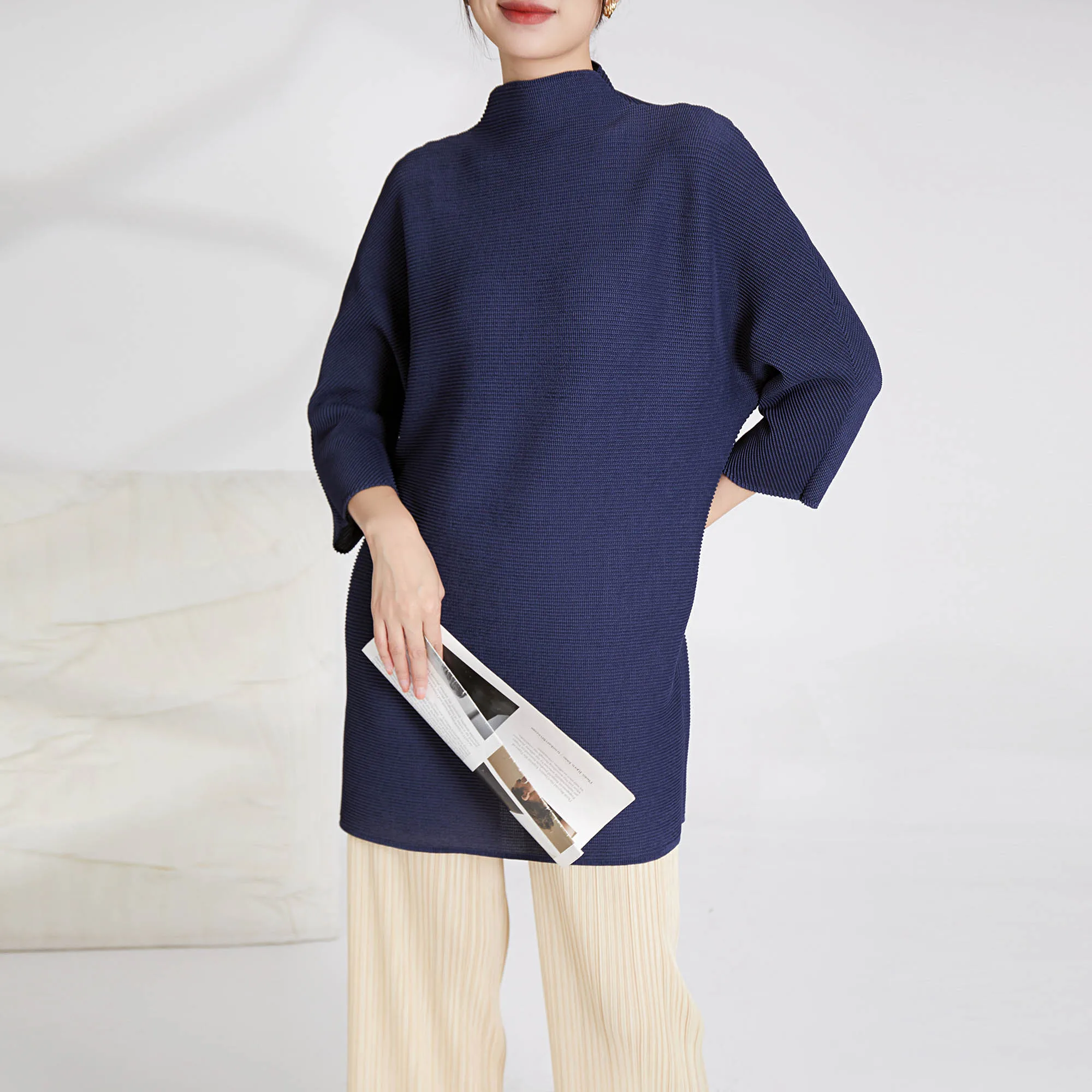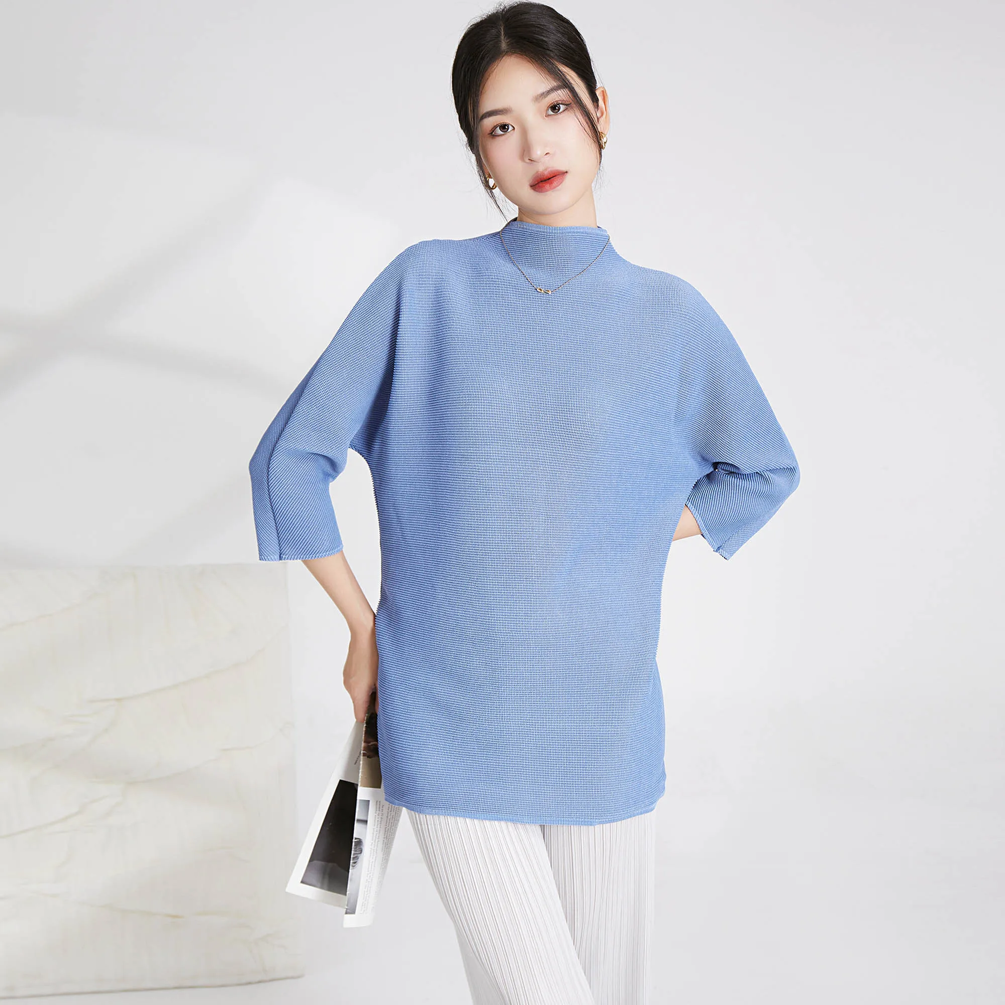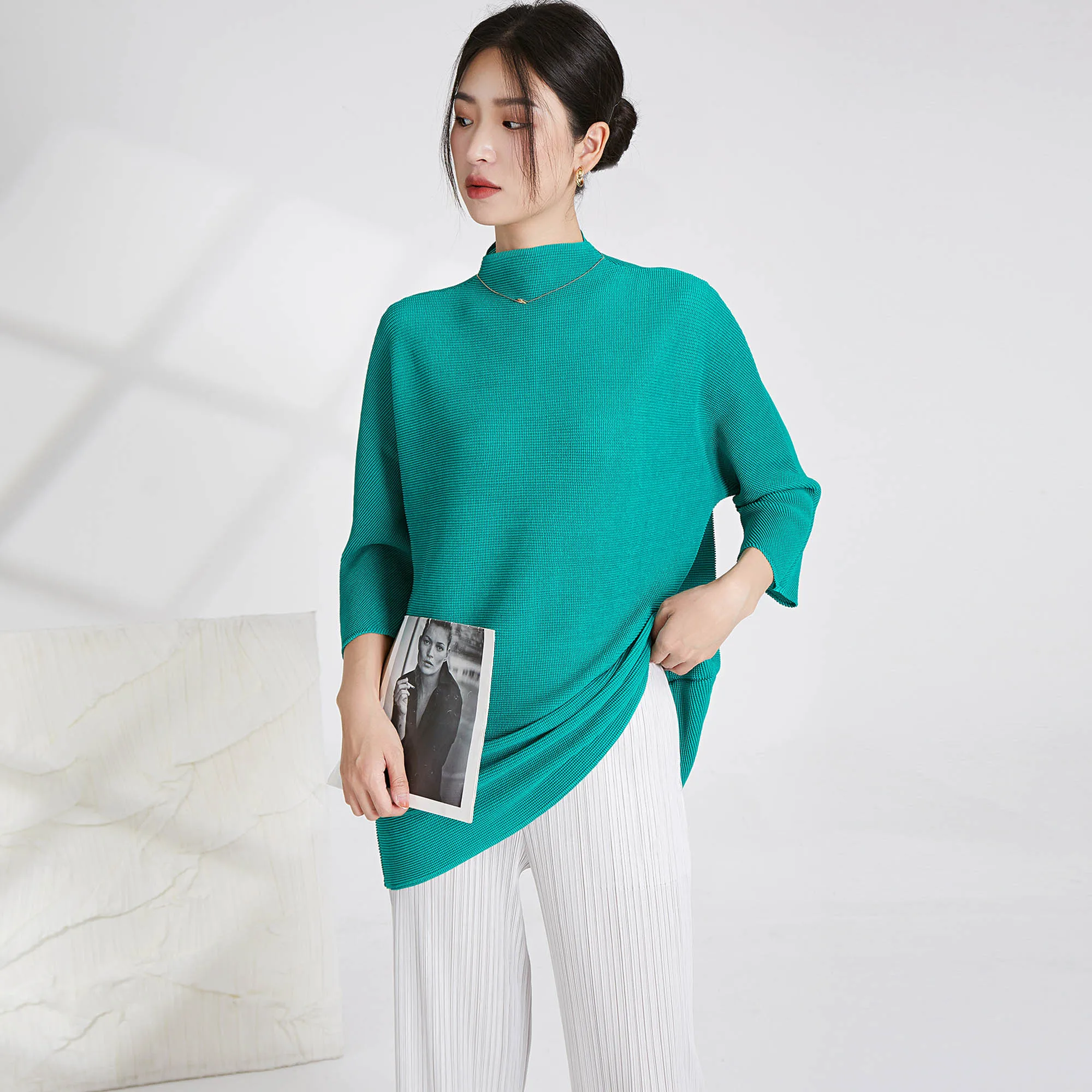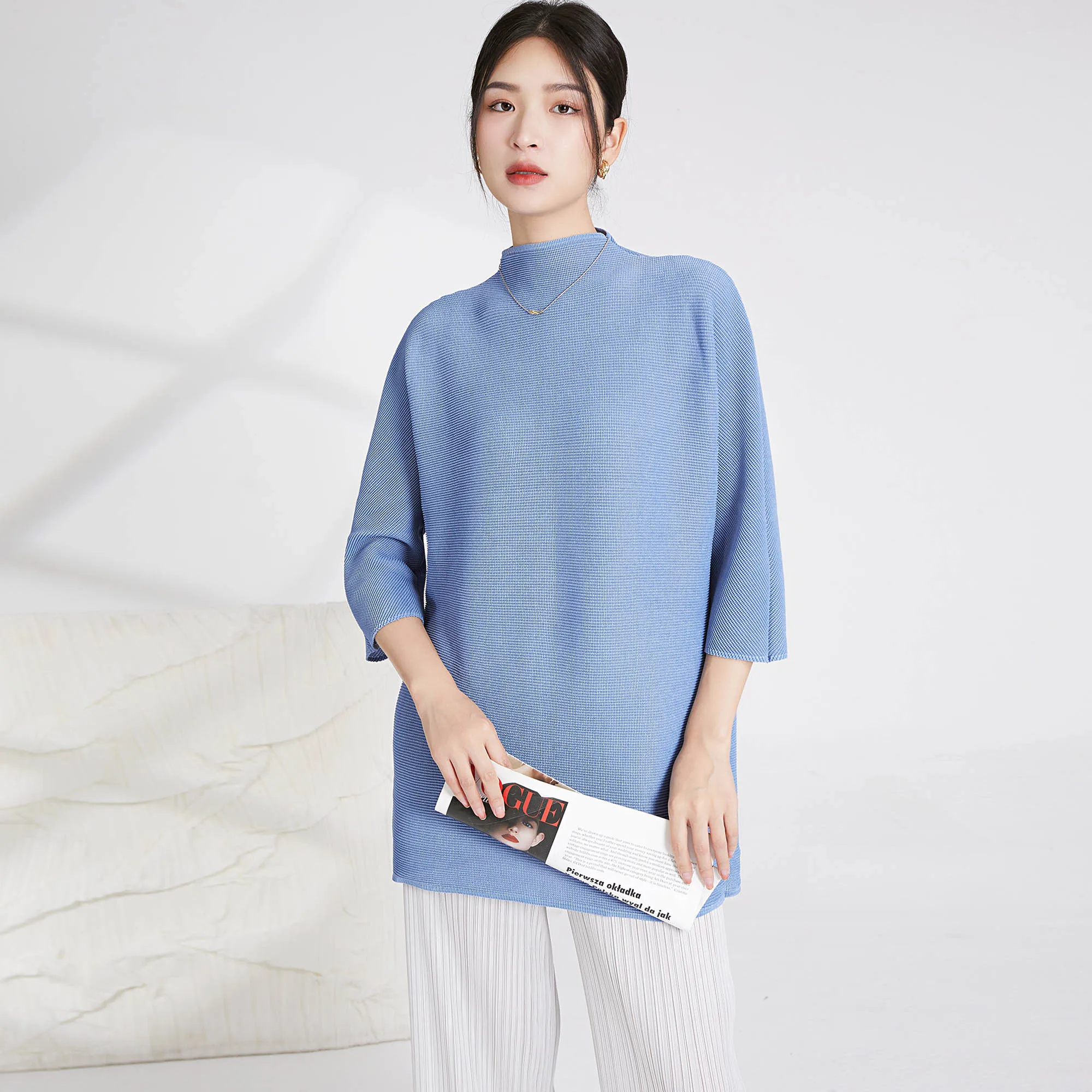 Miyake Women's Long Sleeve Shirt Casual Western Style Loose Pleated Polyester Top With Printed Decoration