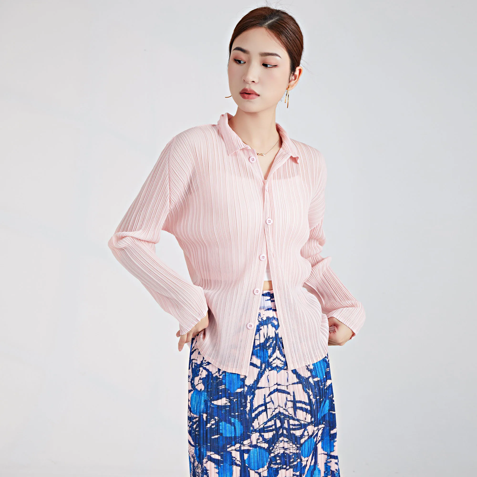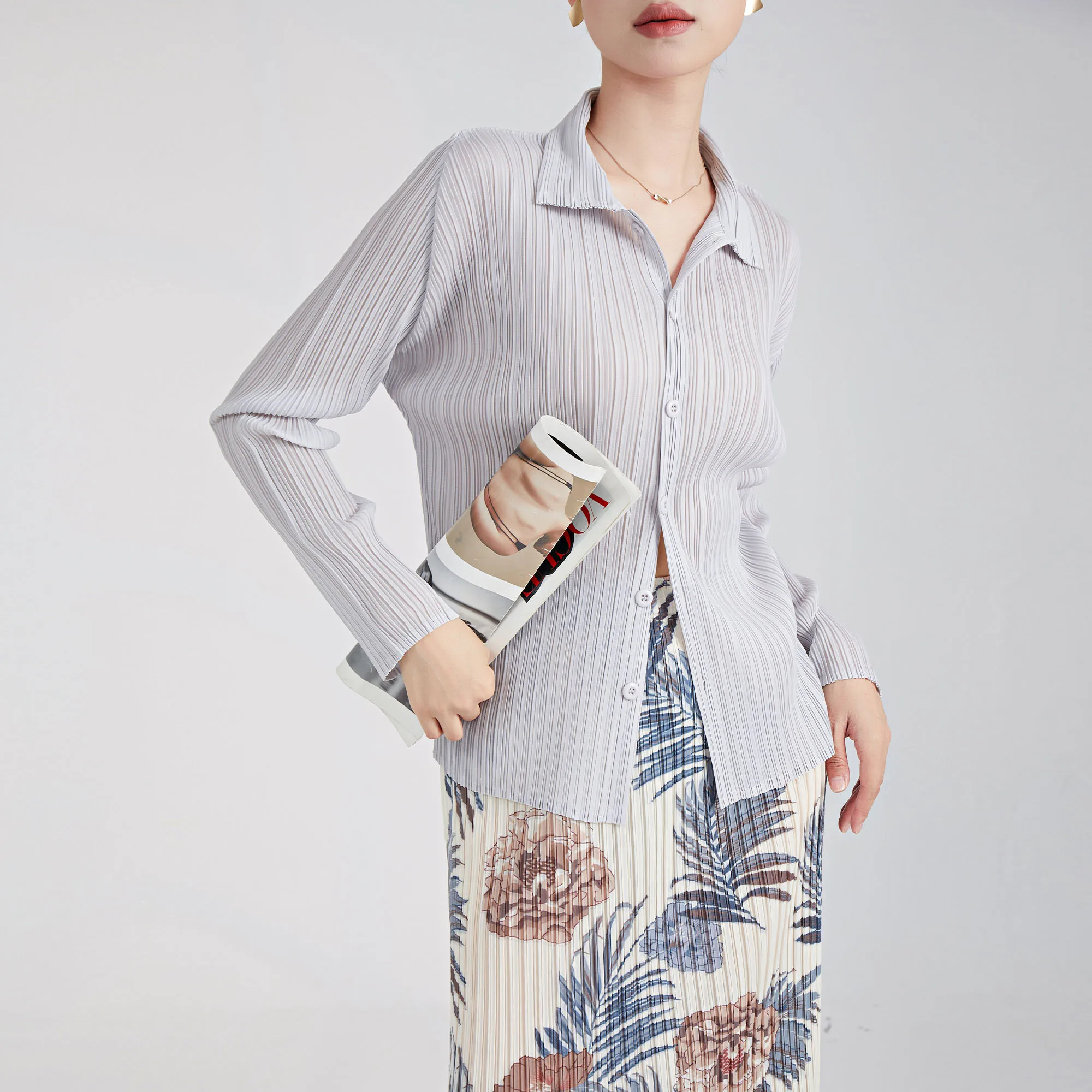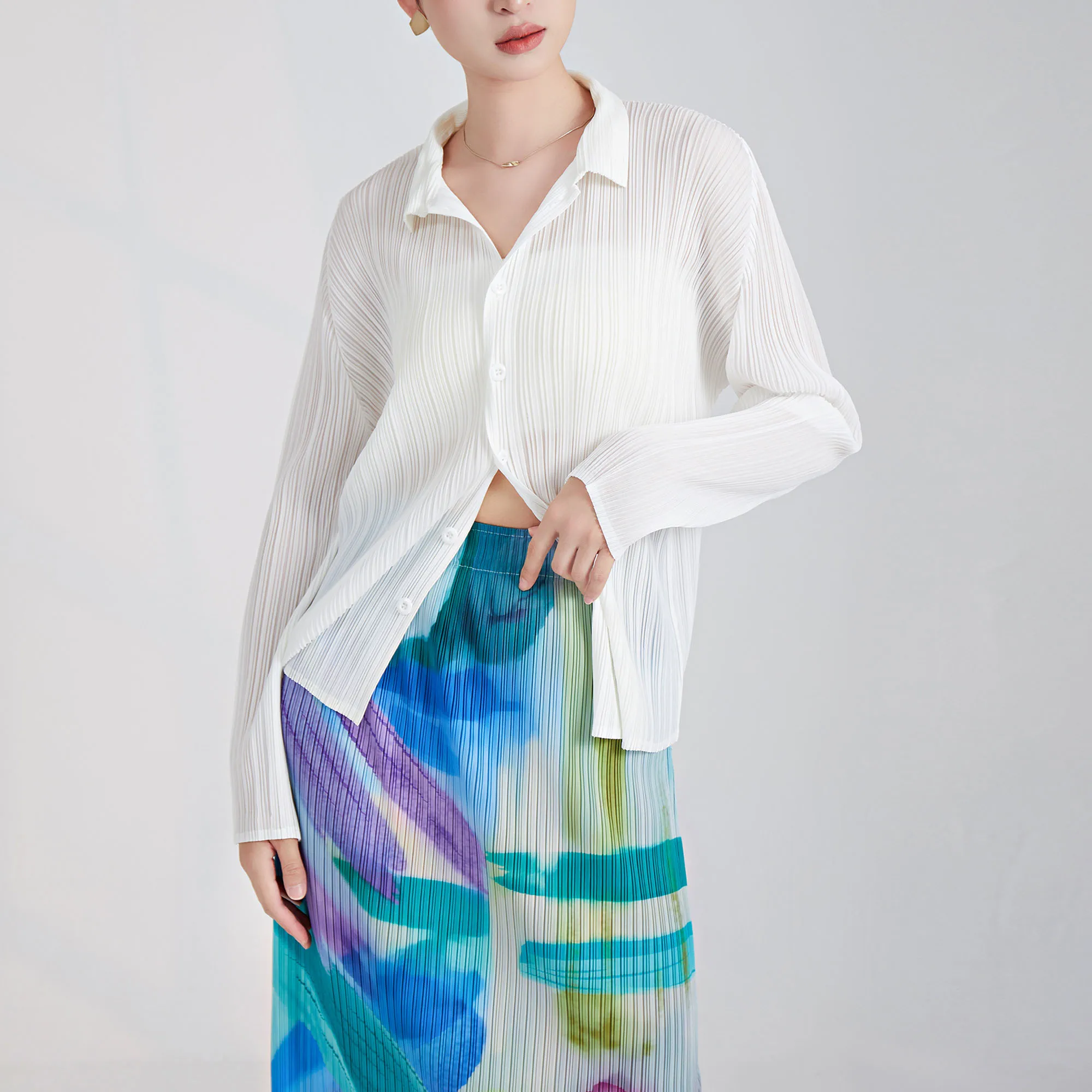 2025 Summer Latest Design Korea Women Shirt Pleated Top Ladies Long Sleeve Shirt Clothing Casual Style Loose Pleated Shirt