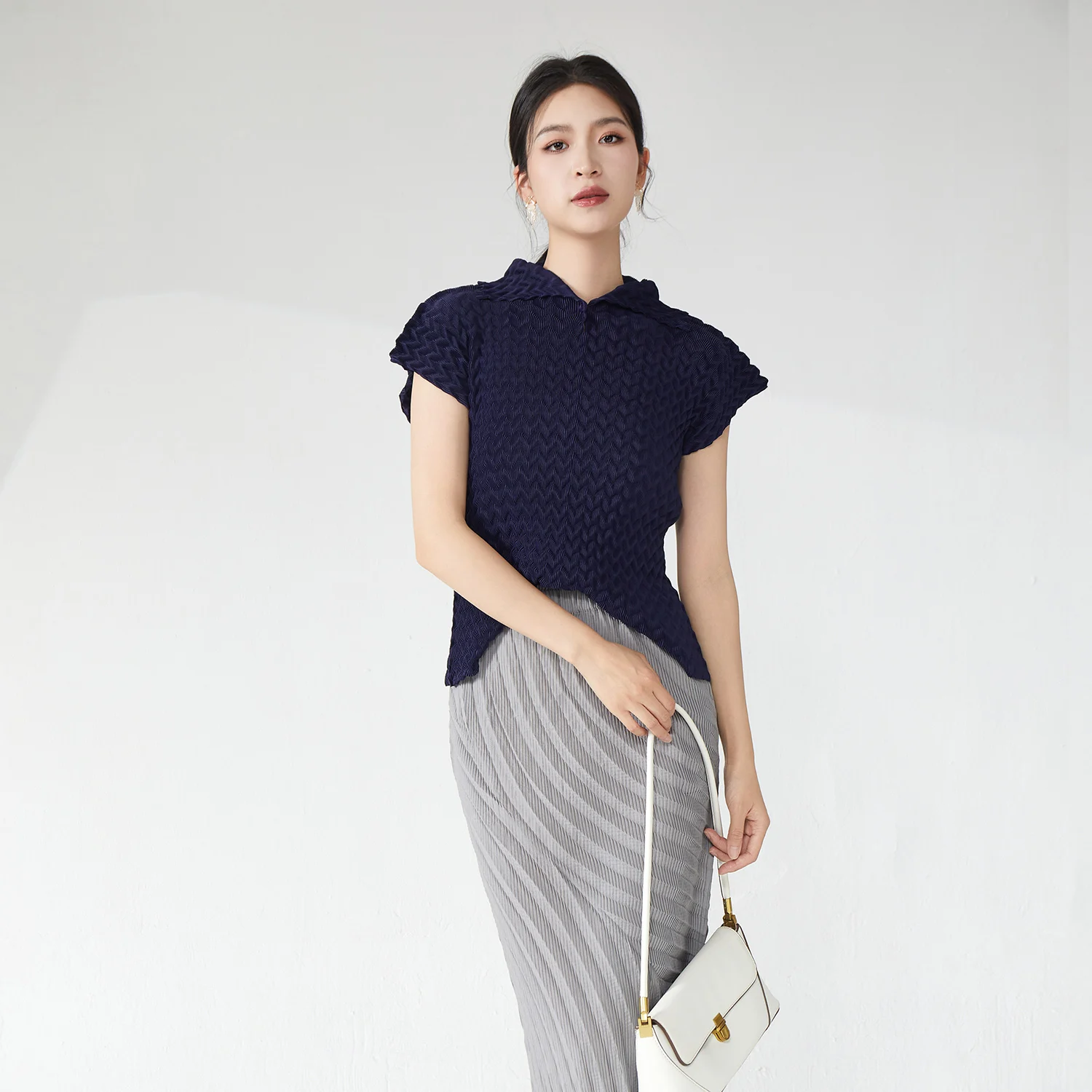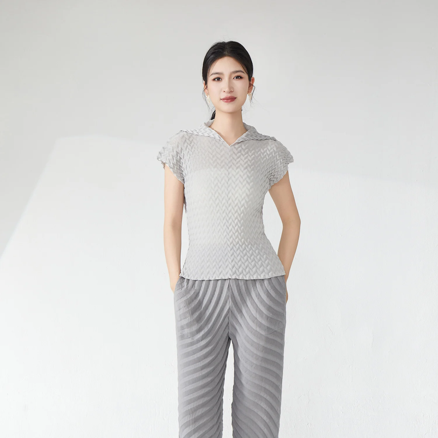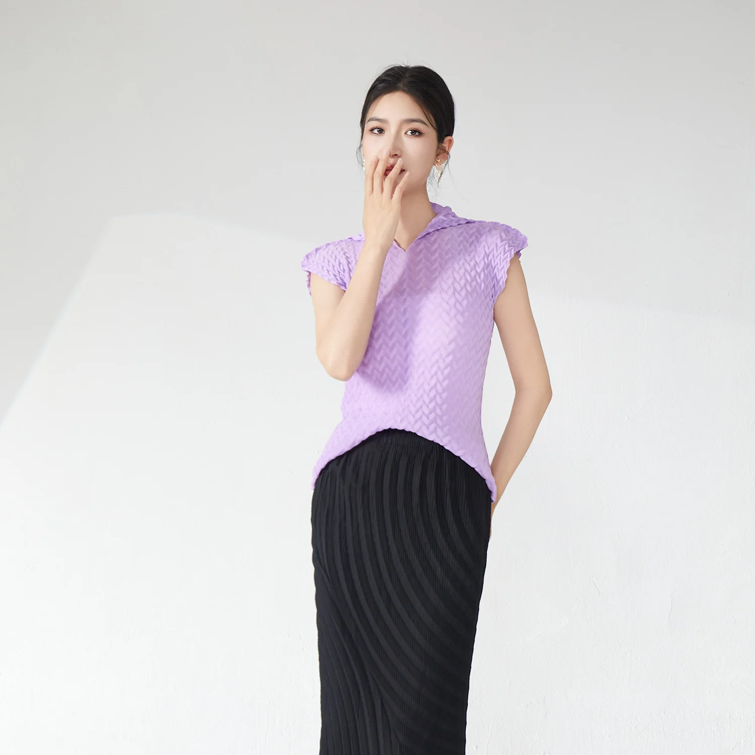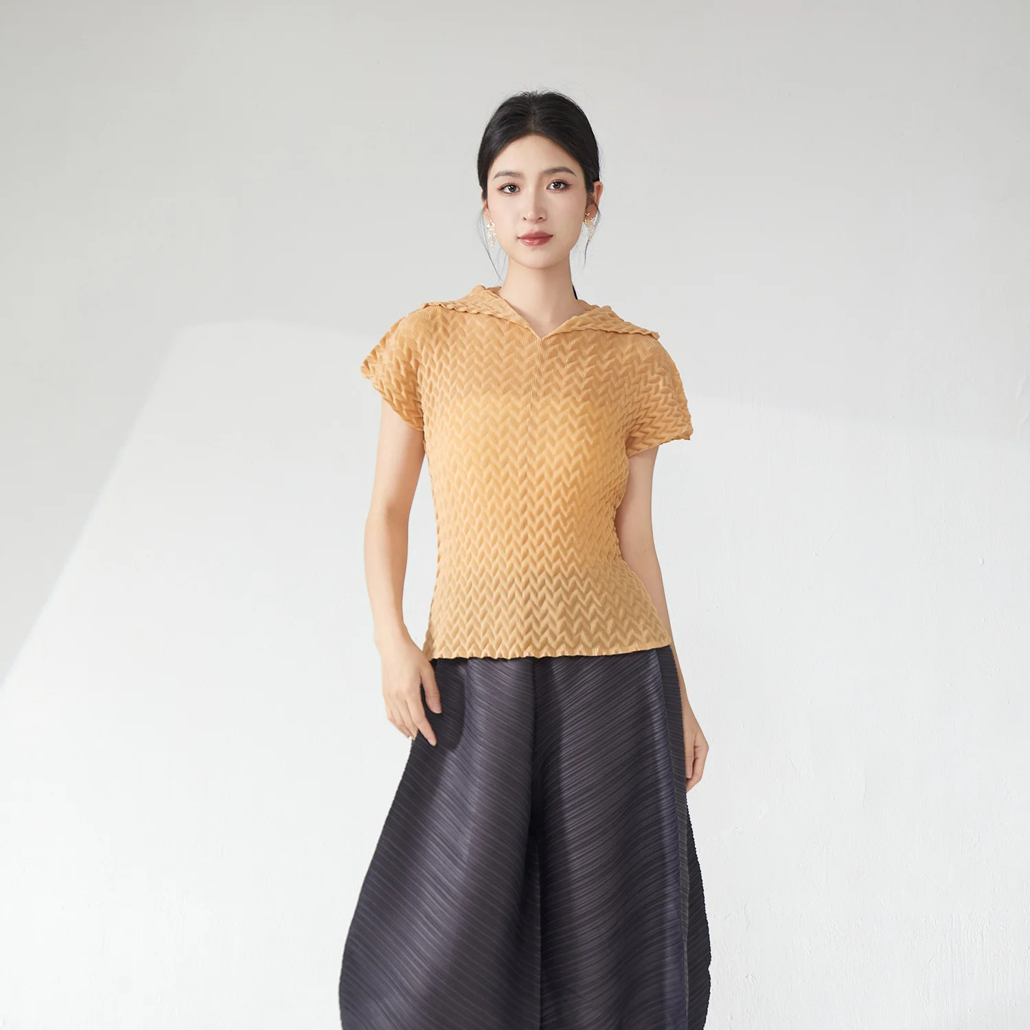 Miyake Pleated Short-Sleeved Top Design 2025 Summer New Lapel Solid Color Top Ladies Elegant T-Shirt