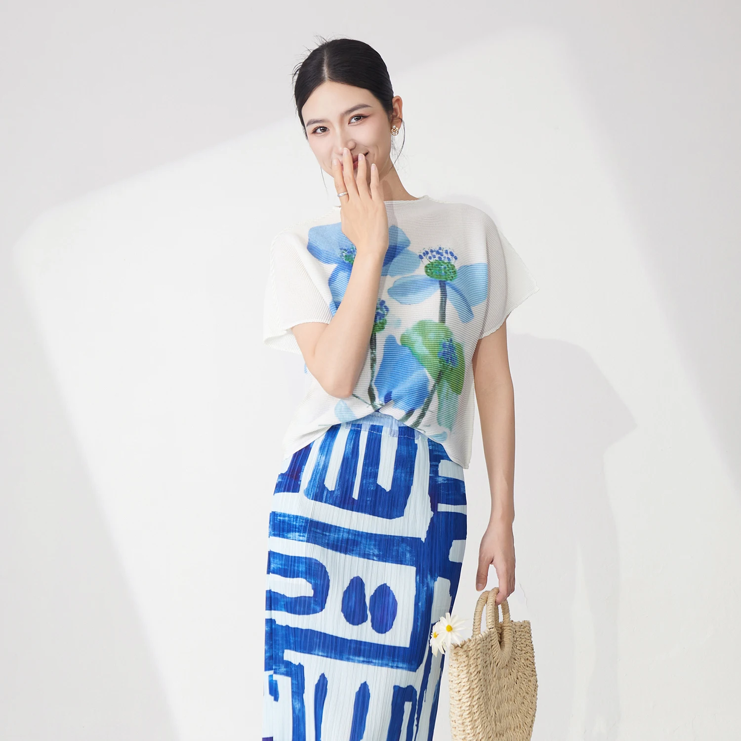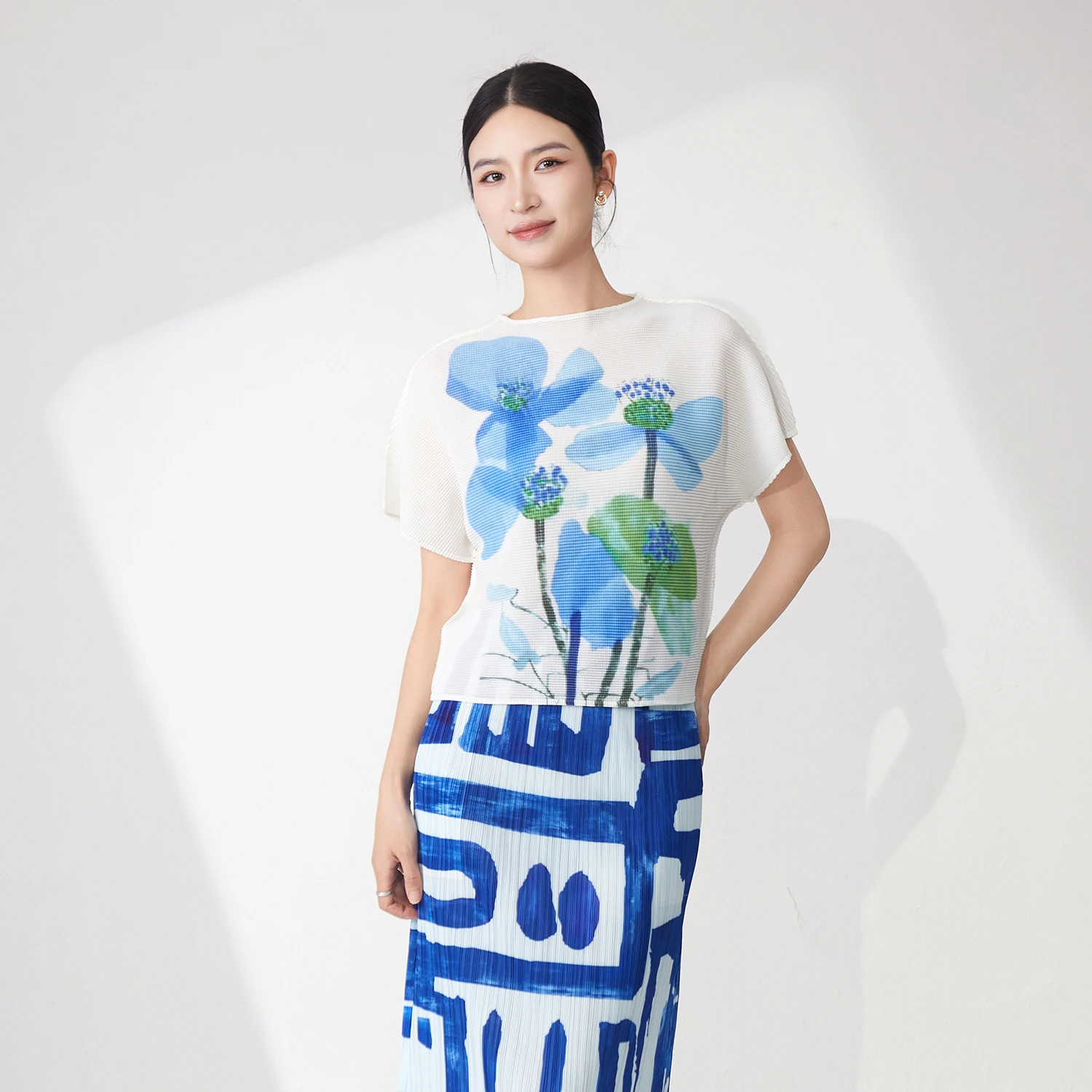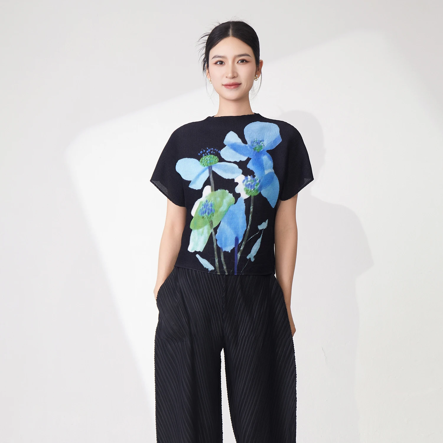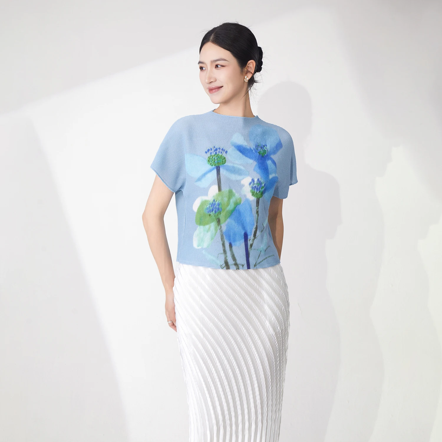 High Quality Summer Ladies Pleated Tops Stretch Casual Tops Printed Polyester Fabric Miyake T-Shirt