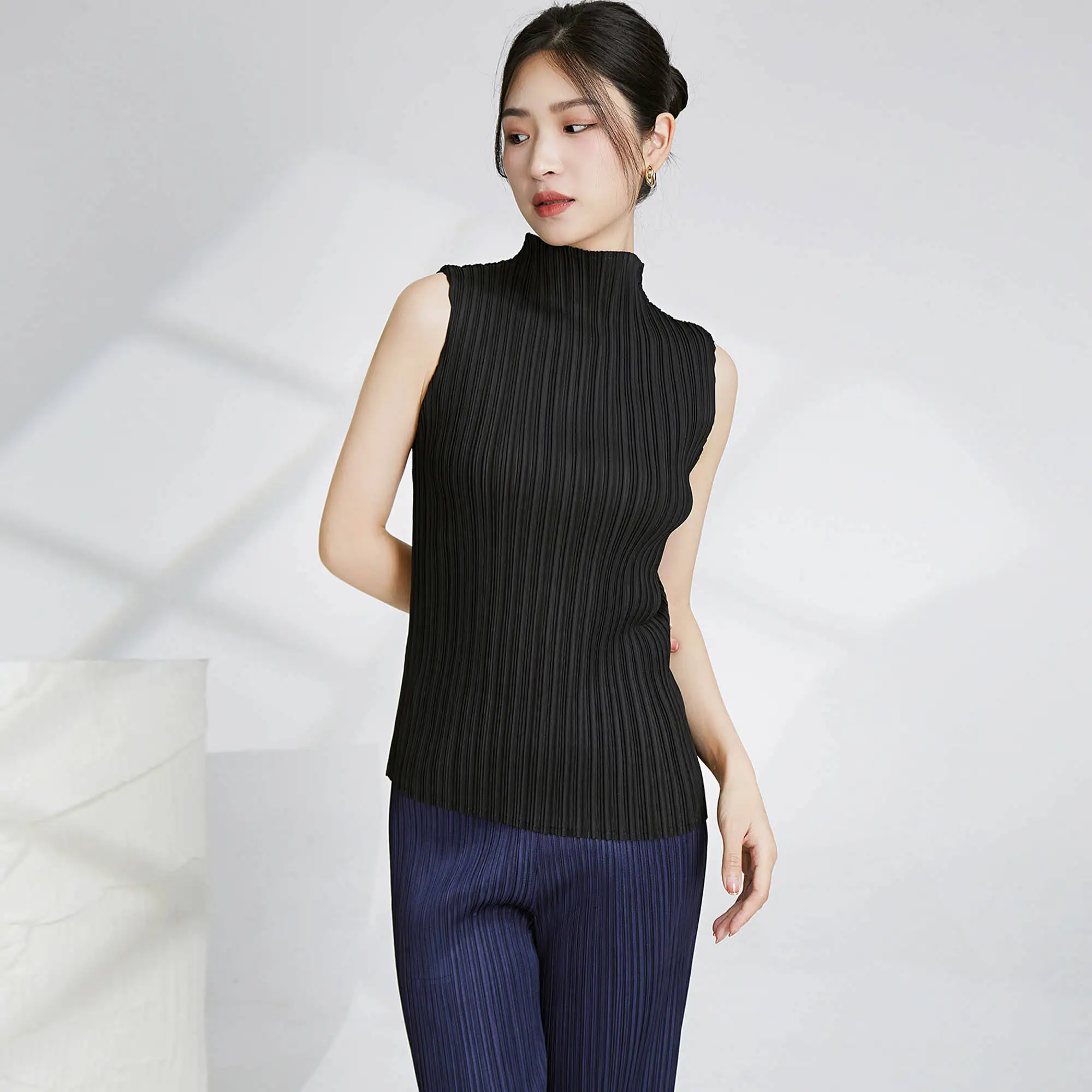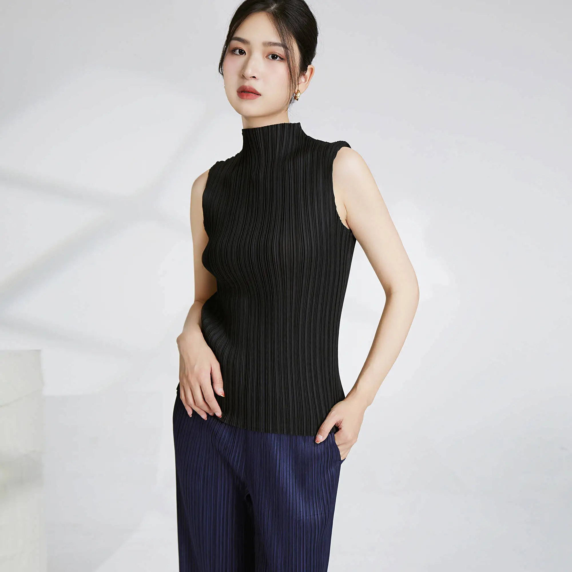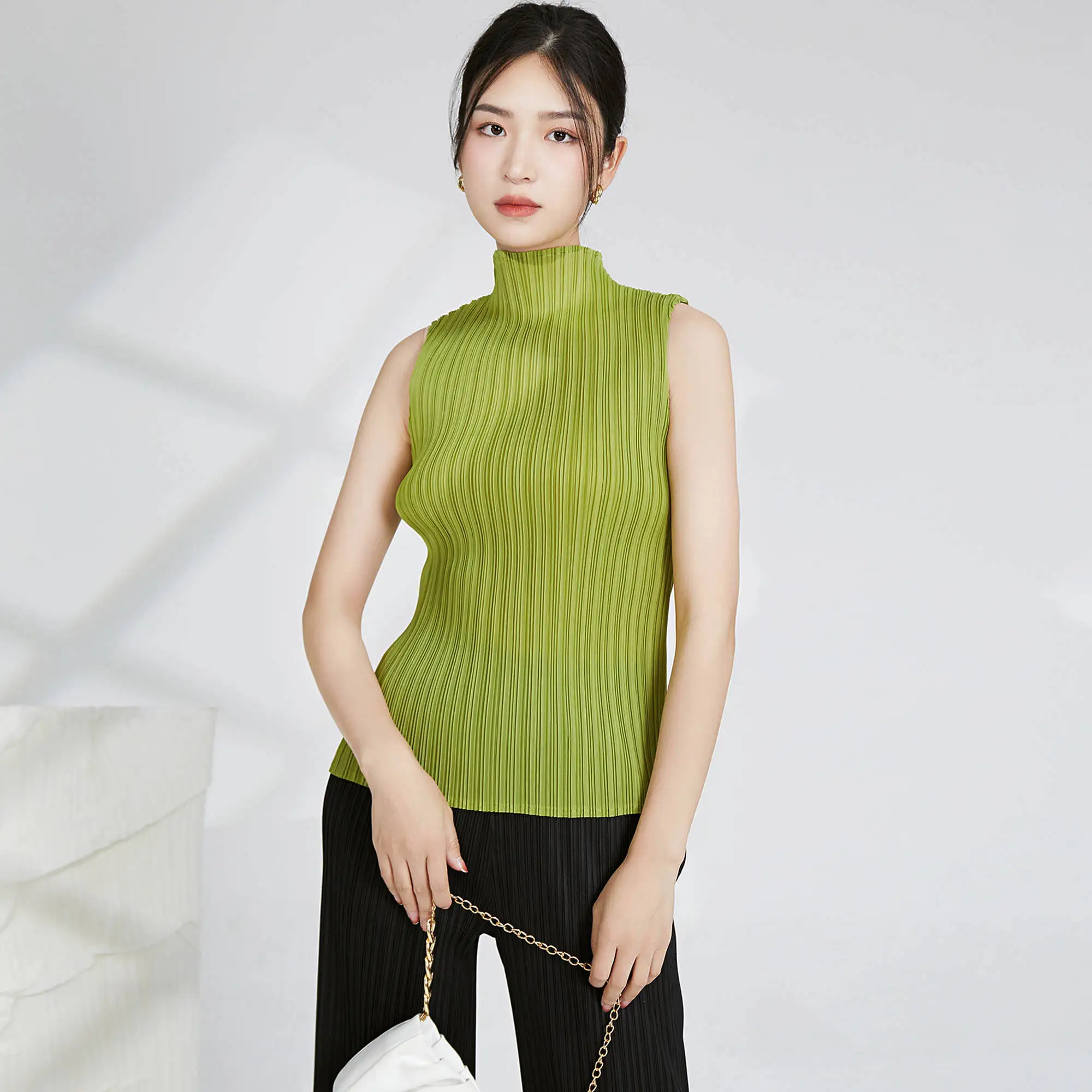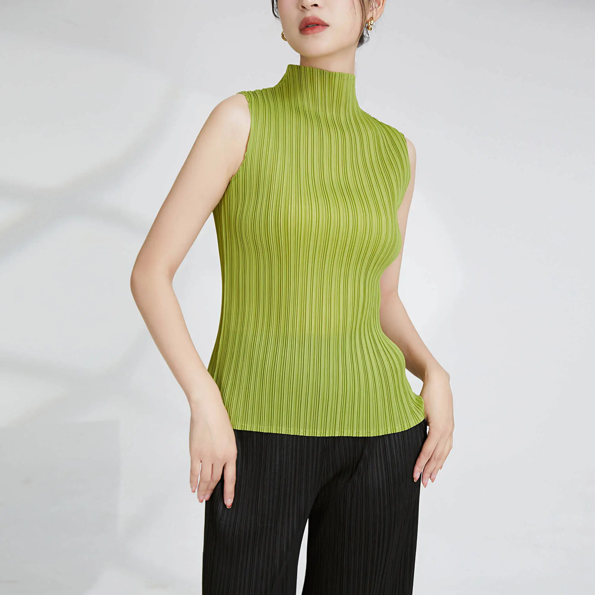 2025 Summer Women's Vest Miyake Latest Design Sleeveless Tank Top With Turtleneck Casual Style Pleated Polyester Fabric