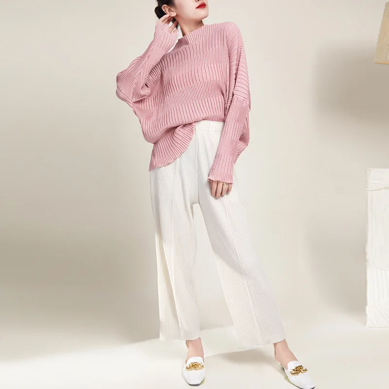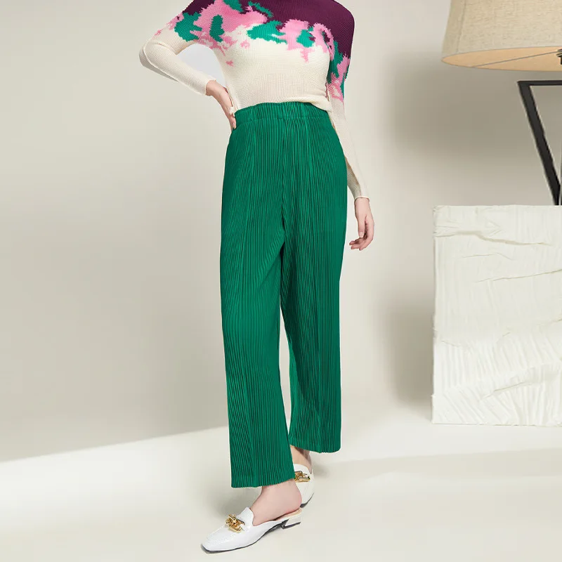 2025 Autumn Women's High-Waisted Wide-Leg Pants With Miyake Pleats Loose Fit Solid Color Straight-Leg Long Trousers