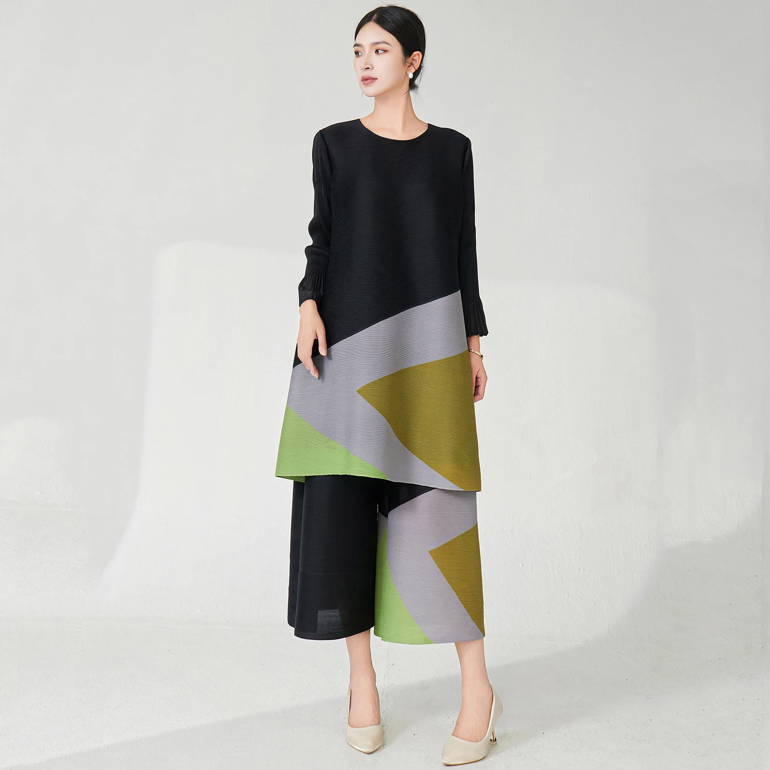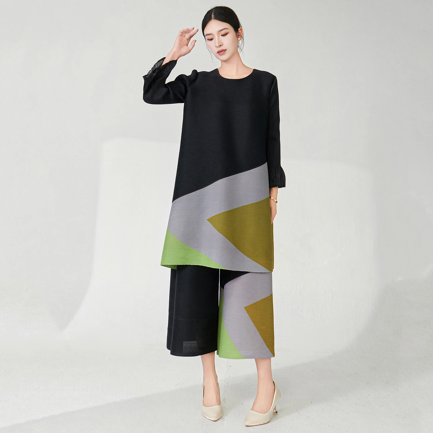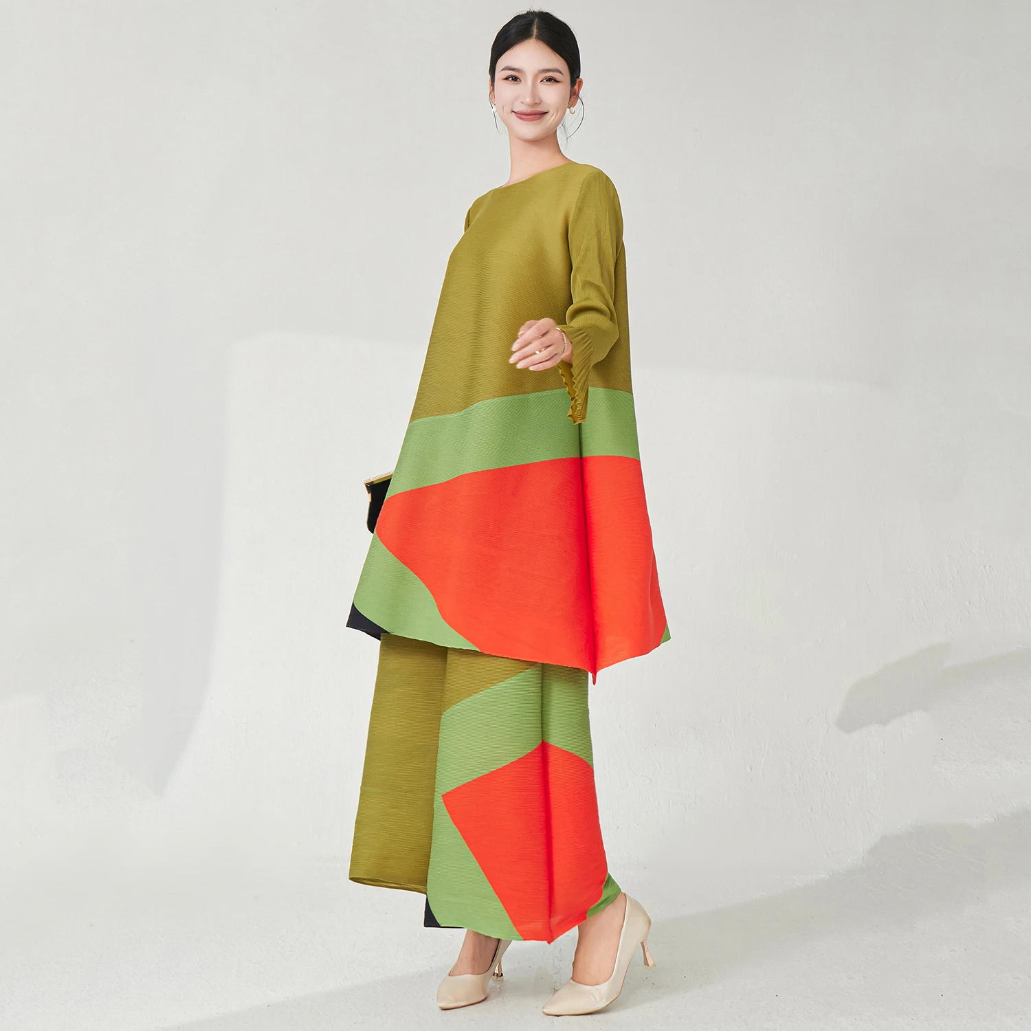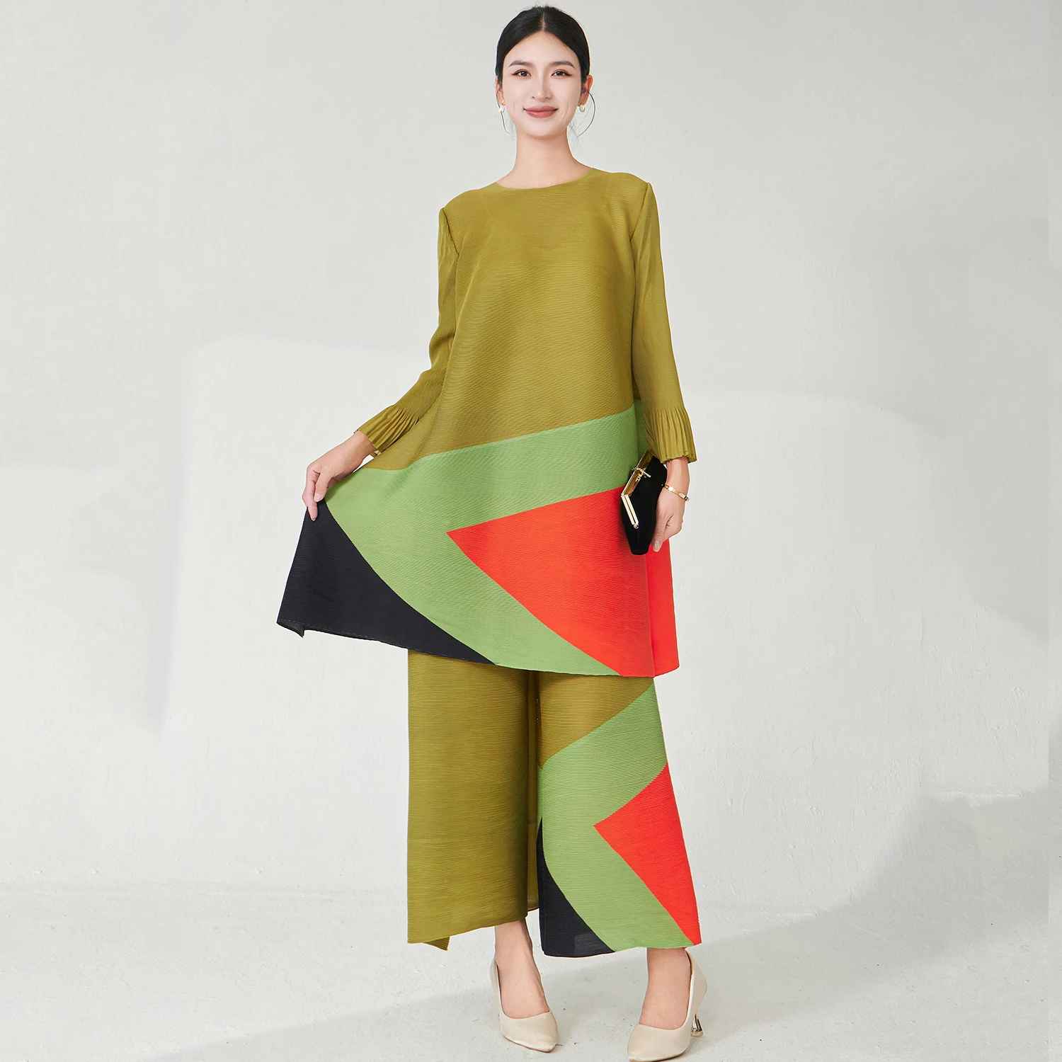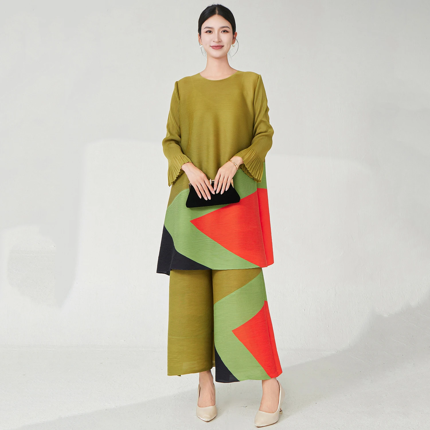 2025 Latest Design Women Fashion Set Plus Size Top and Pants Two Piece Set Miyake Pleated Set Stretch Printed Polyester Fabric