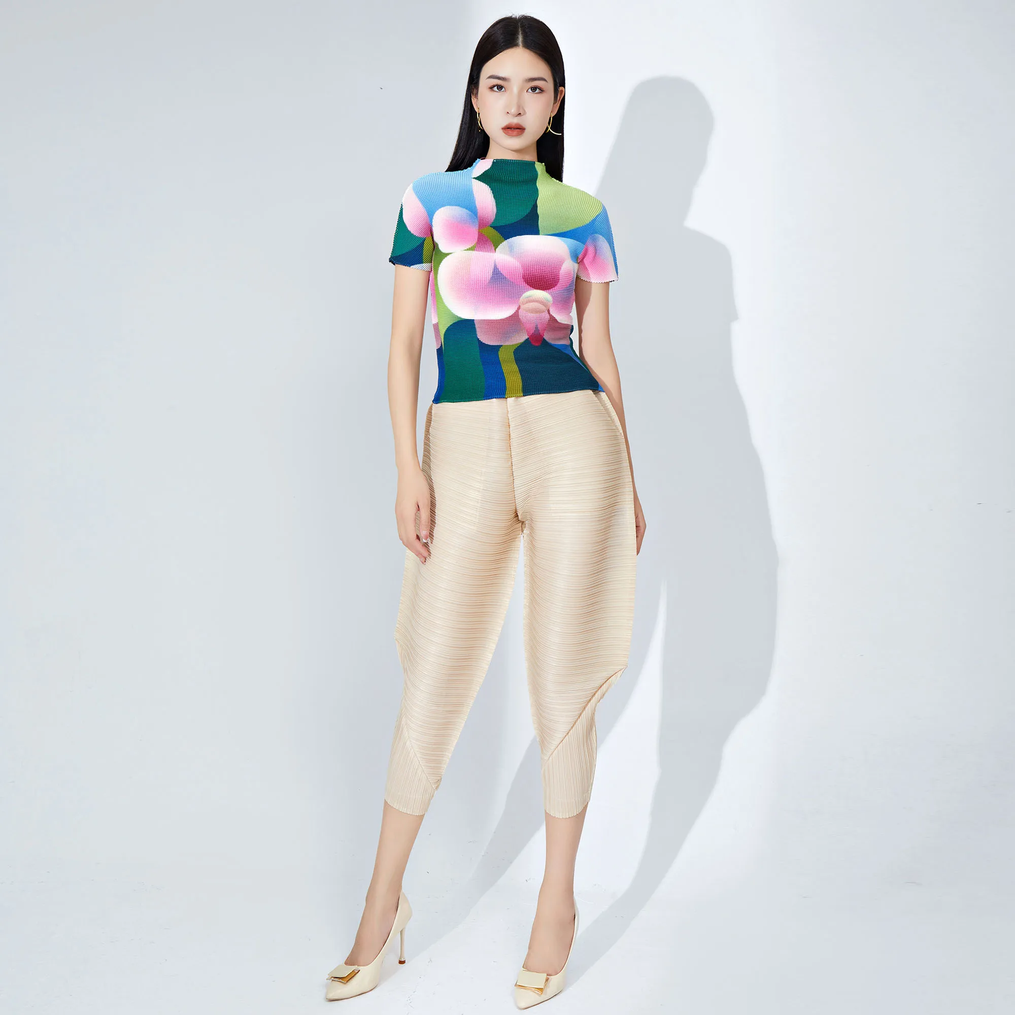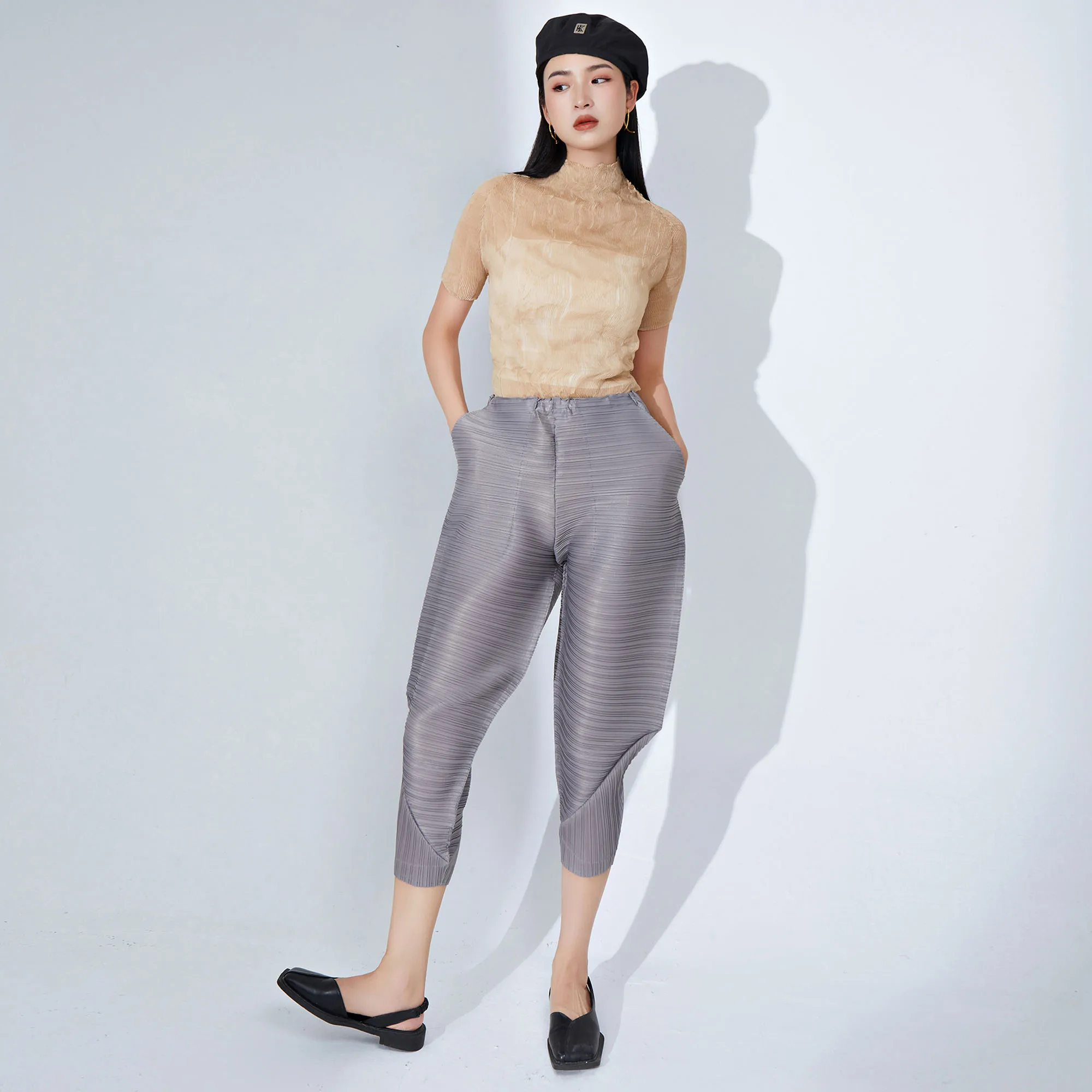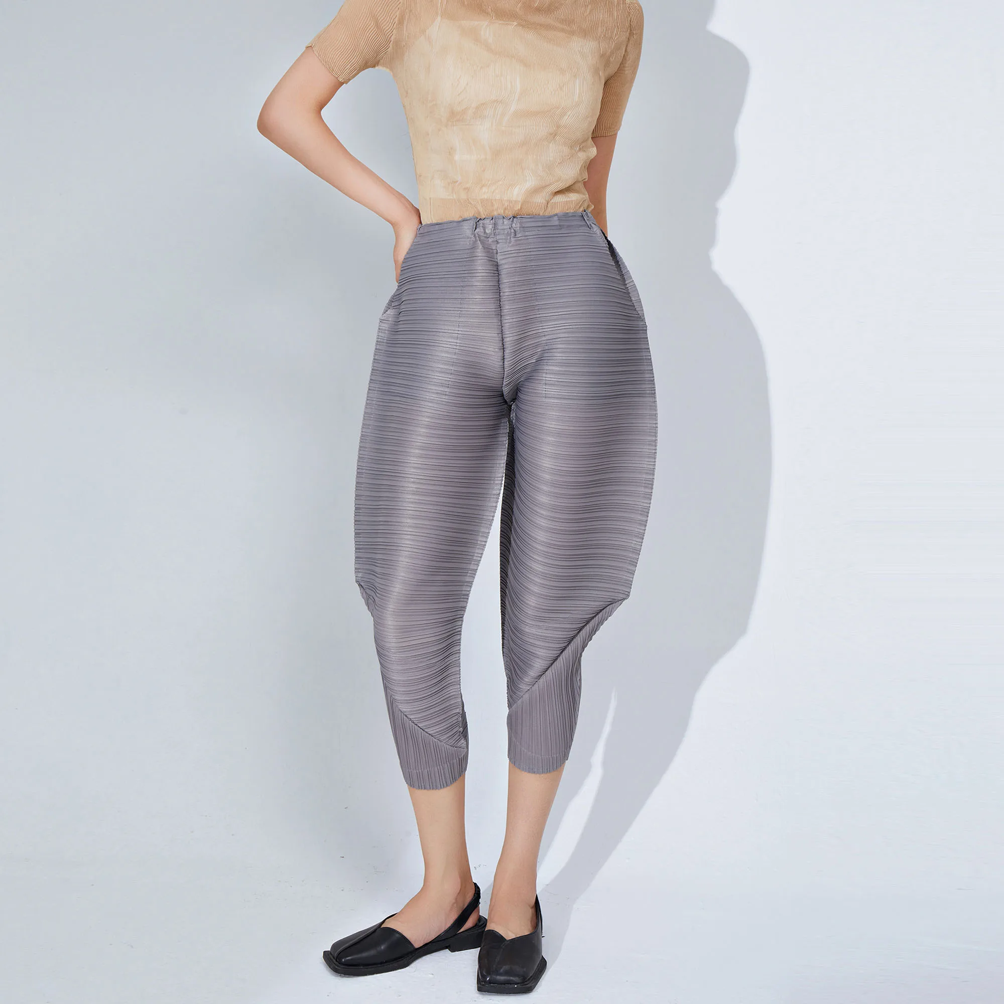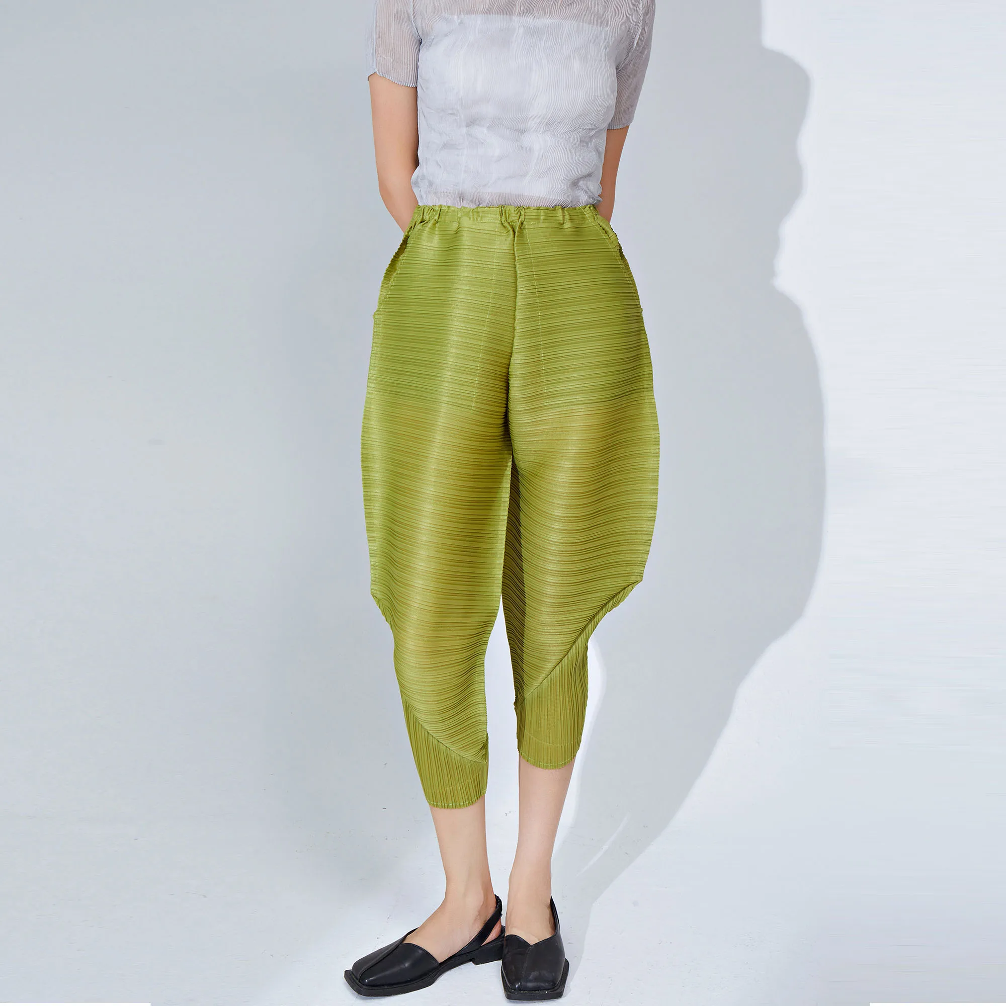 Miyake Pleated Pants for Women Summer Elastic Waist Stretchy Loose Fit Harem Style Unique Pleated Design Casual and Personality