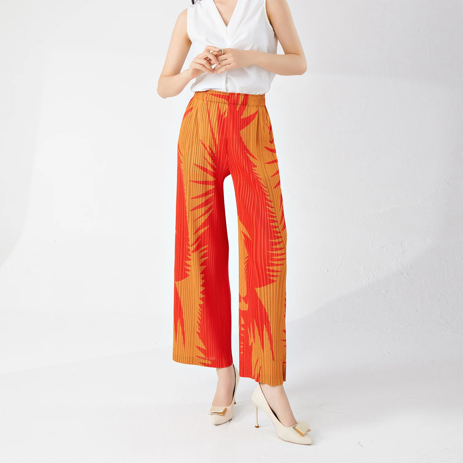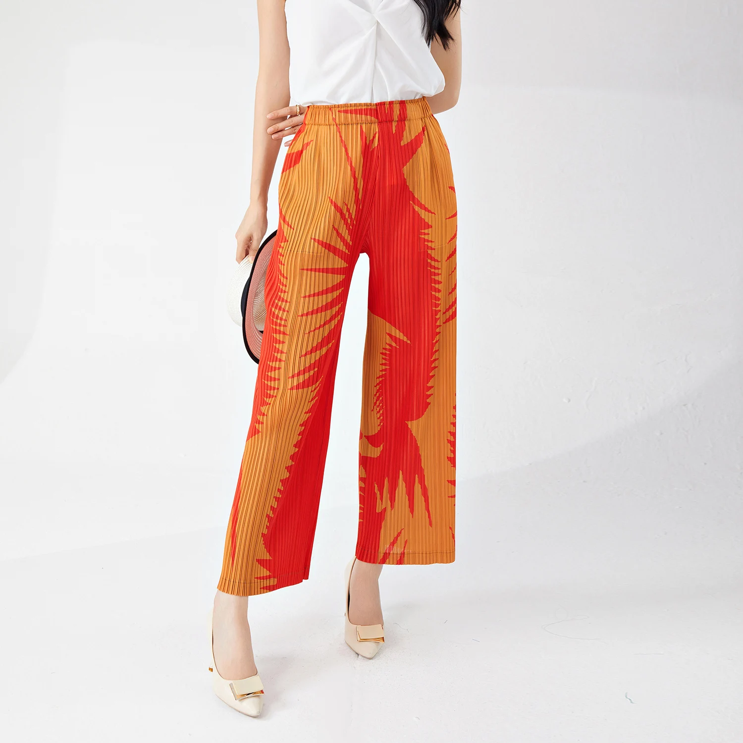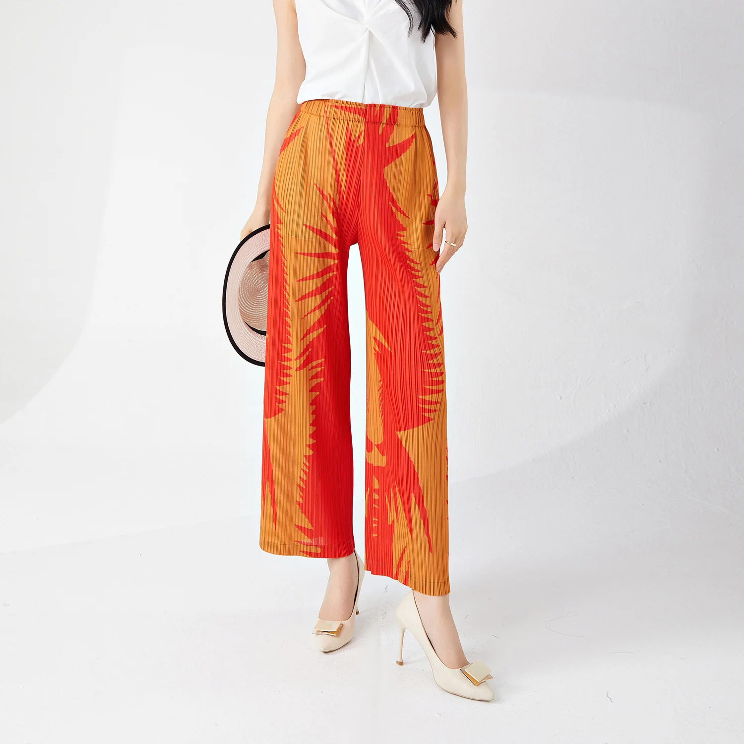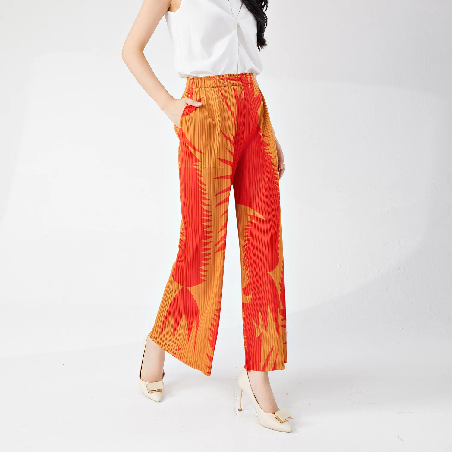 2025 Women Fashion Pleated Pants Miyake Style Elastic Printed Design Loose Casual Wide Leg Summer High Waist Women Pants
