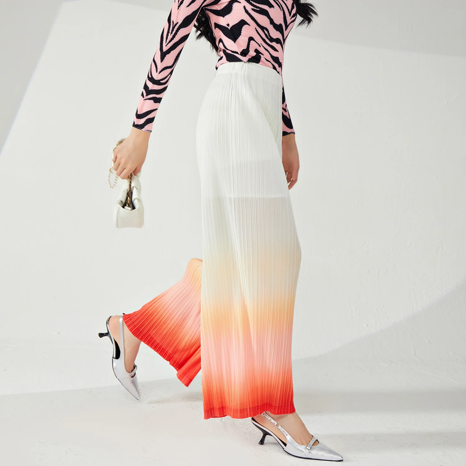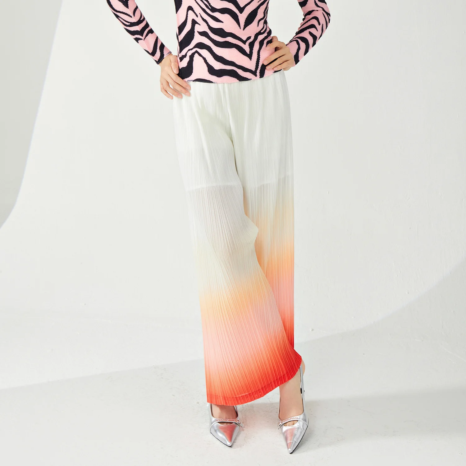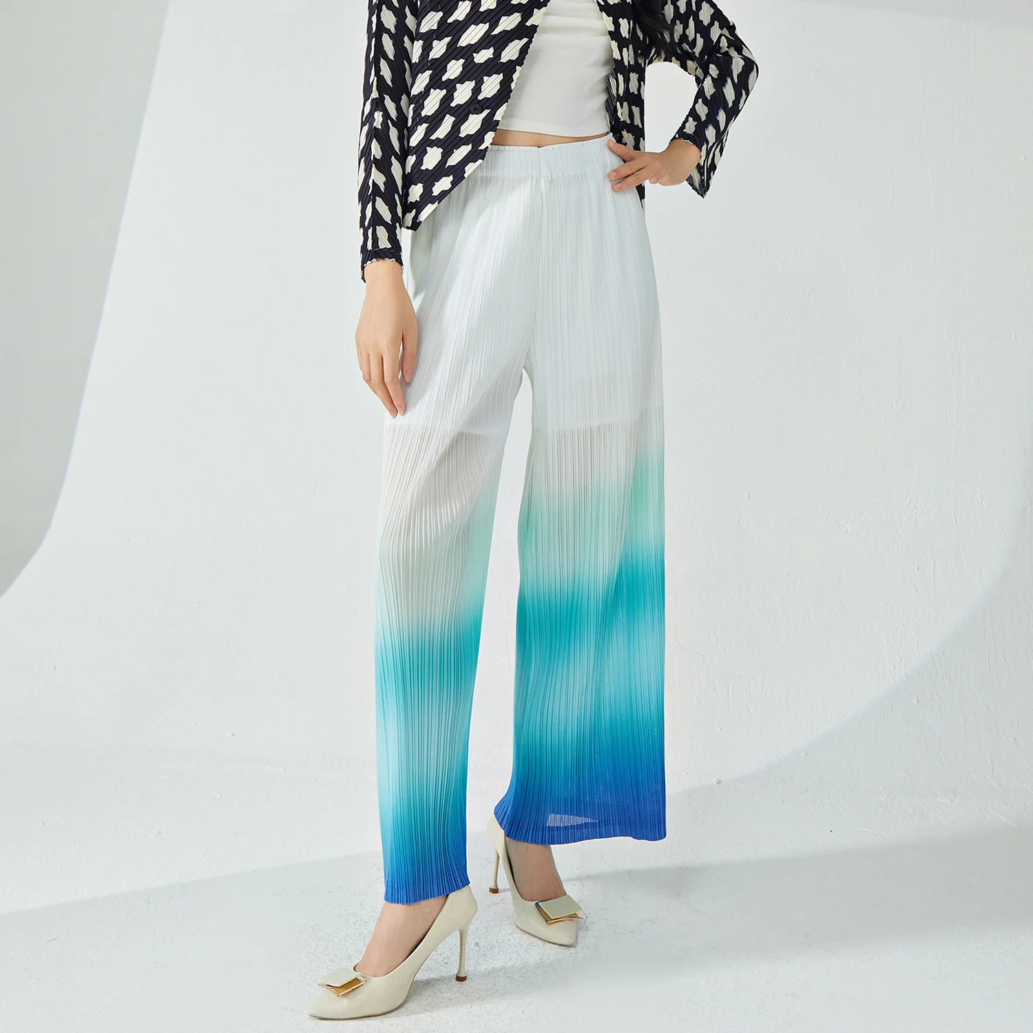 2025 New Women's Casual Loose Stretch Gradient Wide Leg Pants Pleated Western Style With Elastic Waist and Pattern Decoration