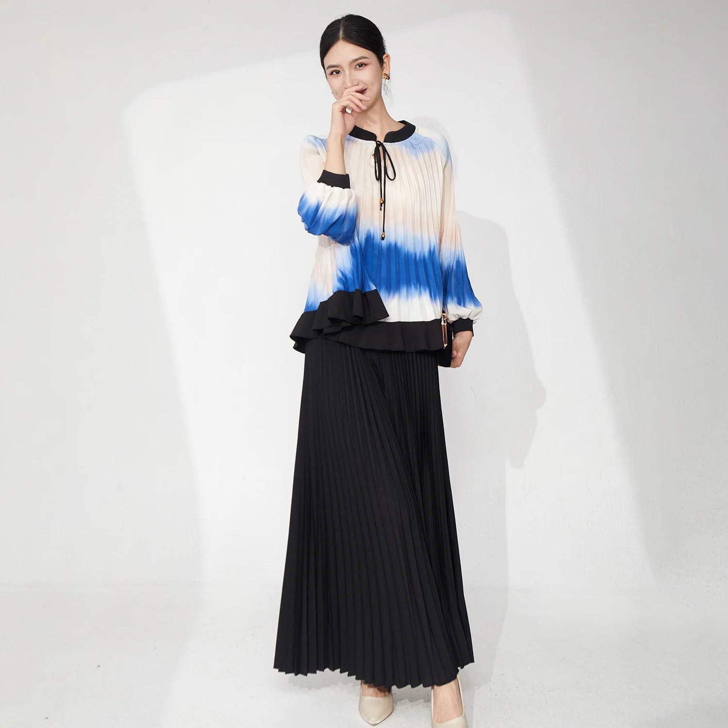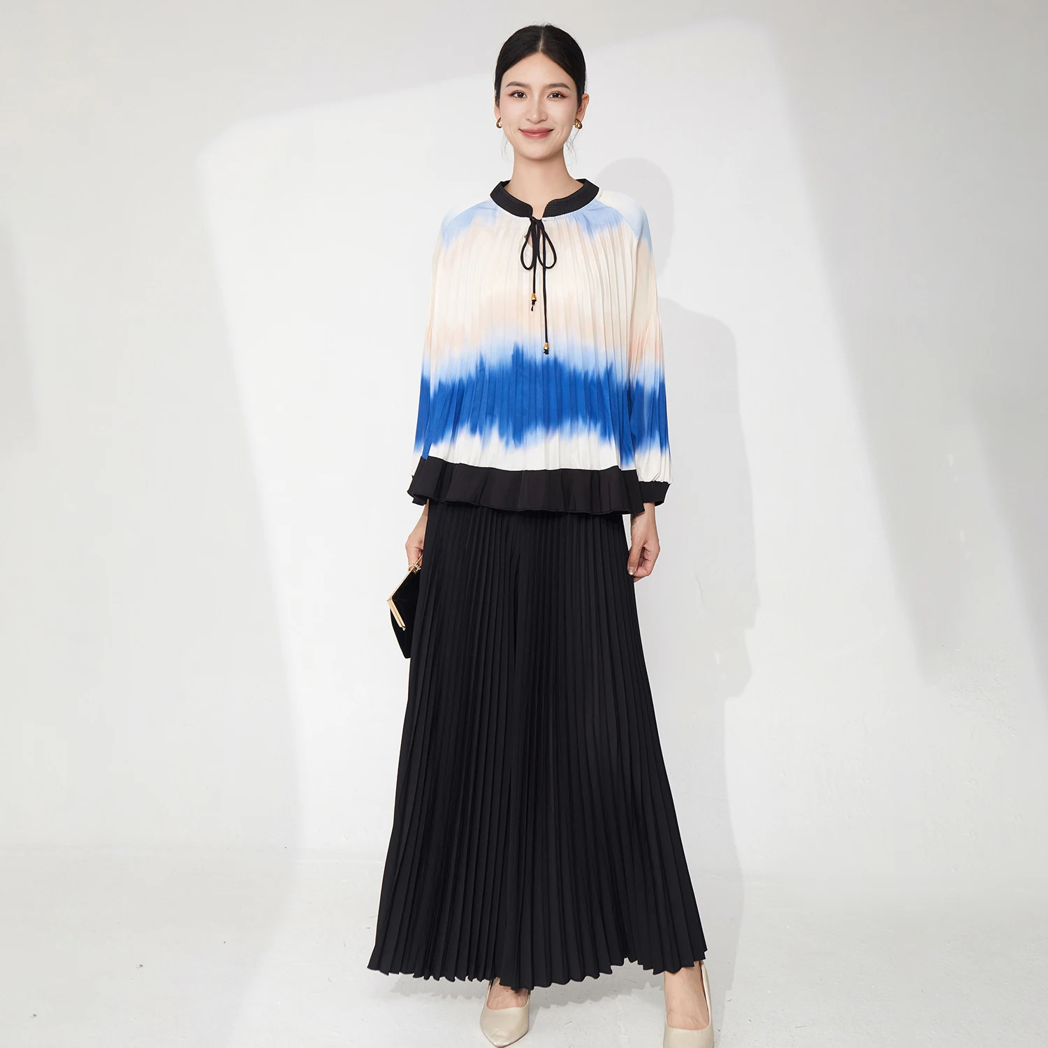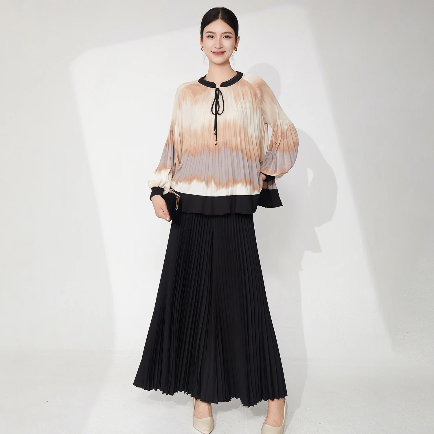 Miyake Pleated Set Women's Summer Gradient Long-Sleeved Top and Wide-Leg Pants Two-Piece Set Ladies Elegant Sets