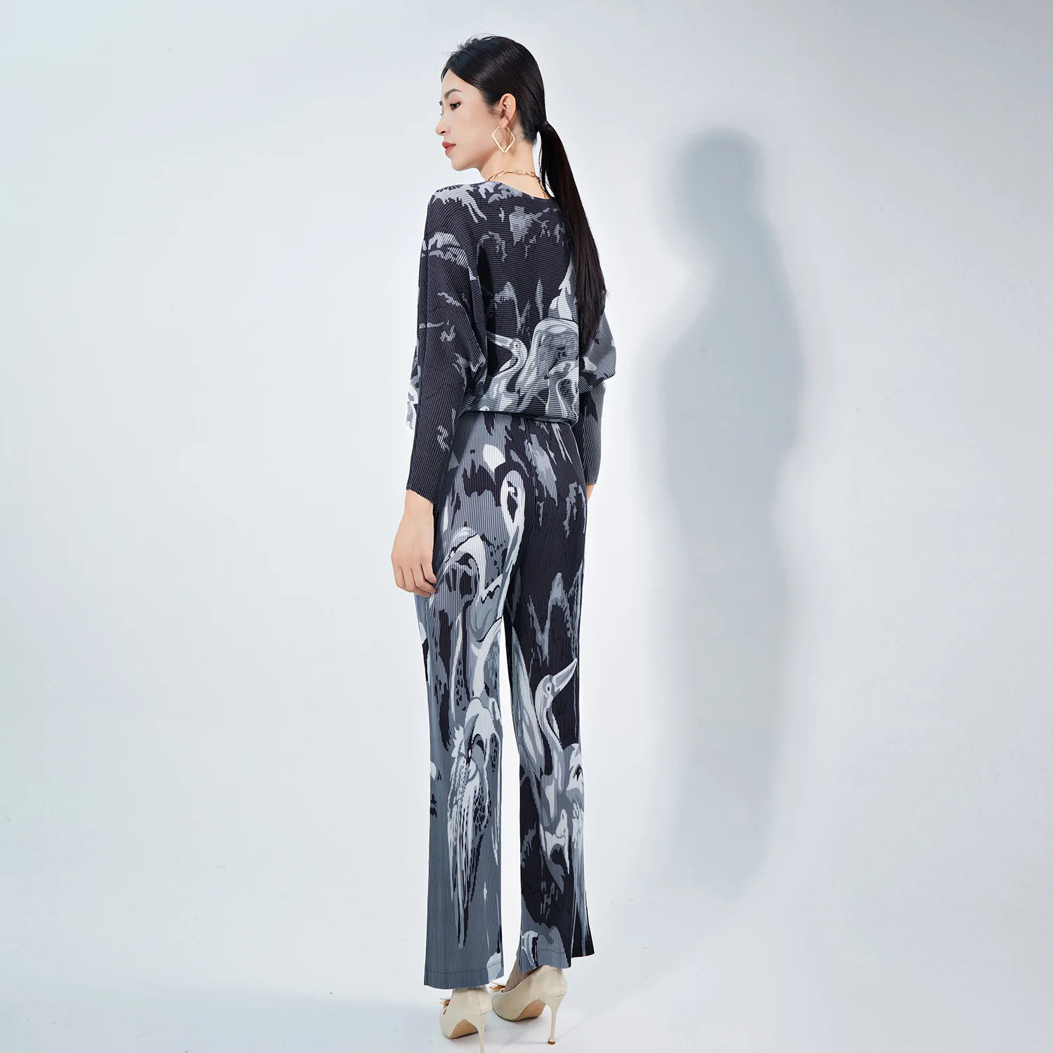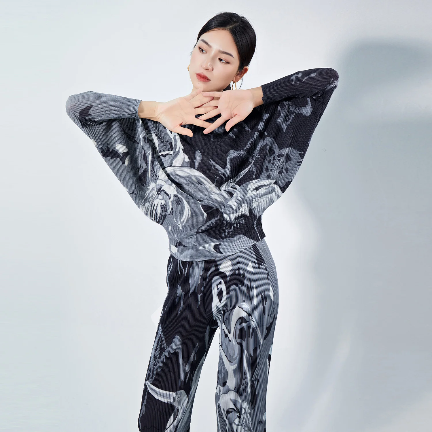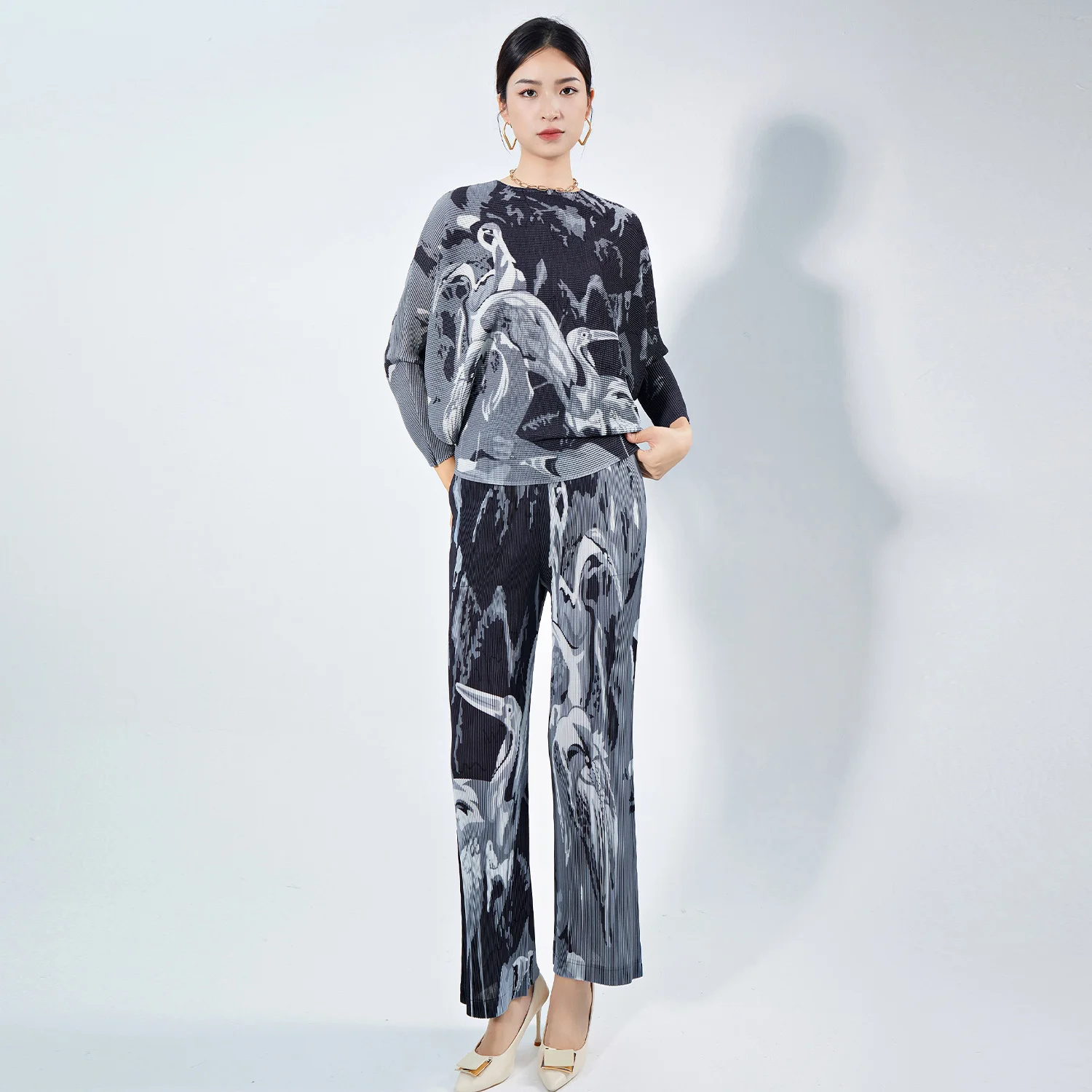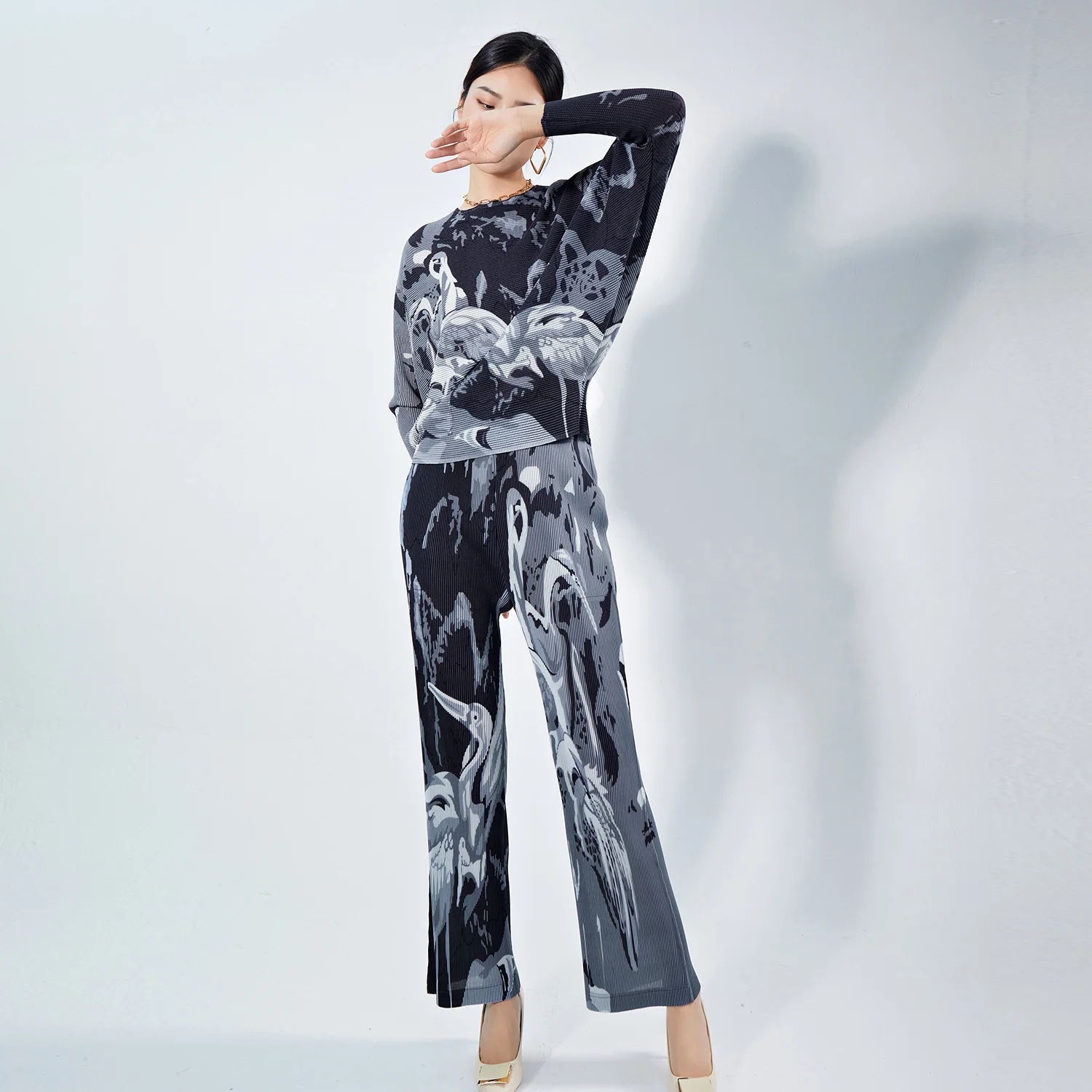 High Quality 2 Piece Long Sleeve Top and Pants Set for Women 2025 Custom Miyake Pleated Two Pieces Pants and Top Set