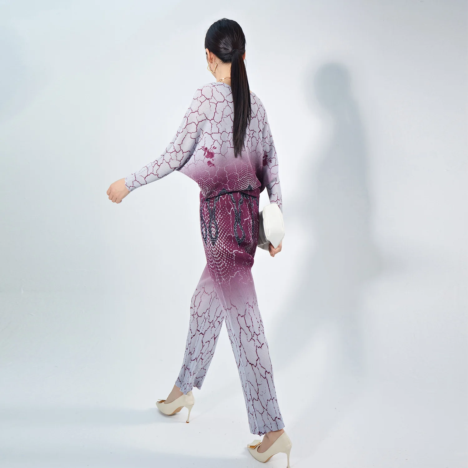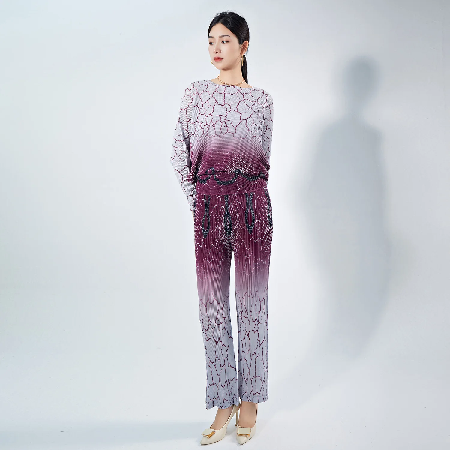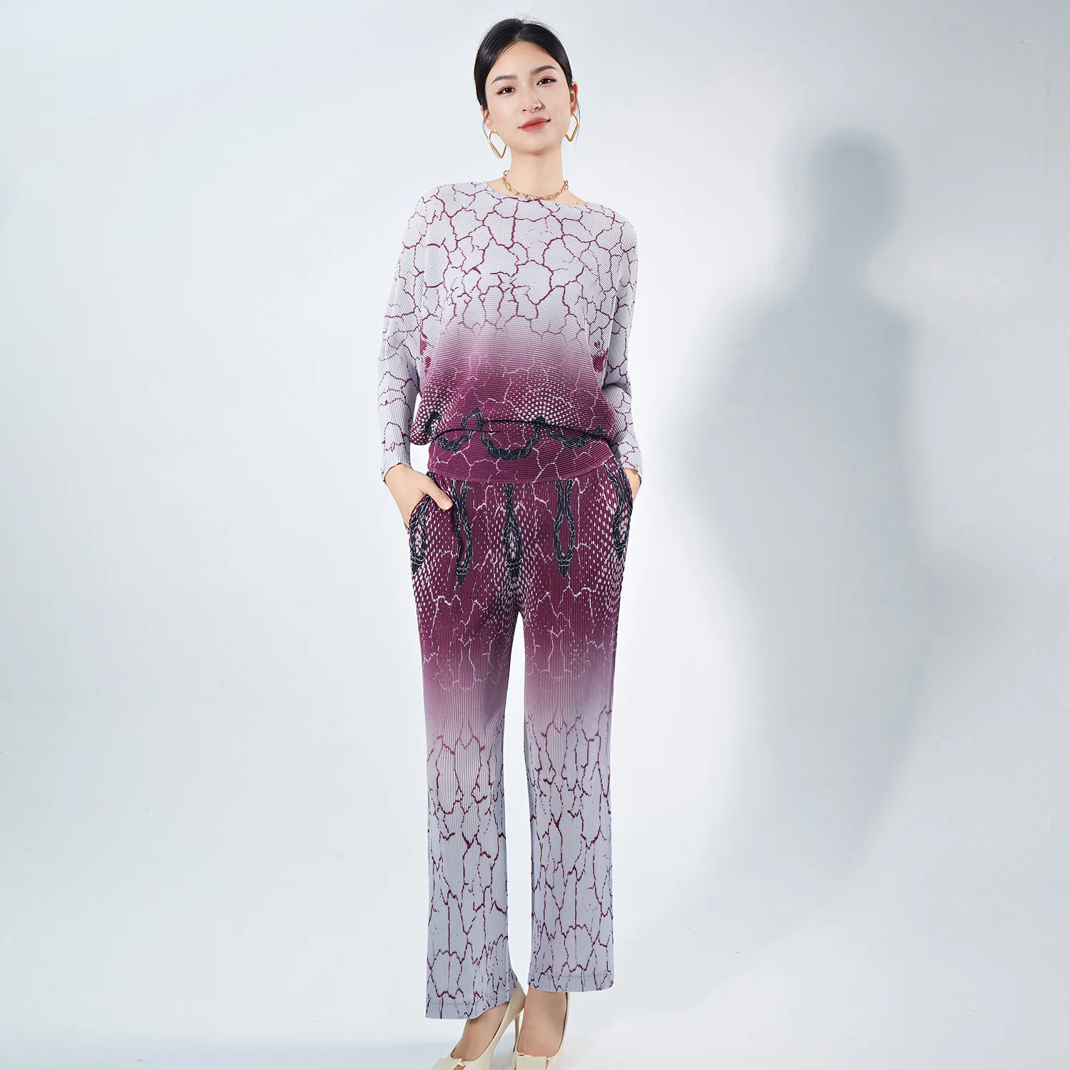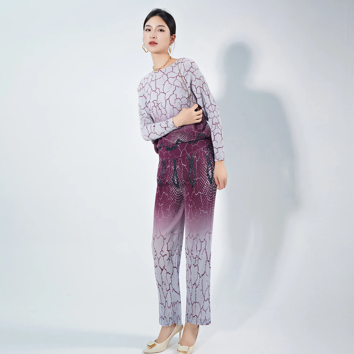 Women's Summer Fashion Geometric Print Long Sleeve Set Femme Casual Sporty 2Pcs Set Pleated Tops Pants Set