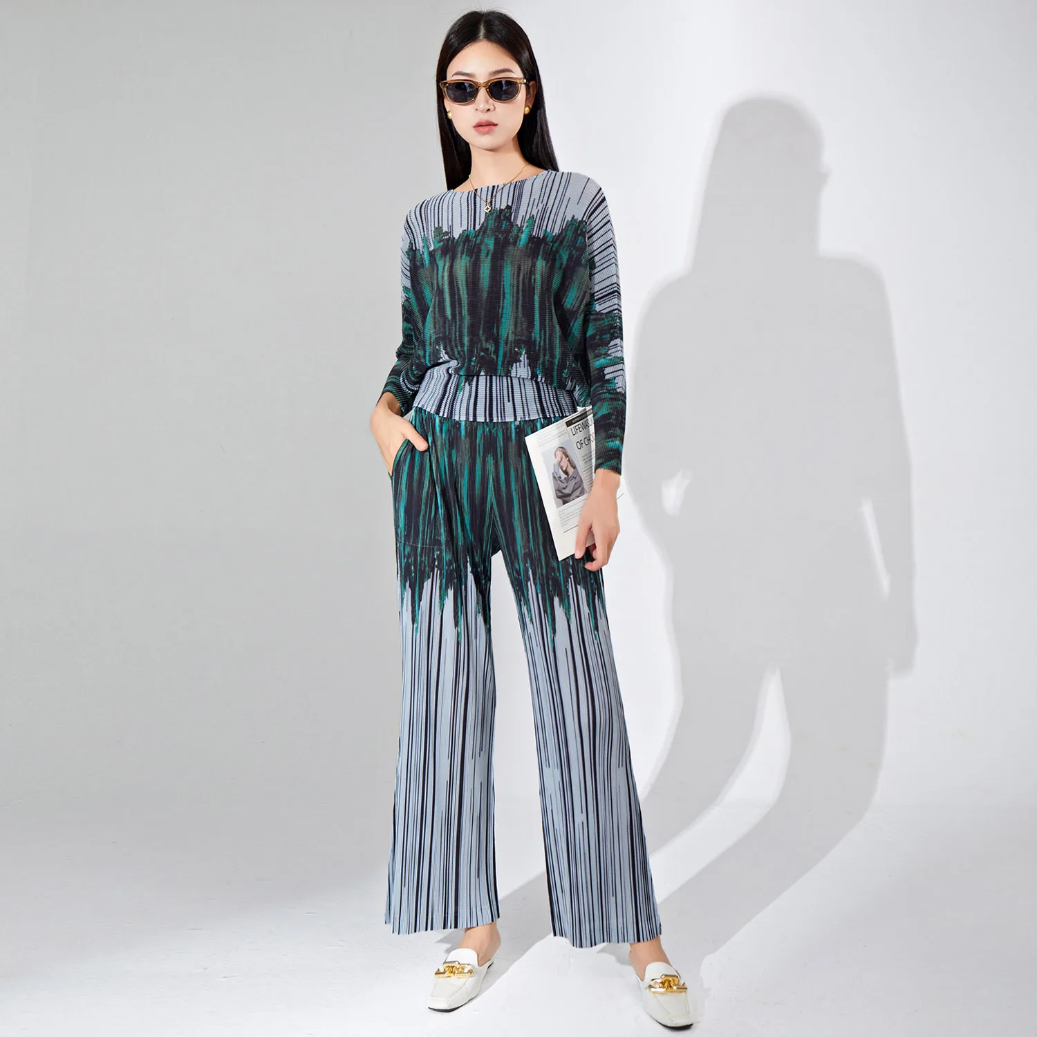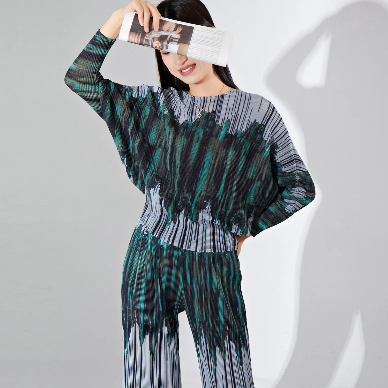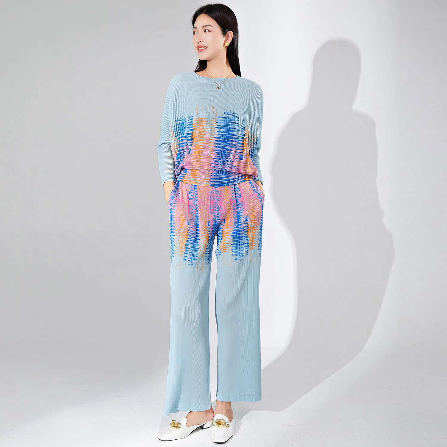Women's Fashion Pleated Clothing Casual Two Piece Set Printed Batwing Sleeve Loose Top and Straight Pants 2 Piece Set Women