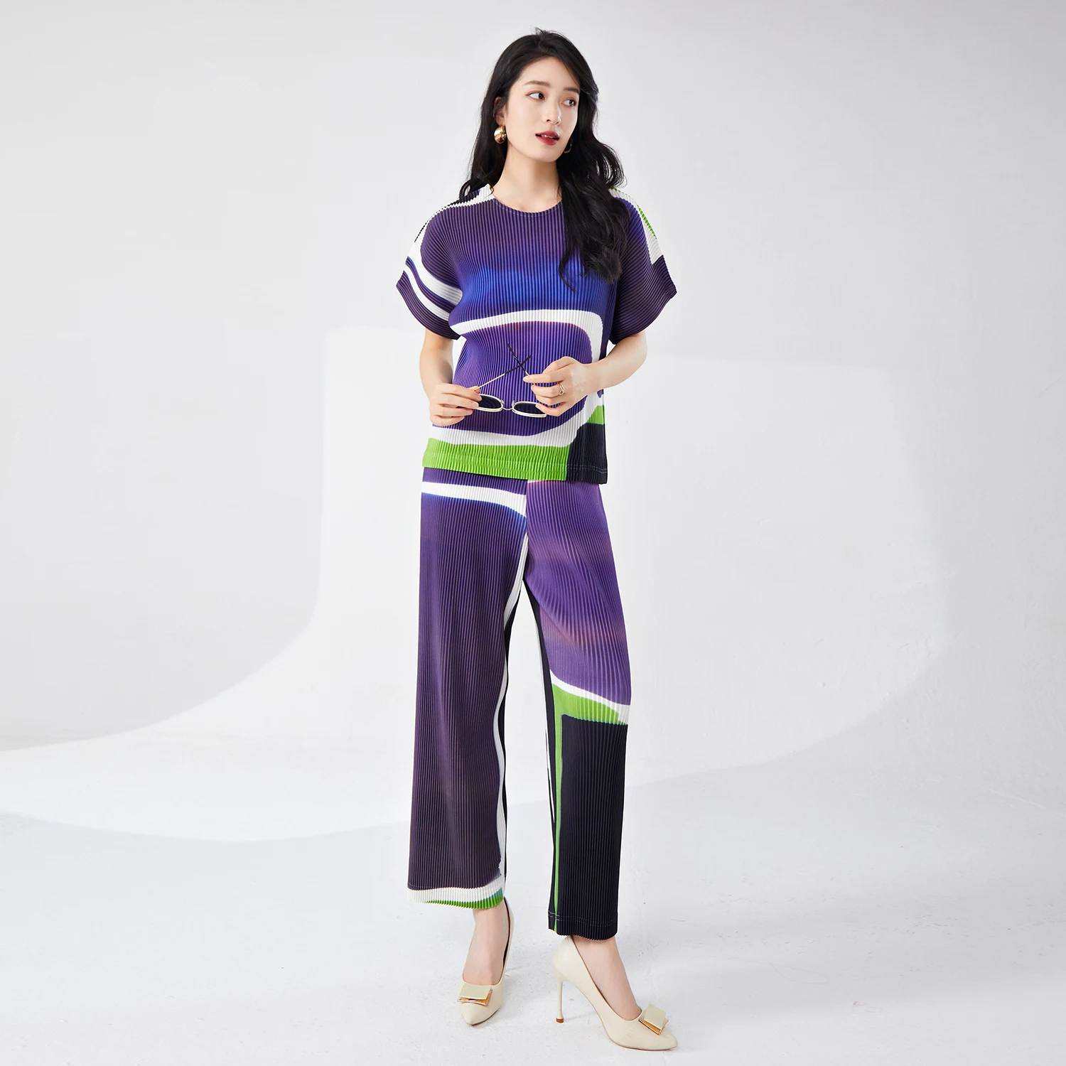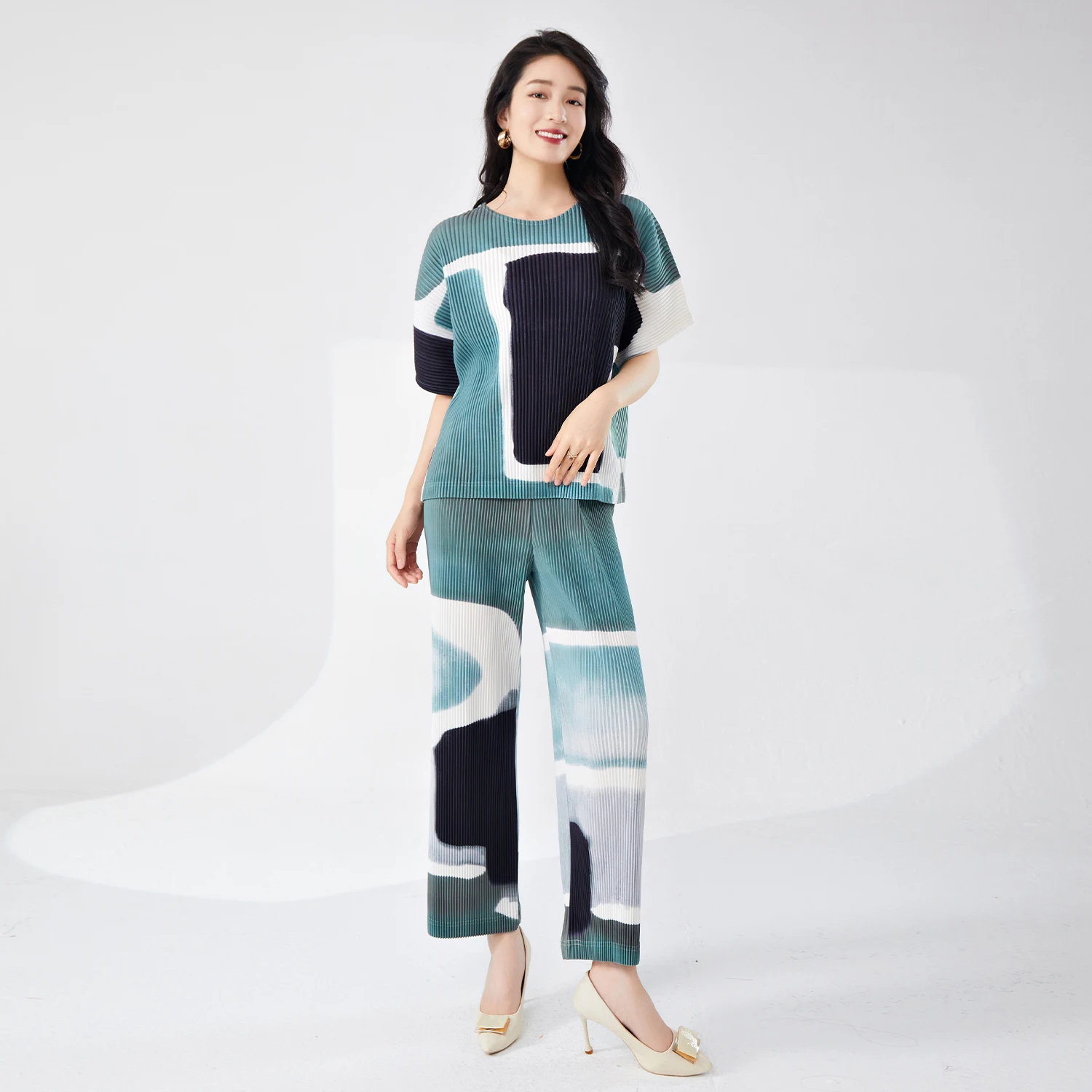 Miyake Pleated Summer Women's Two-Piece Set Crew Neck Loose Short-Sleeved T-Shirt Printed Fashionable Design Straight Pants