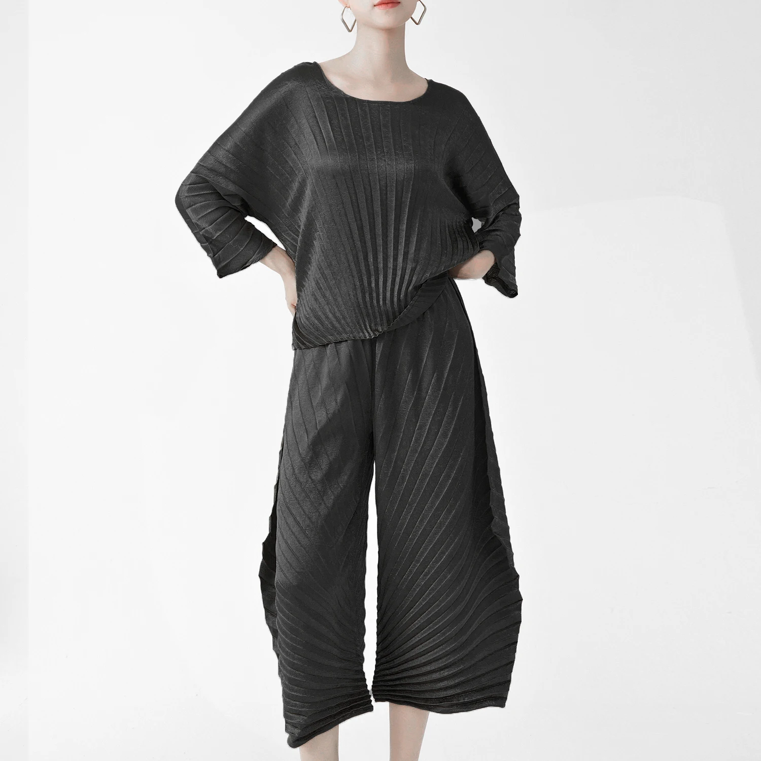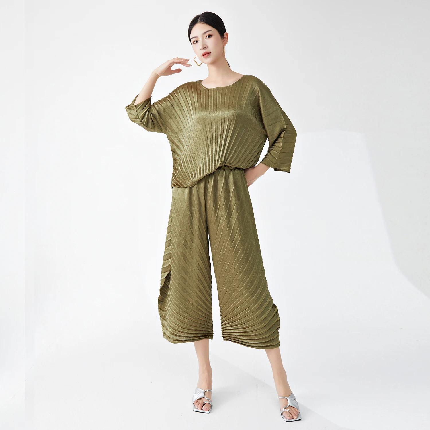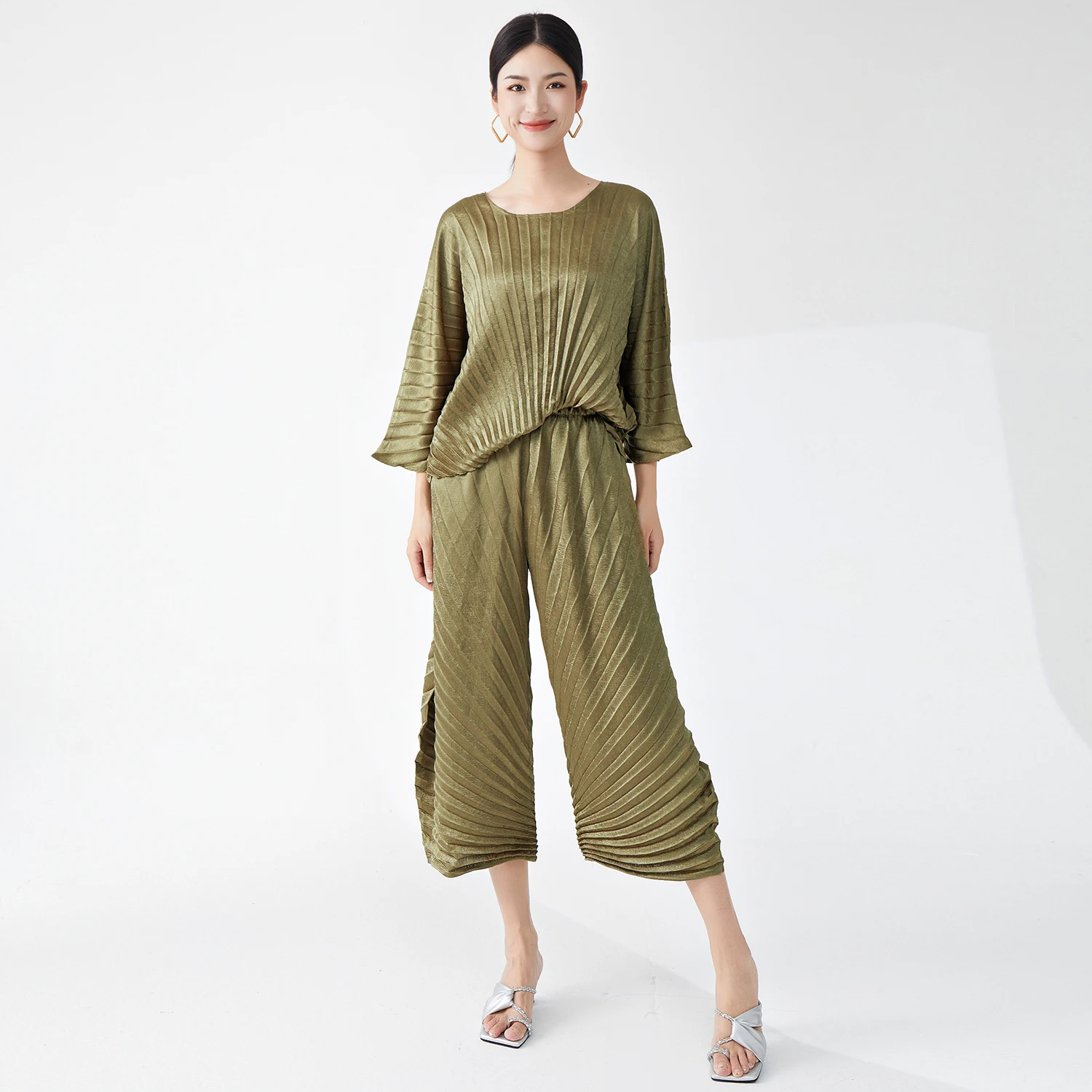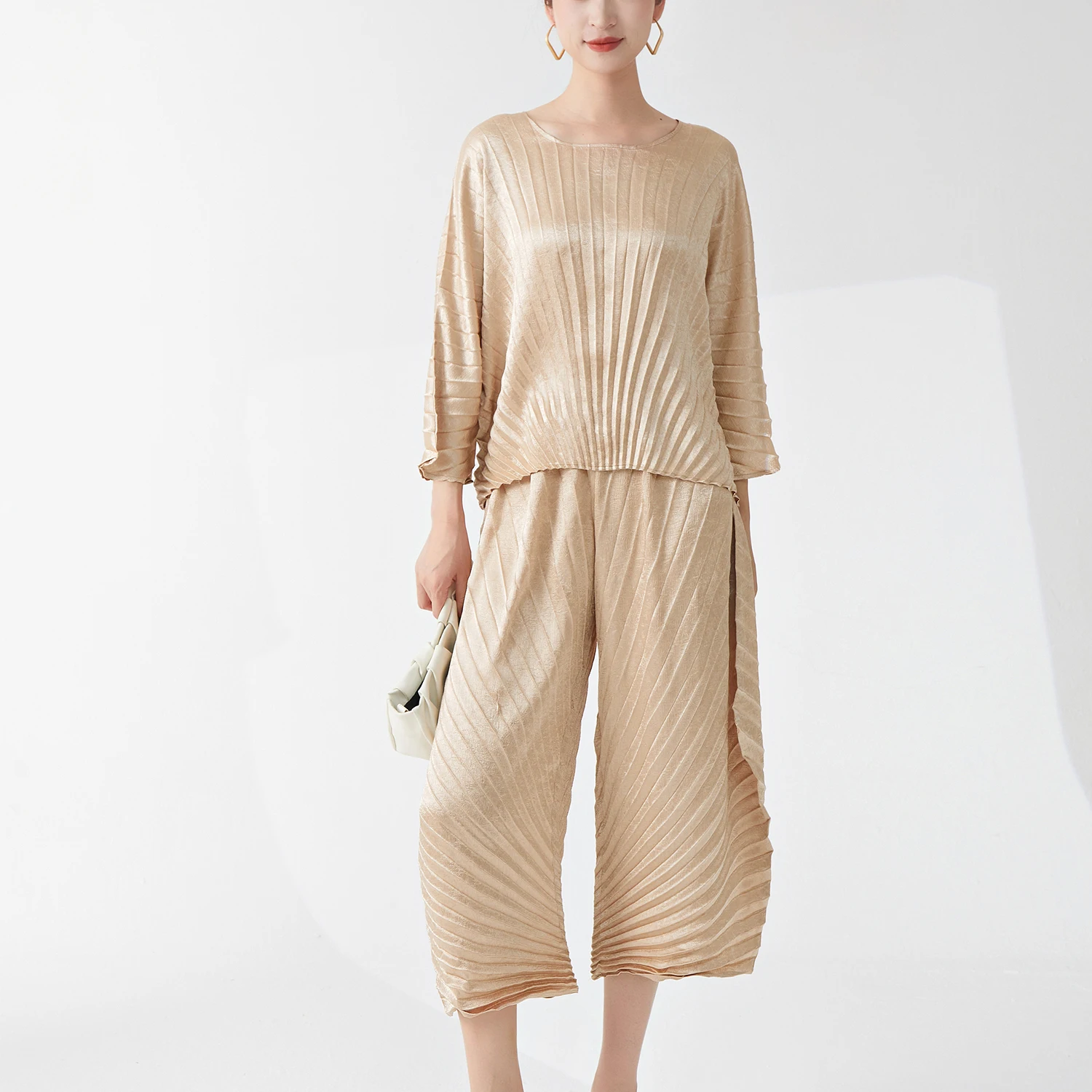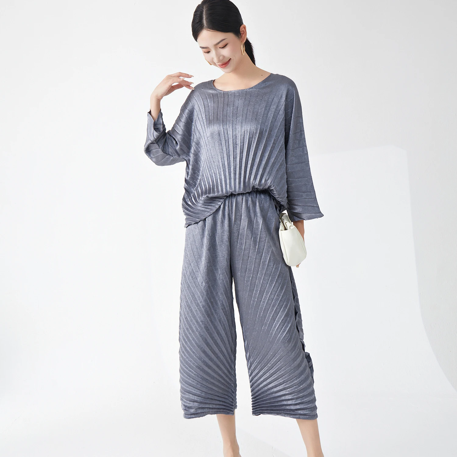 2025 Summer Women's Casual Clothing Two-Piece Set Miyake Pleated Design Shiny Metal Fabric Loose Top Pants