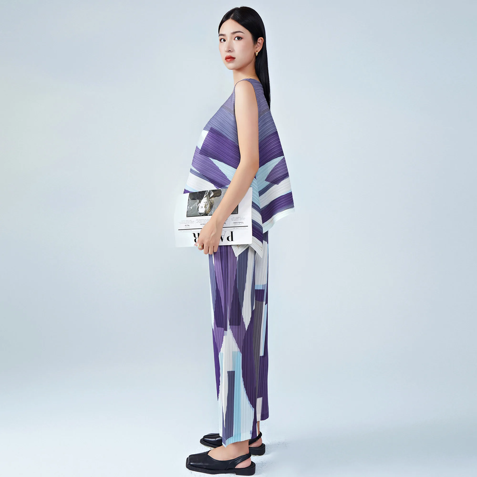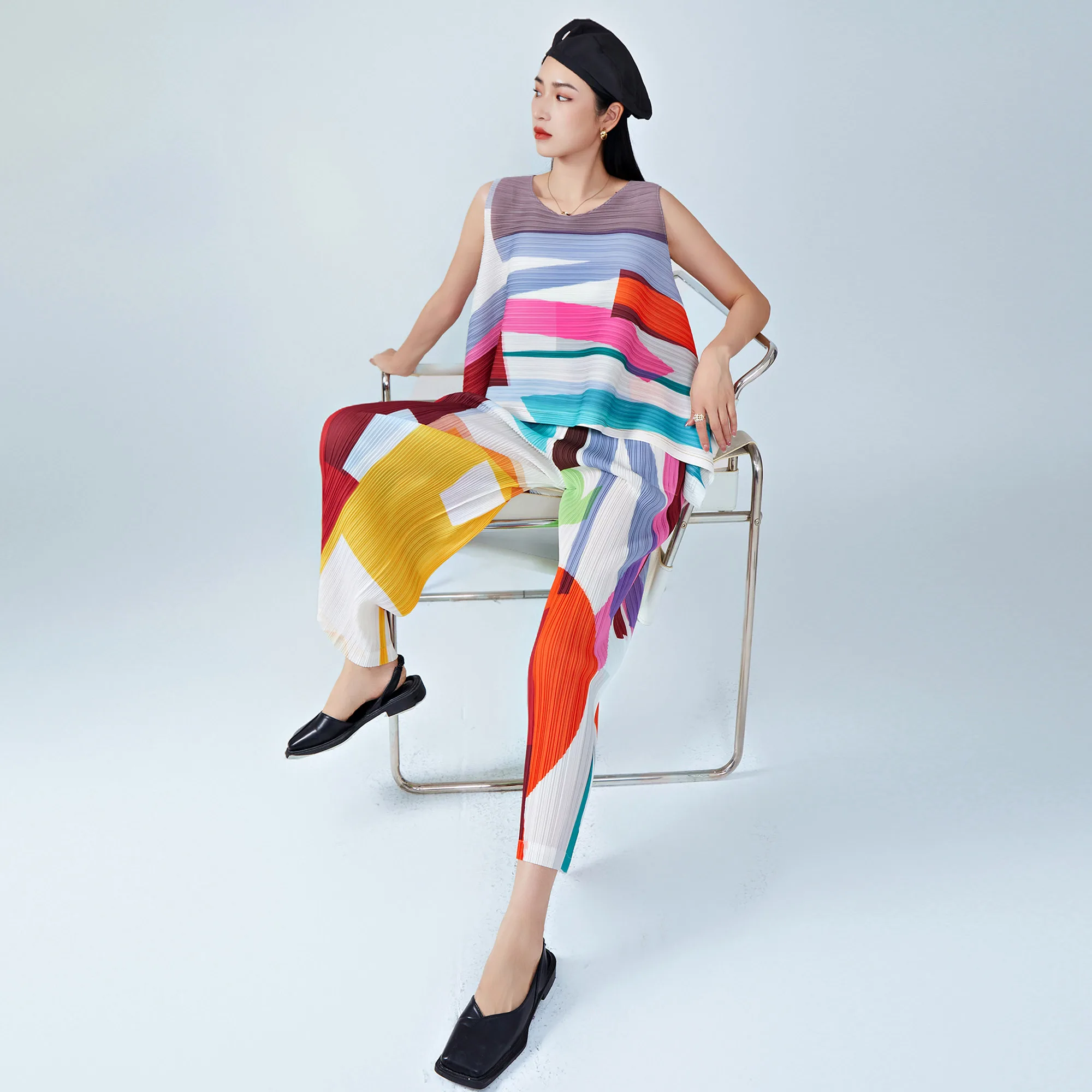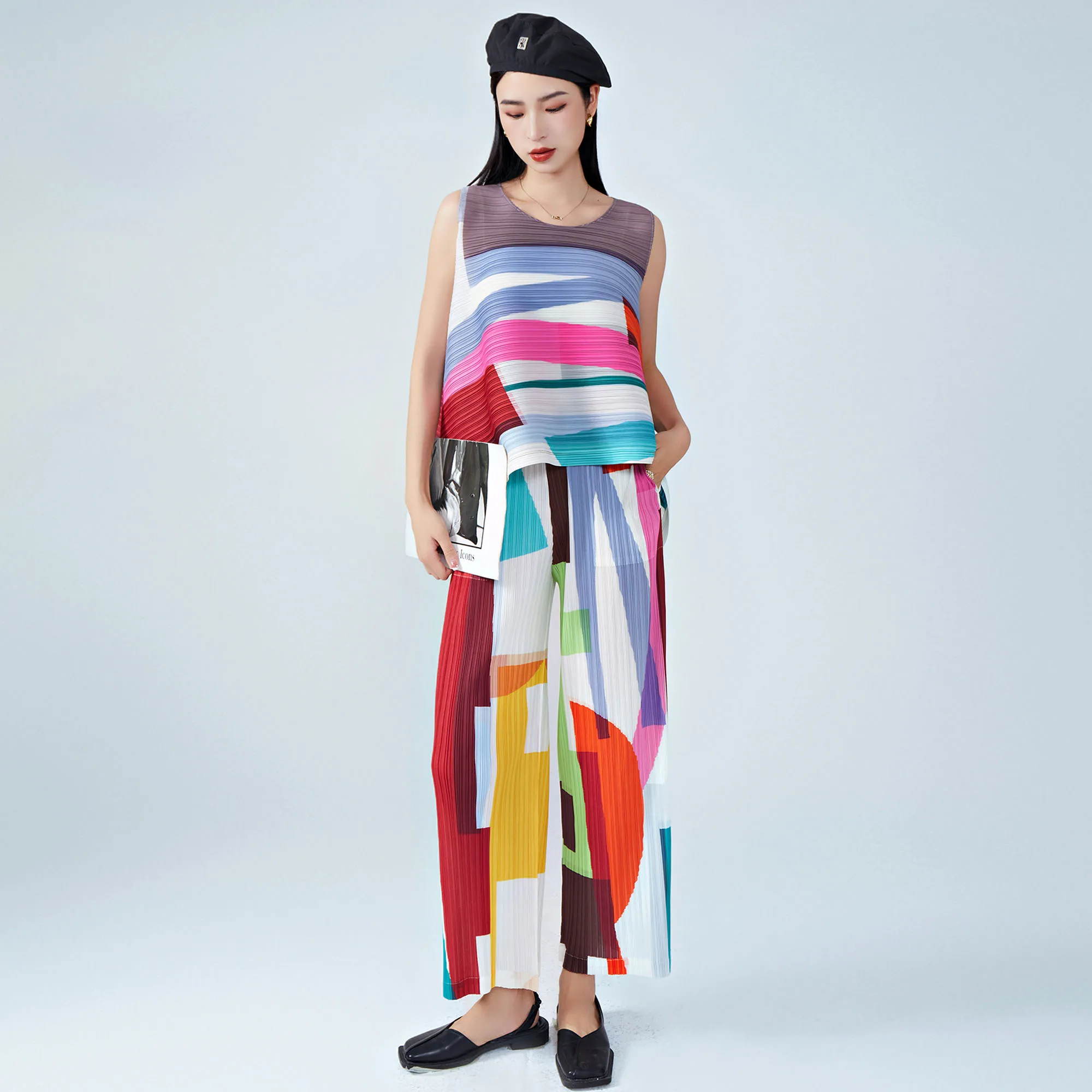 Miyake Pleated Chic Two-Piece Set Loose Sleeveless Geometric T-Shirt Top and Casual Straight Pants
