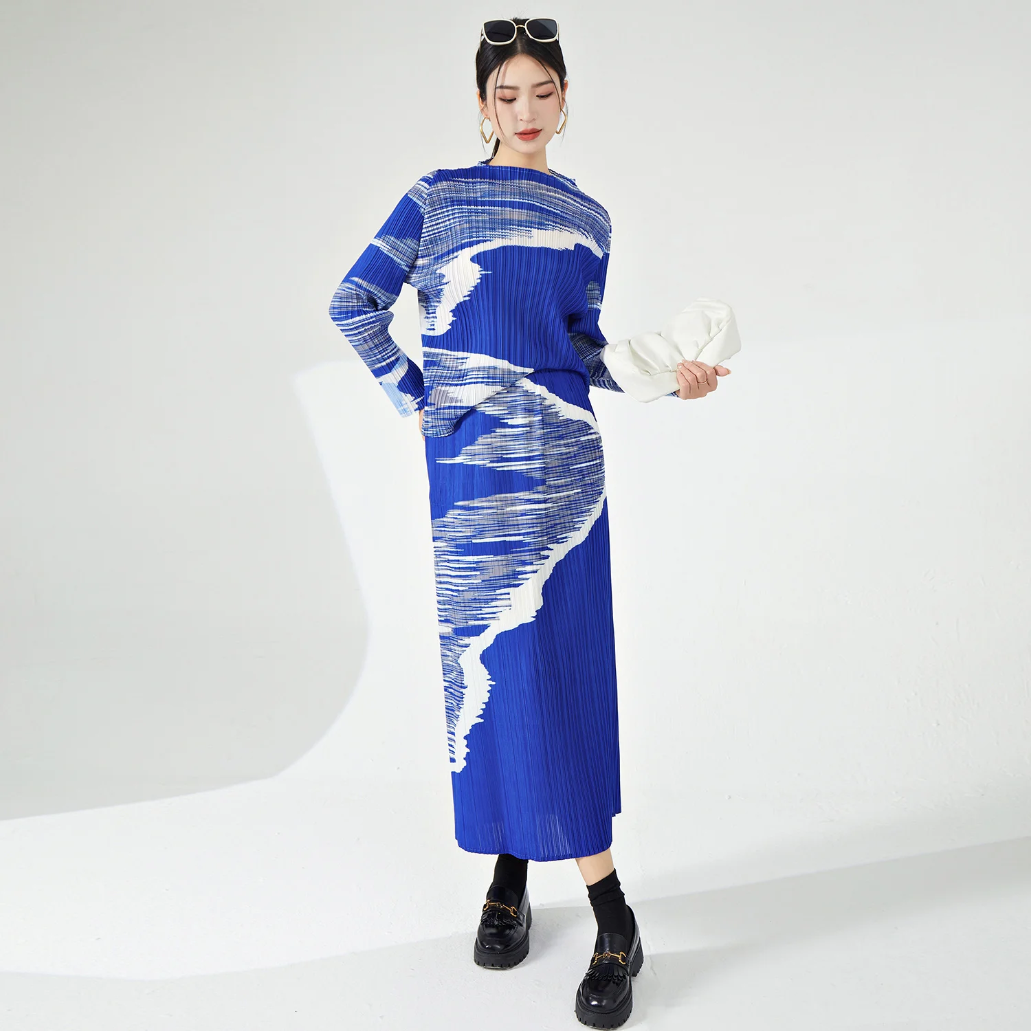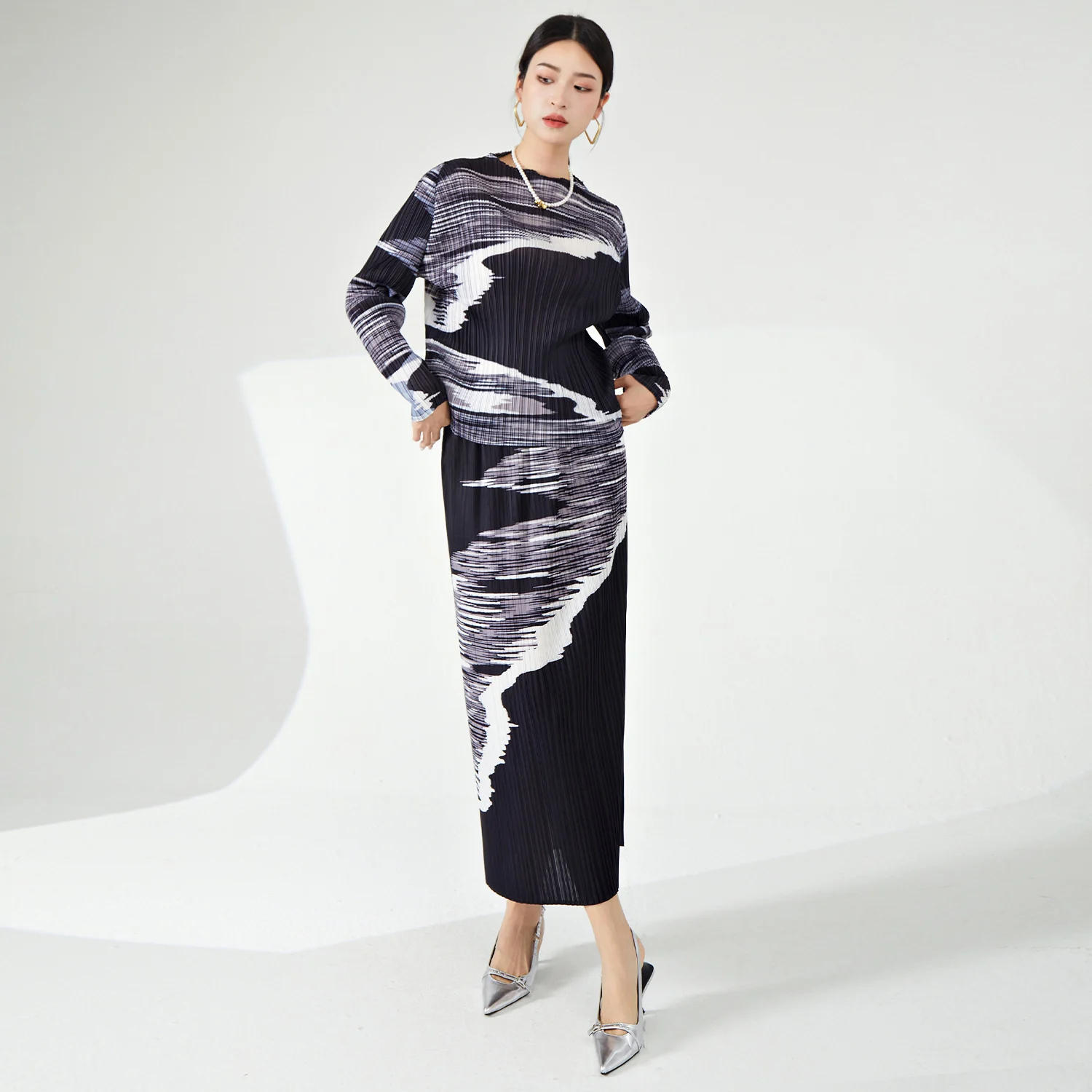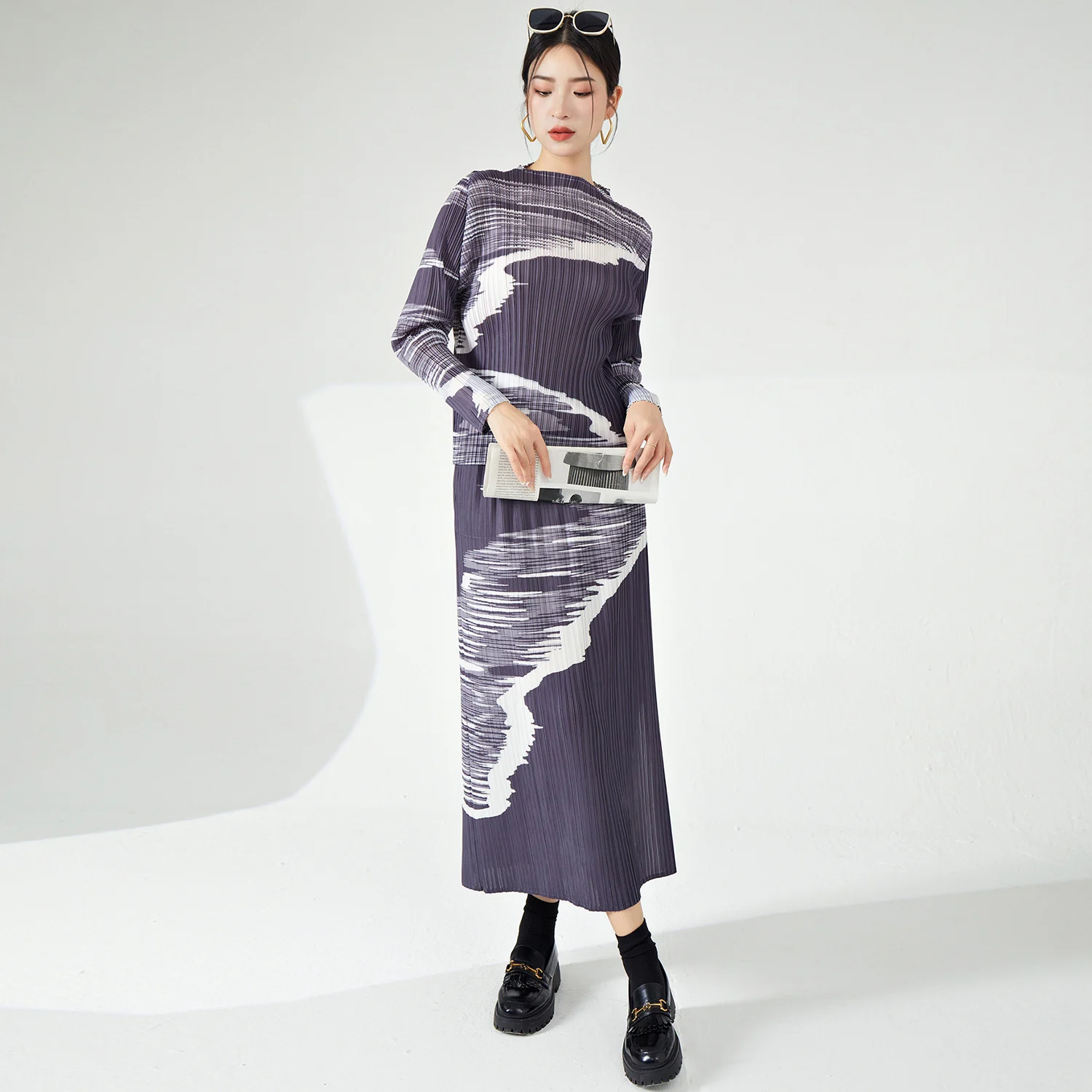 Miyake Women's Casual Style Pleated Fabric Two-Piece Set A-Line Skirt and Elastic Top Personalized Printed Elegant Temperament