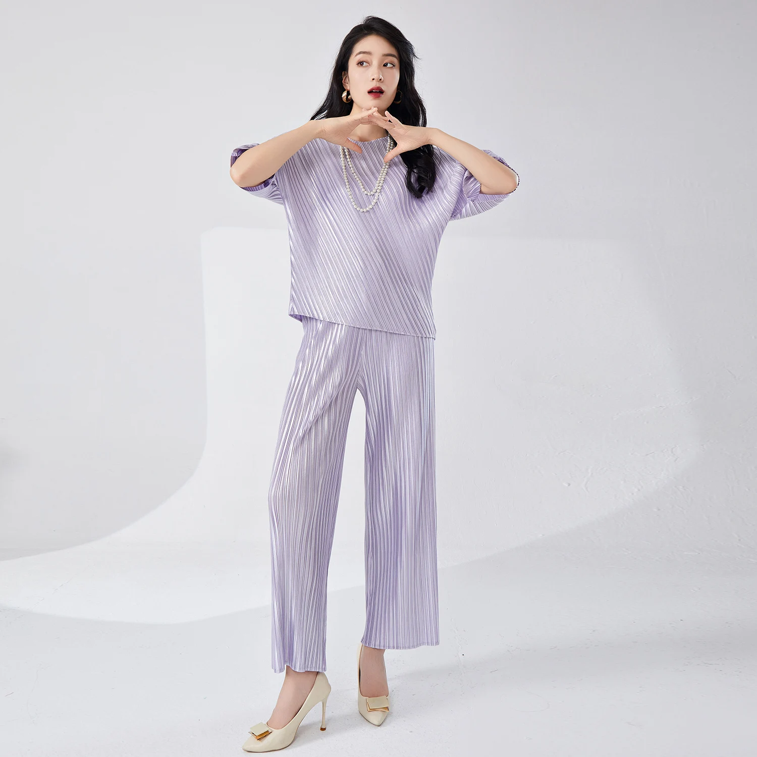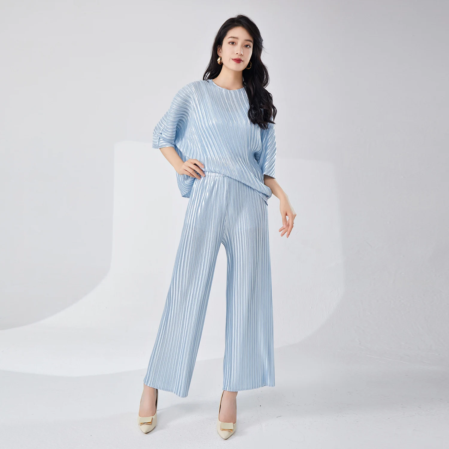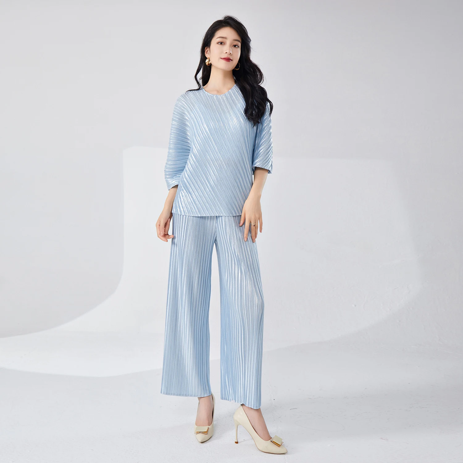 New Miyake Pleated Women's Casual Oversize Loose Plus Size Long Sleeve T-Shirt Trousers Two-Piece Set
