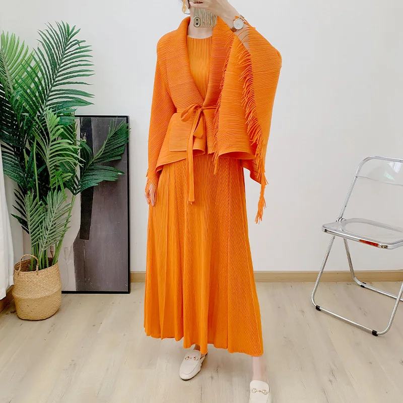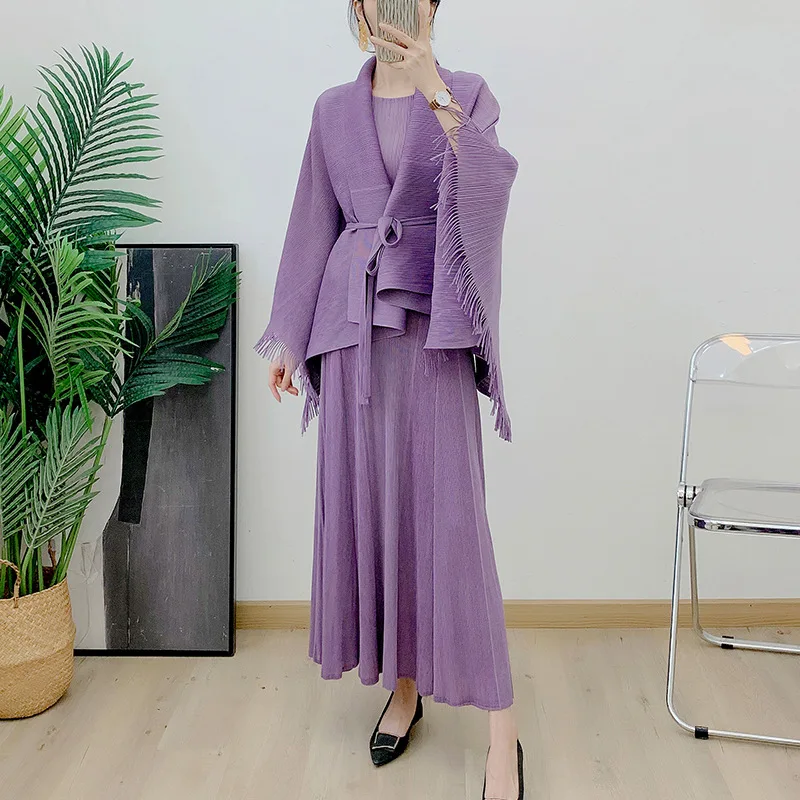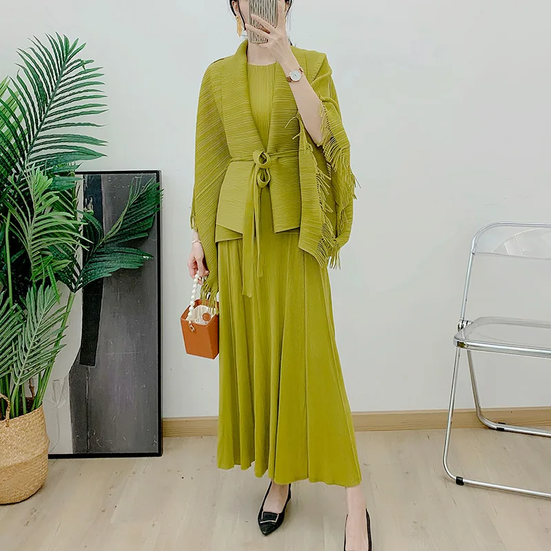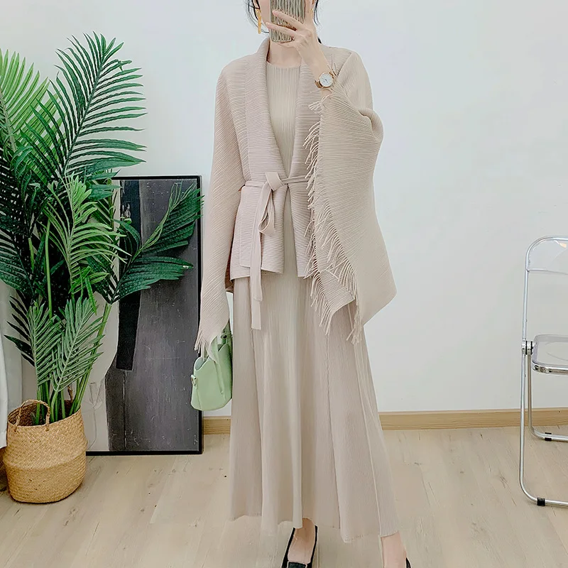 Miyake Pleated 2025 Elegant Tassel Lace-Up Top Sleeve Dress Two-Piece Spring and Autumn Women's Pleated Suit