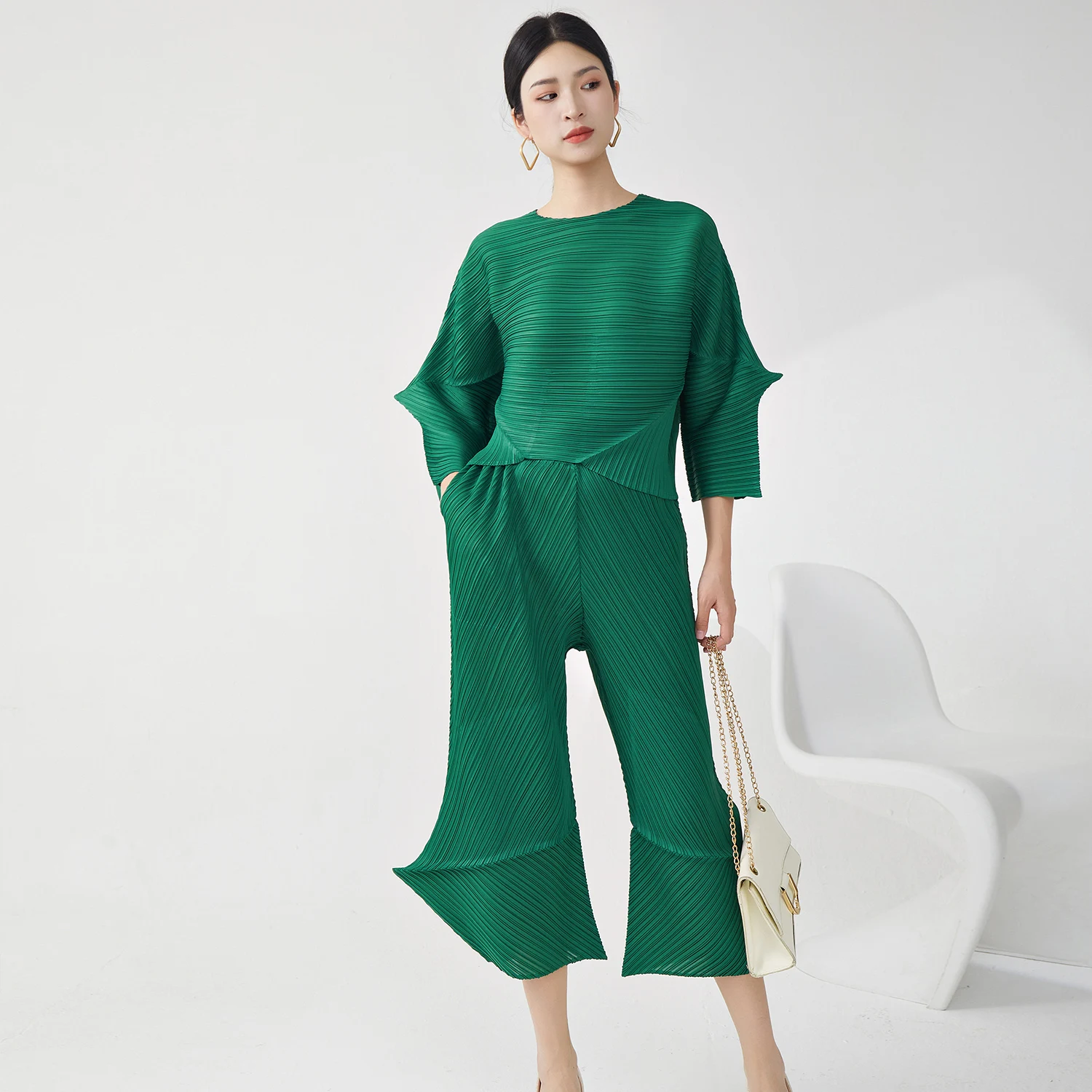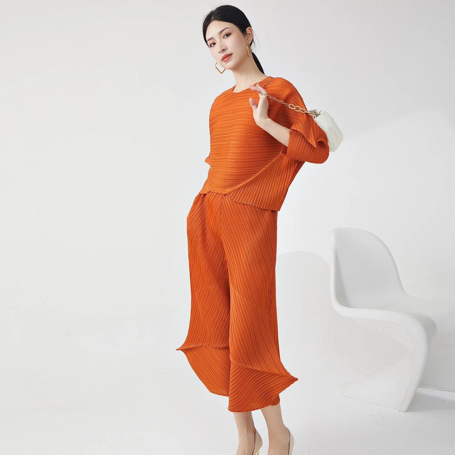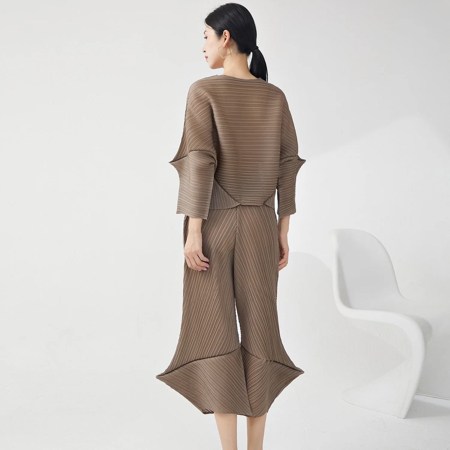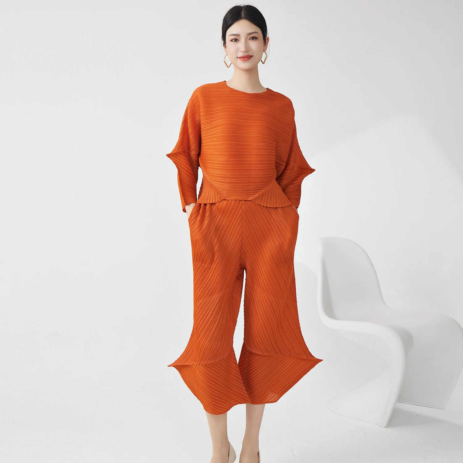 Miyake Pleated Design Two-Piece Casual Clothing Women Summer 2025 High Quality Crew Neck Loose Top and Pants