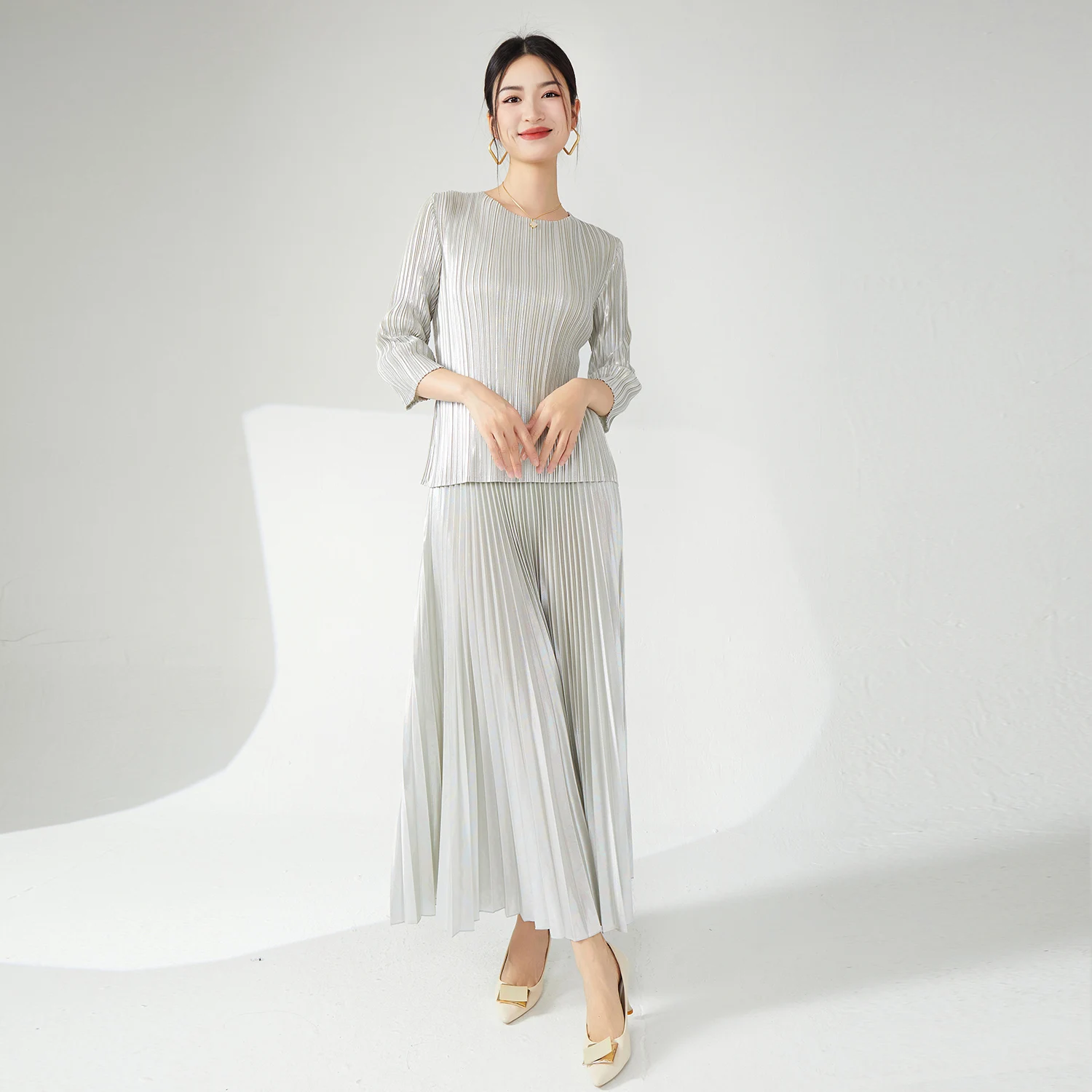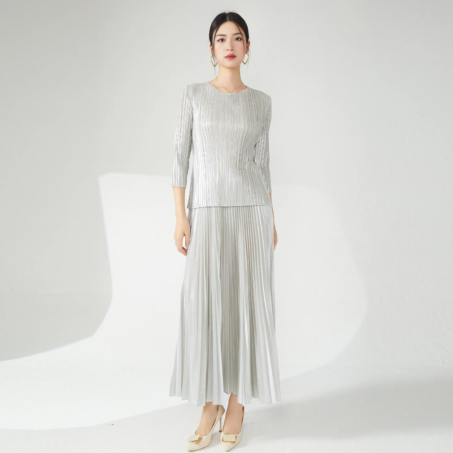 Miyake High Quality Women's Casual Style Two-Piece Set Fashionable Elastic Top and Ankle Length Pleated Skirt Print Decoration