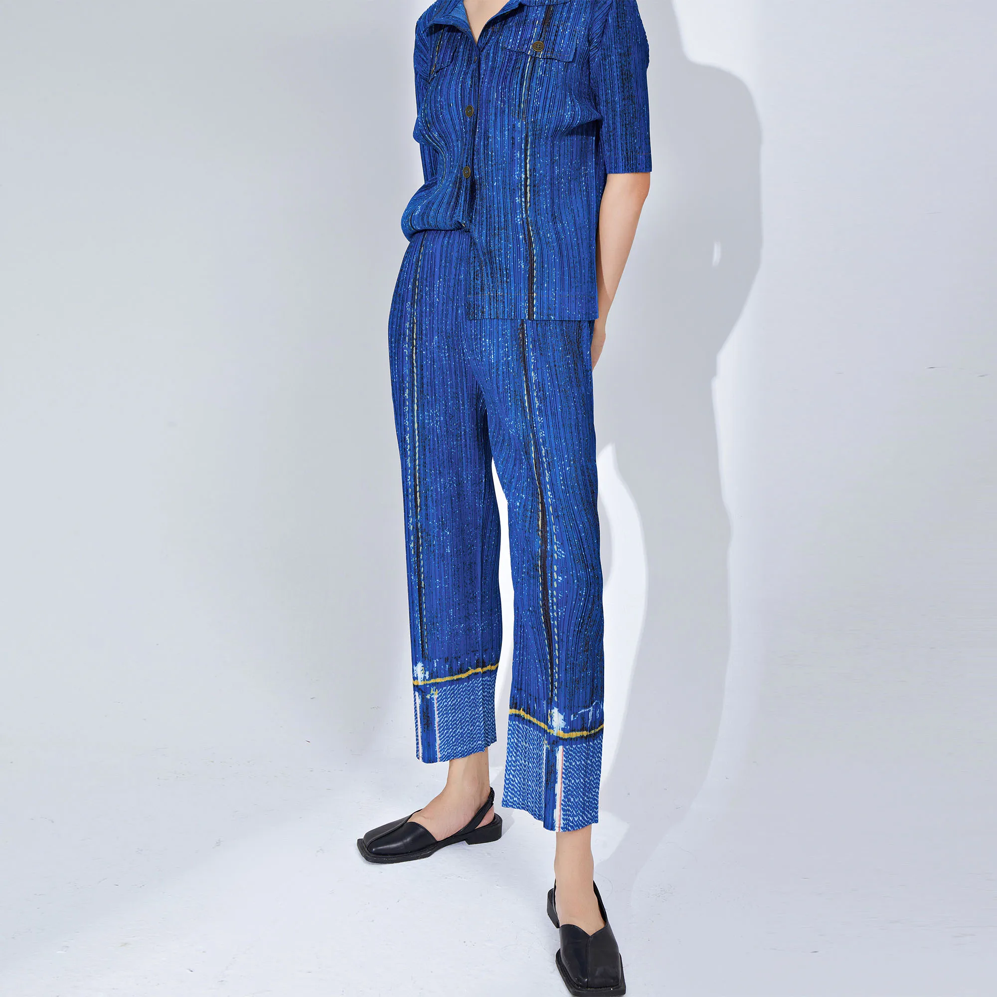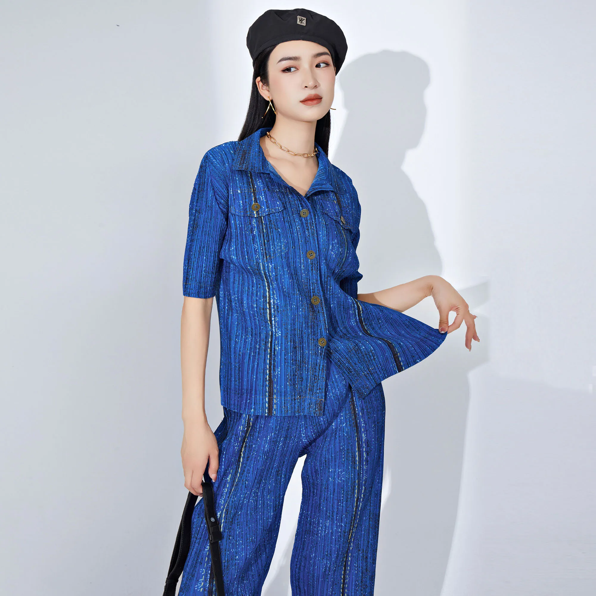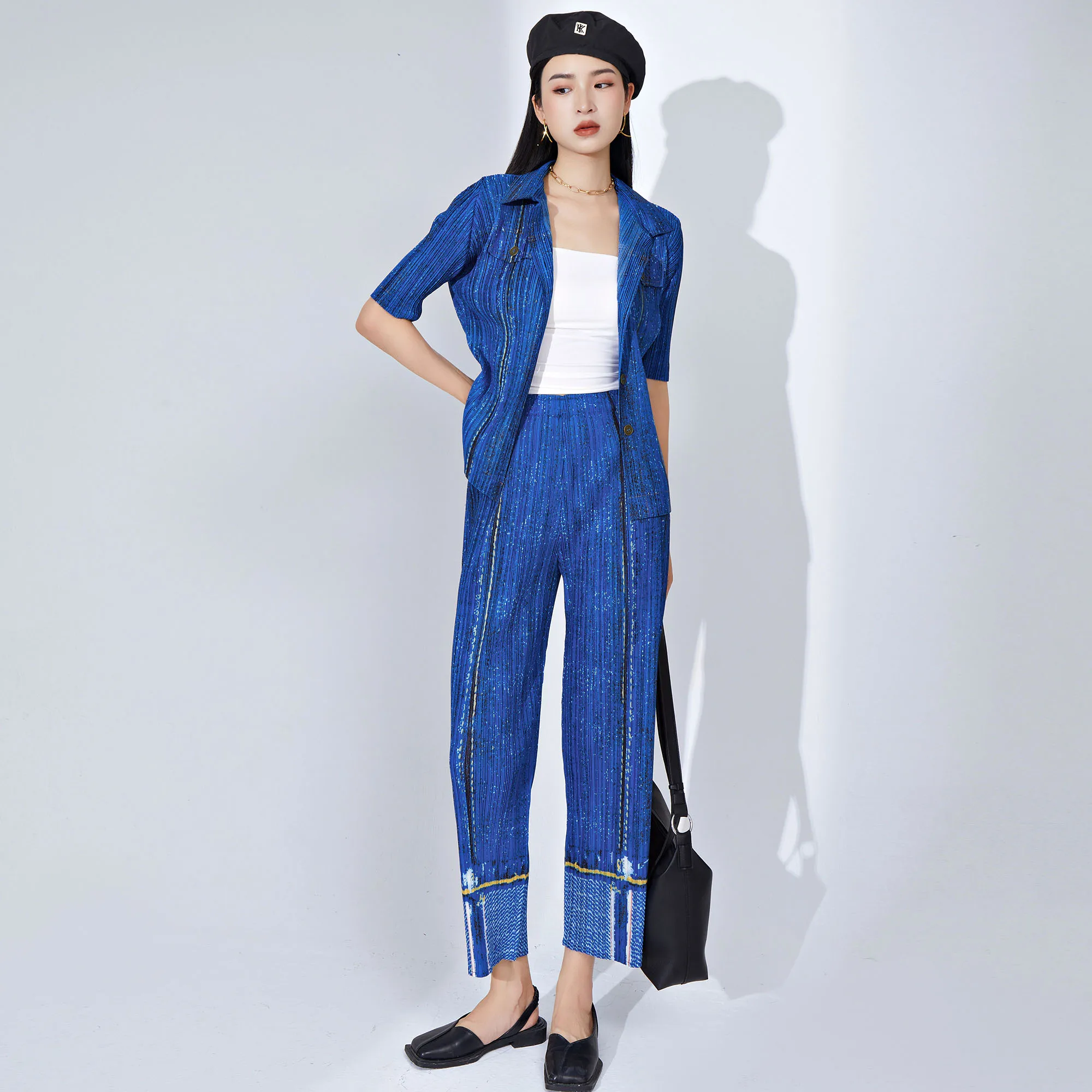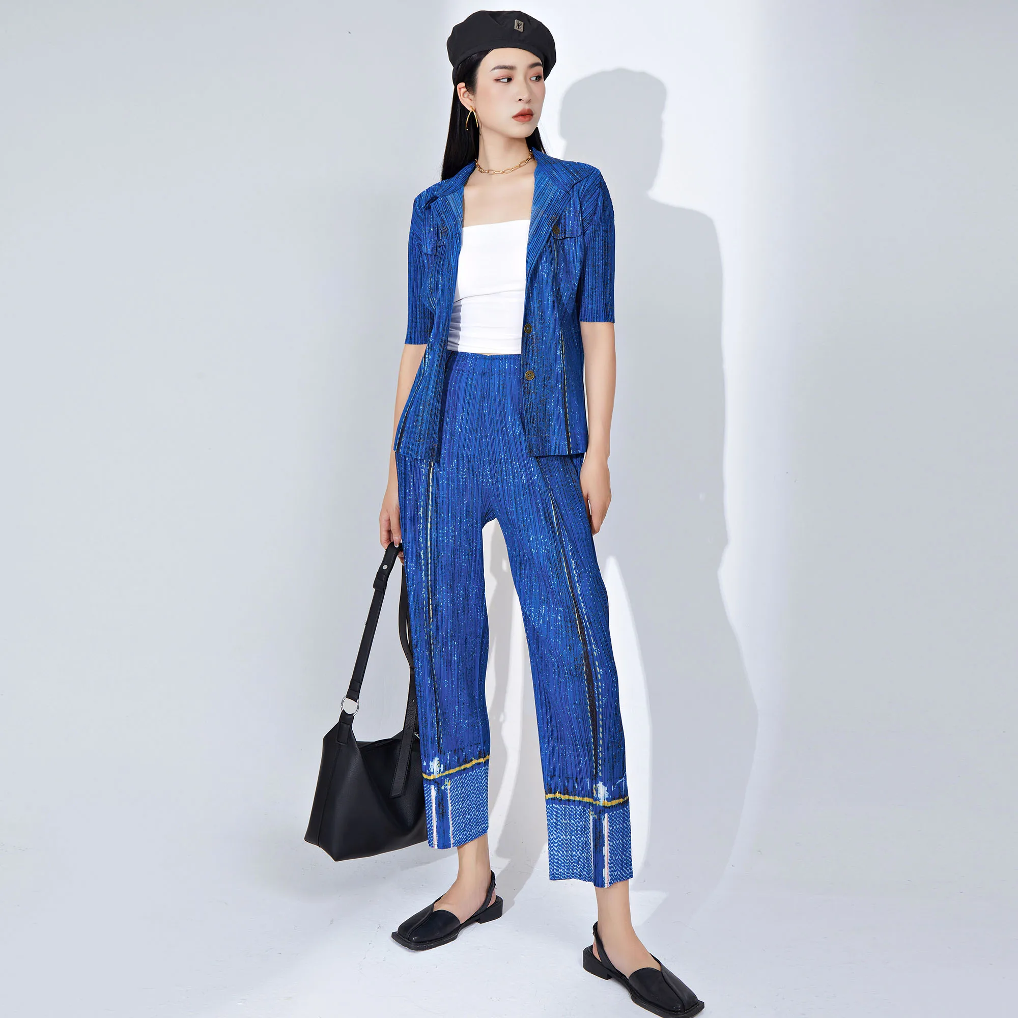 Women's Denim Style Pleated Set Fashionable 2-Piece Outfit With Single-Breasted Short-Sleeve Cardigan Top and Pleated Long Pants