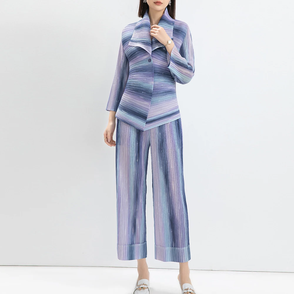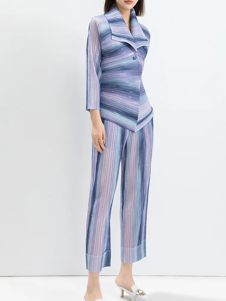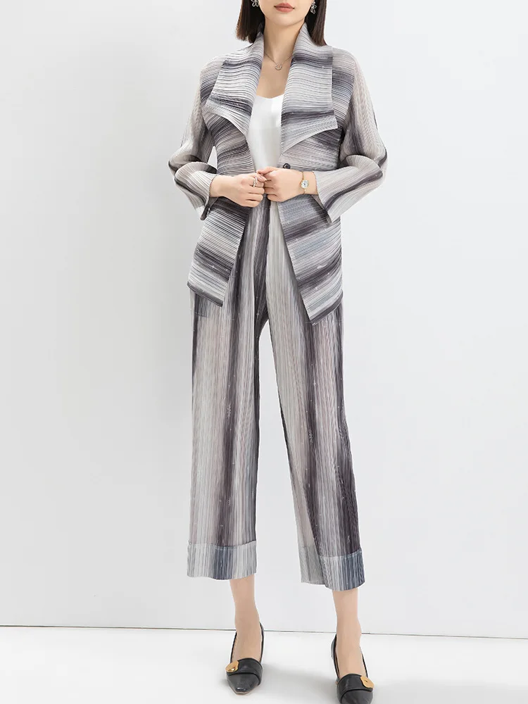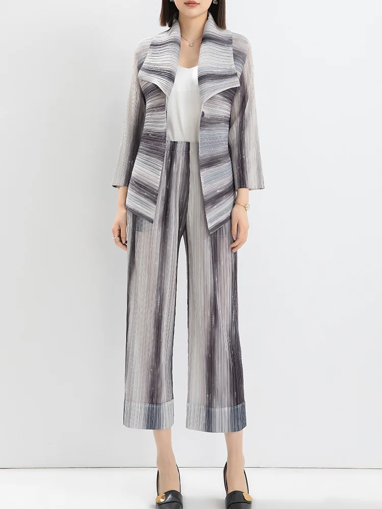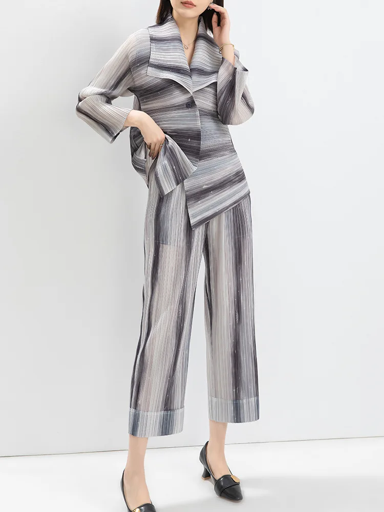 Women's Casual Striped Printed Pleated Lapel Stretch Top and High Waisted Straight Pants Office Fashion Two Piece Office Suit