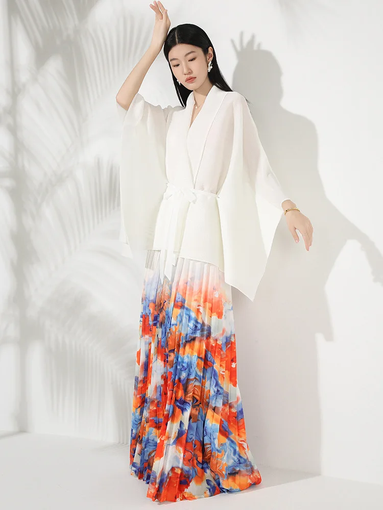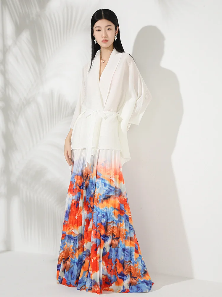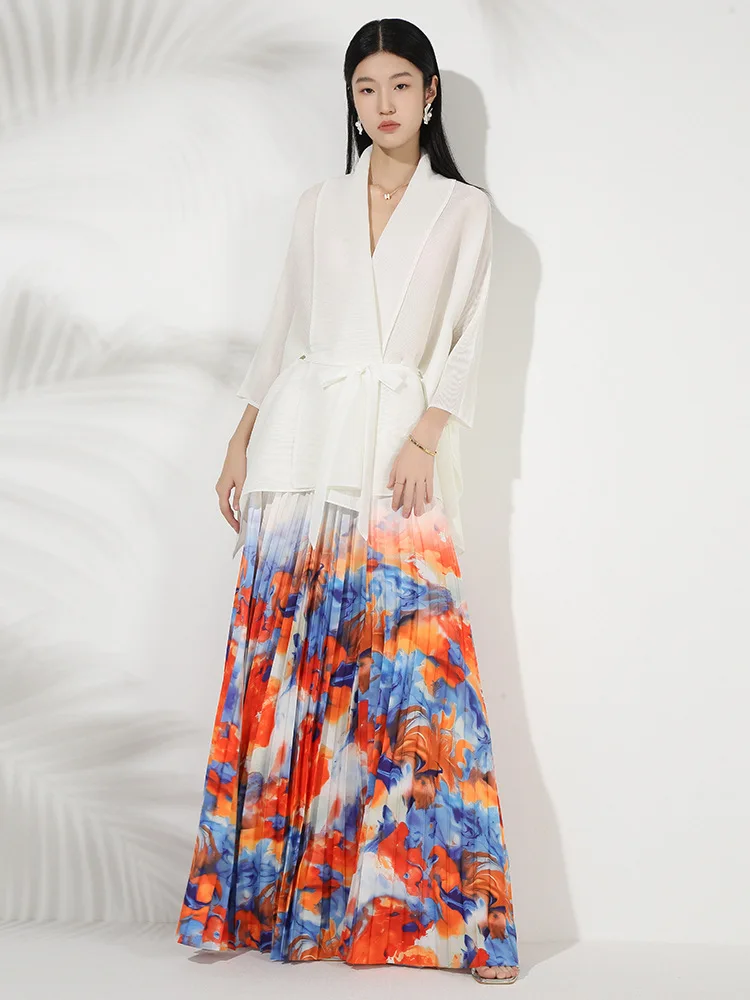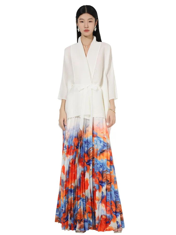 Premium Quality Quick Shipping Miyake Pleated Suit Women's Loose Casual Dress Top and Printed Skirt Two Piece Set
