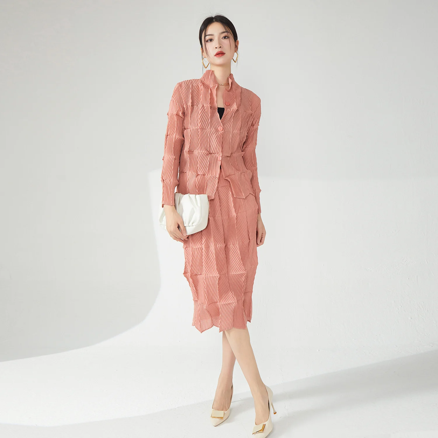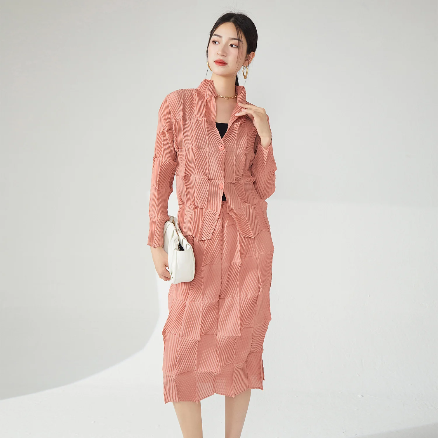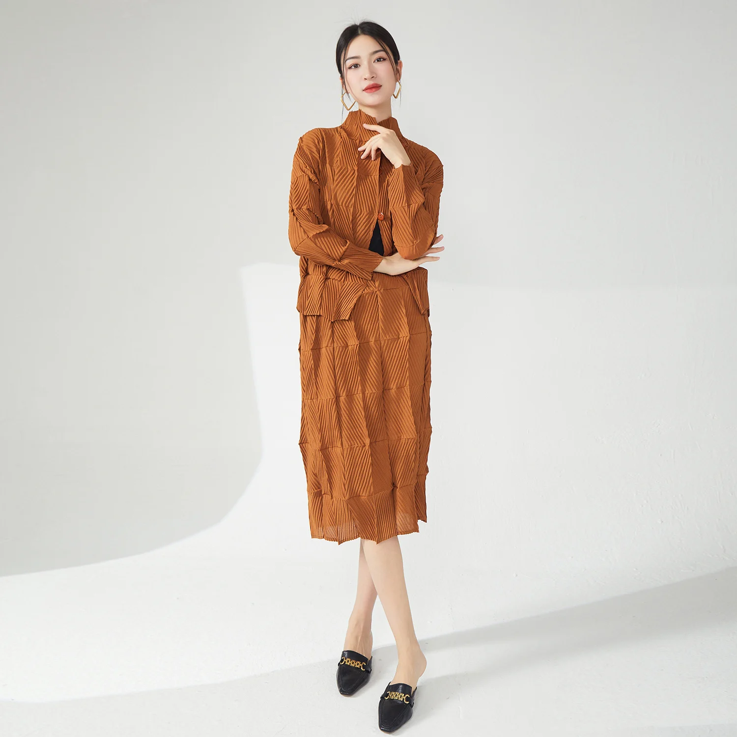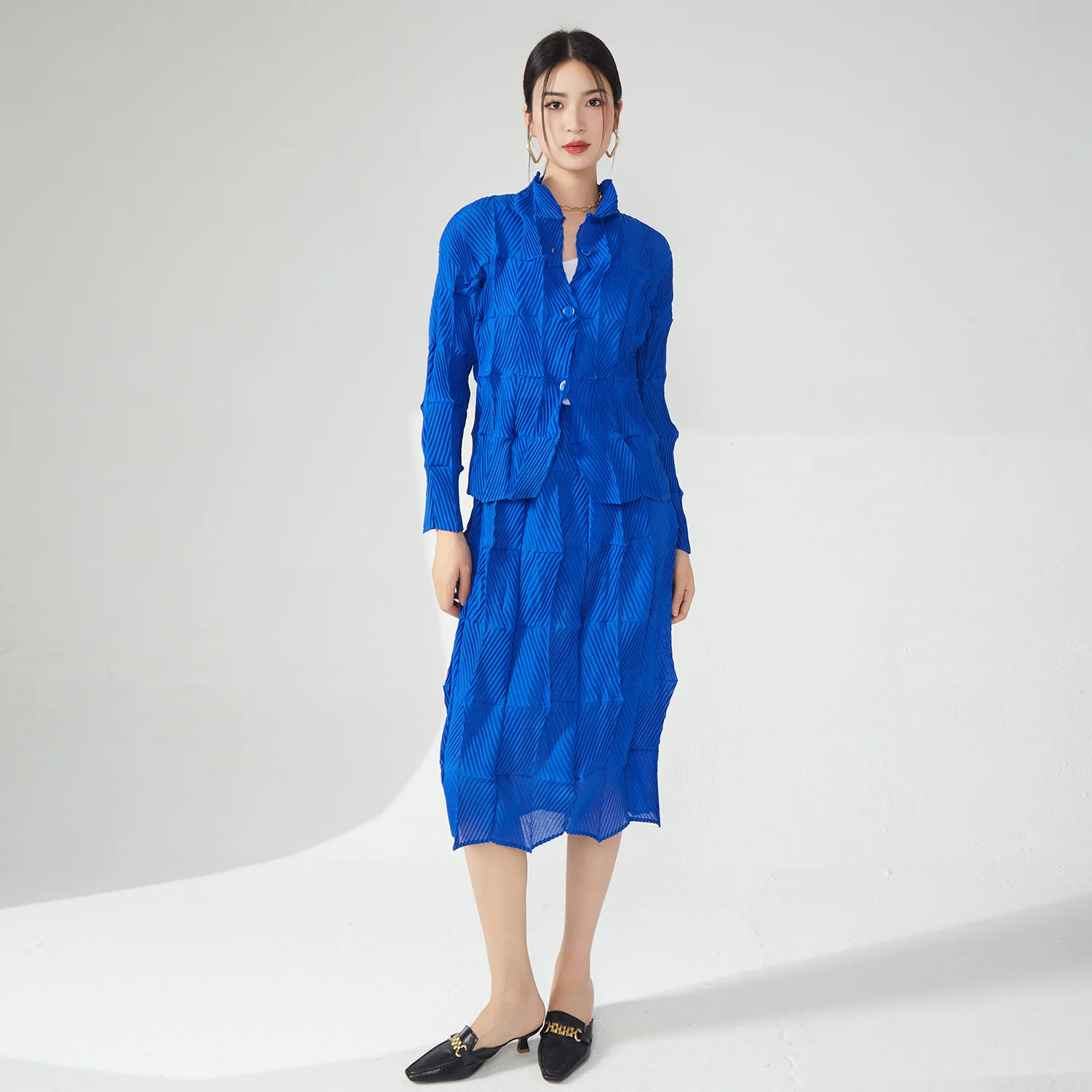 Miyake Women's Casual Two-Piece Set Pleated Design Stretch Long Sleeve Top and Skirt Set