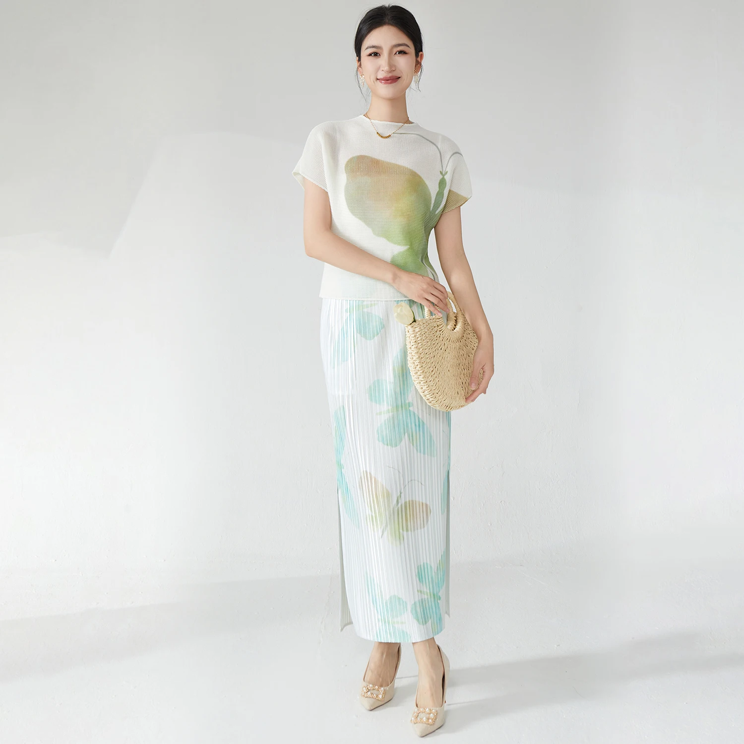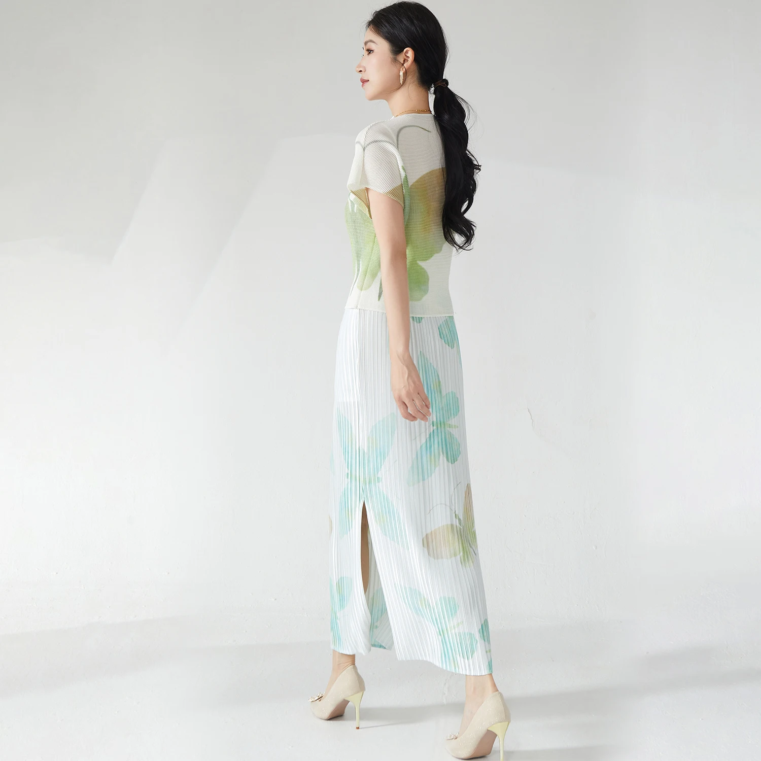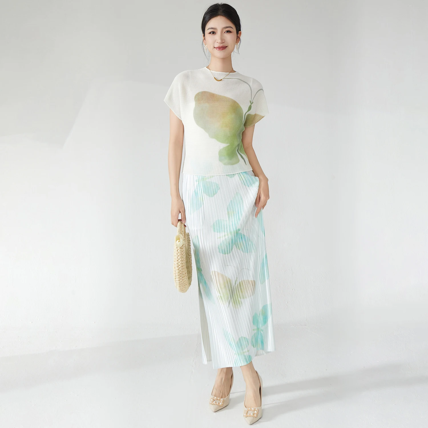 New Arrival 2025 Women's Elegant Set Designer Short Sleeve Top and Skirt Two Piece Set Polyester Miyake Pleated Set