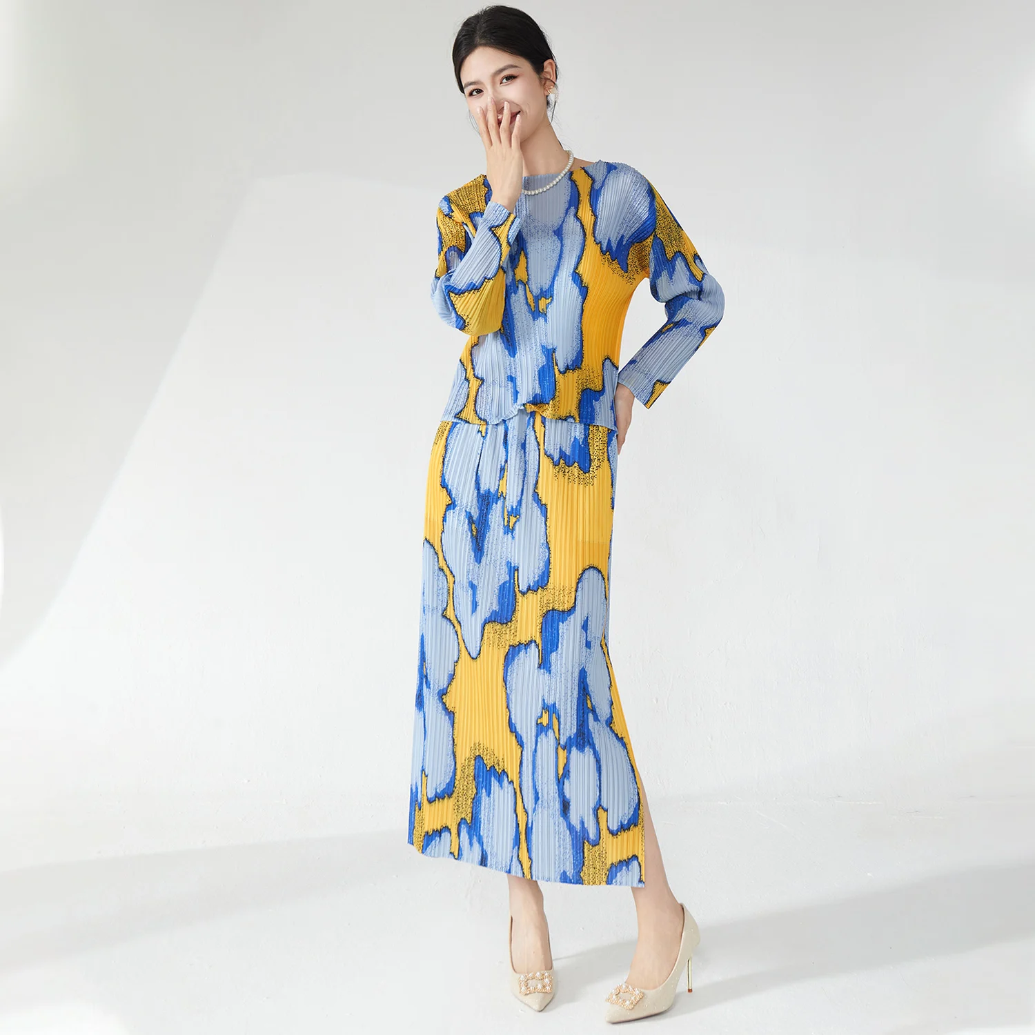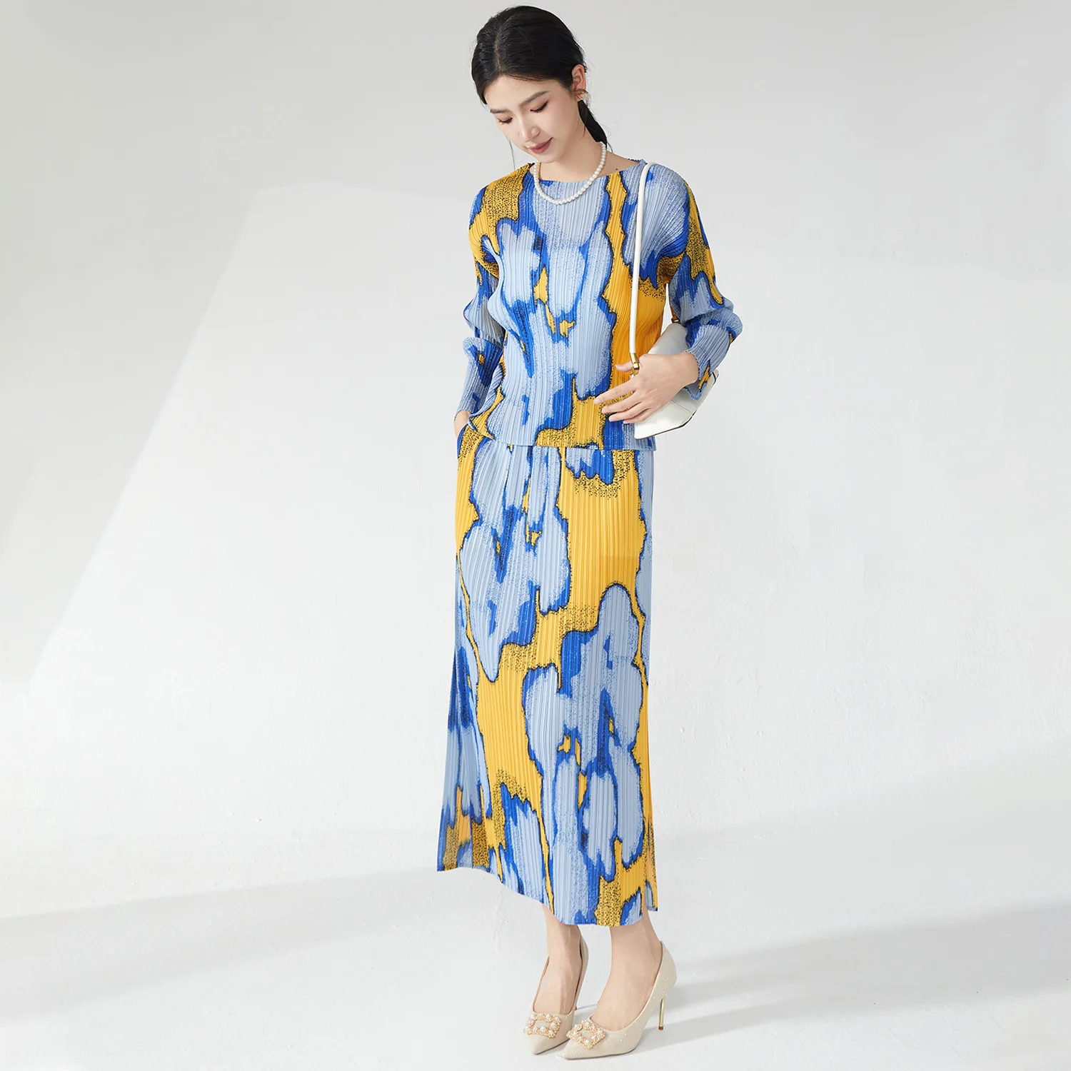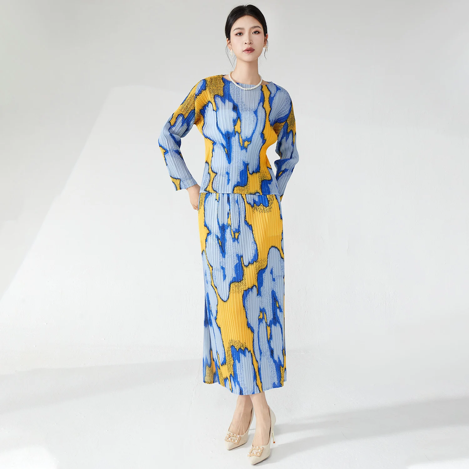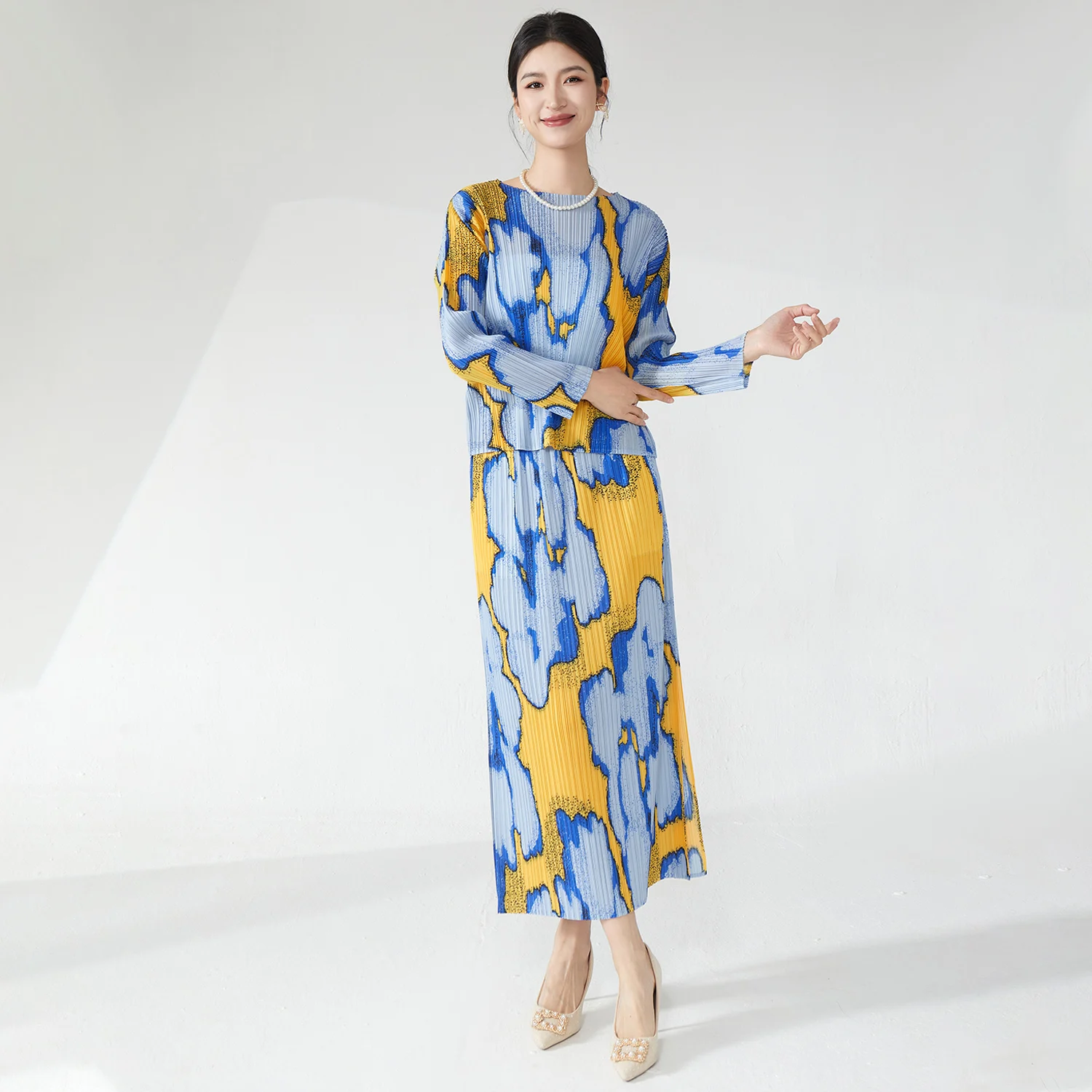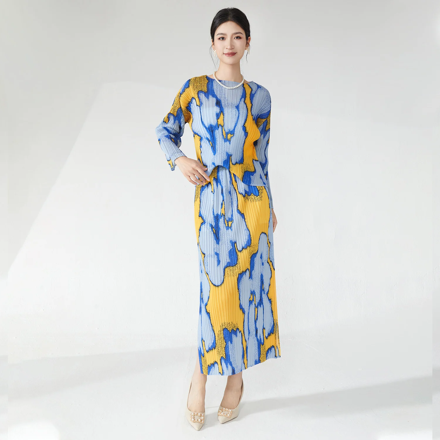 High Quality Women's Clothing 2025 New Style Printed Fashion T-Shirt and Skirt Two Piece Miyake Pleated Set