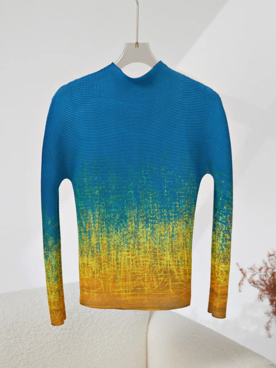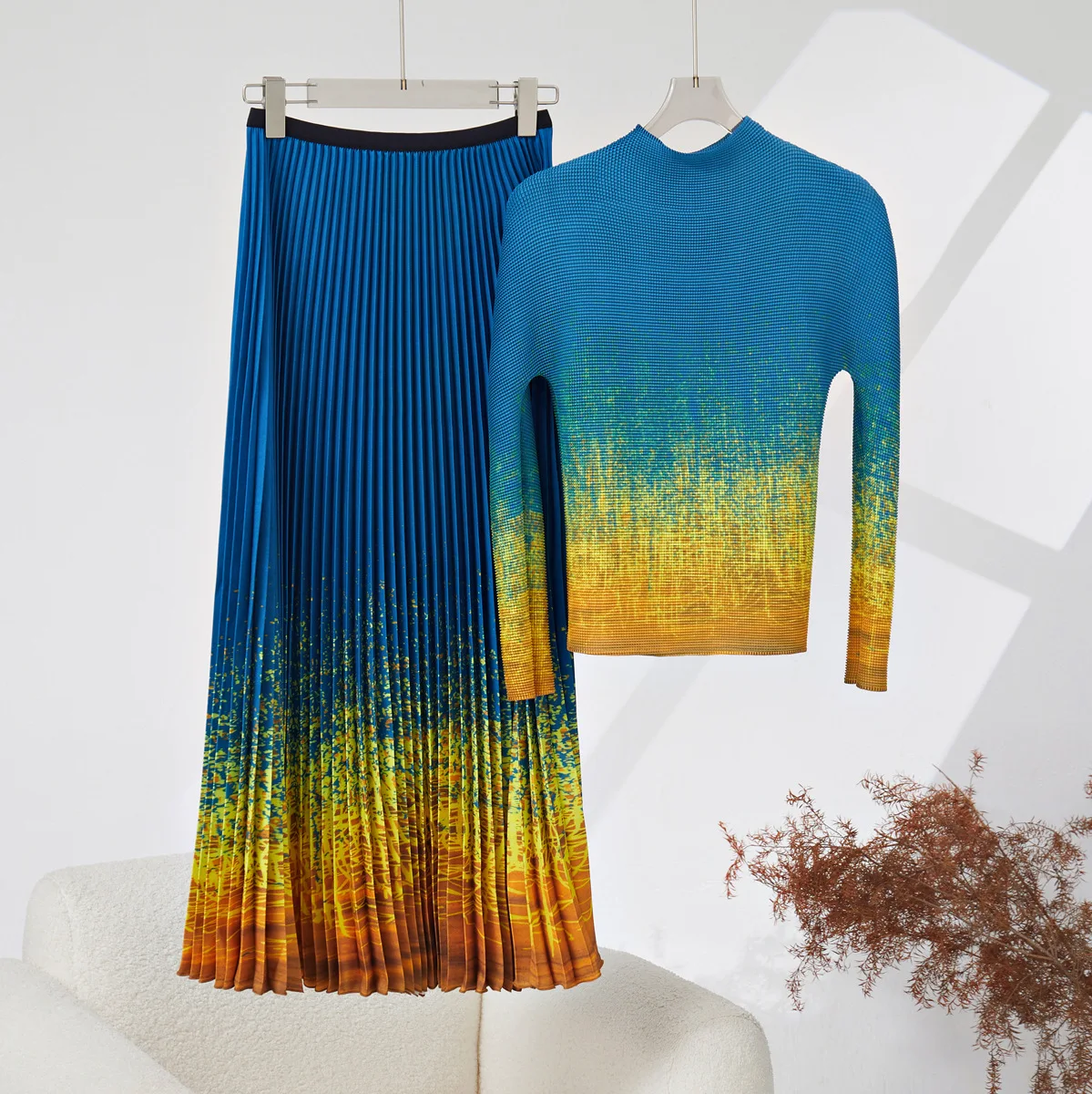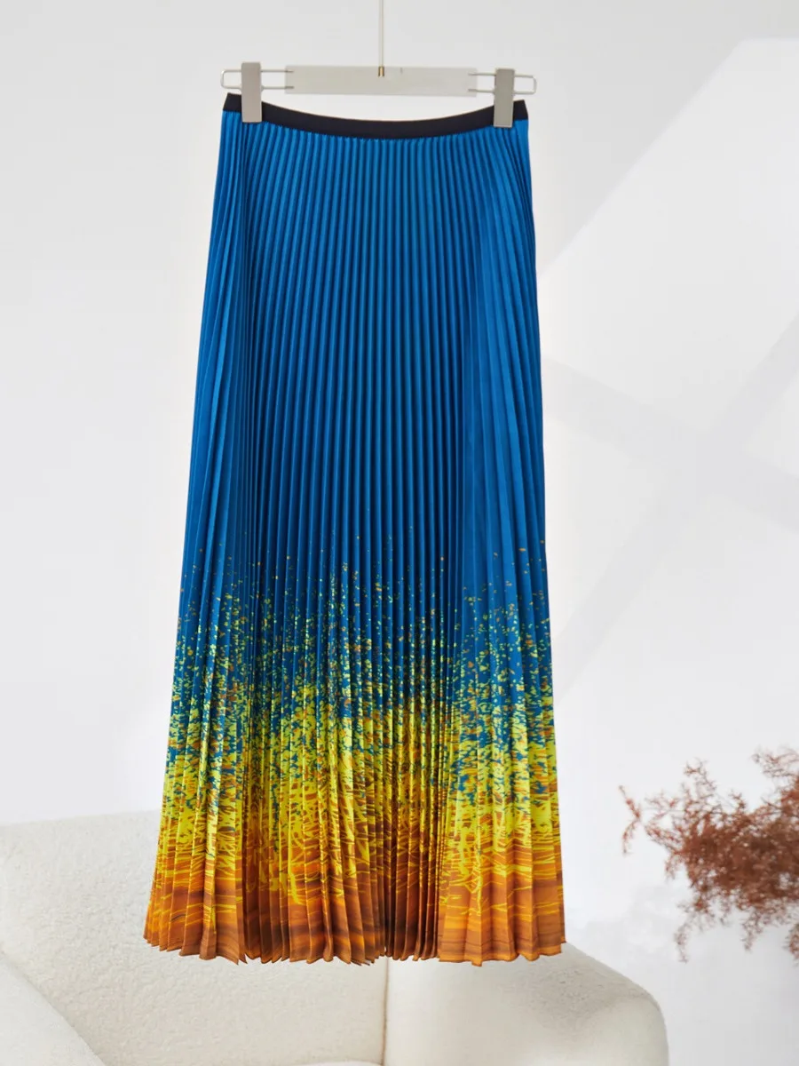 Women's High Quality Pleated Suit Fashionable Elastic Gradient Top and Long Skirt Casual Two-Piece Set With Print Fabric