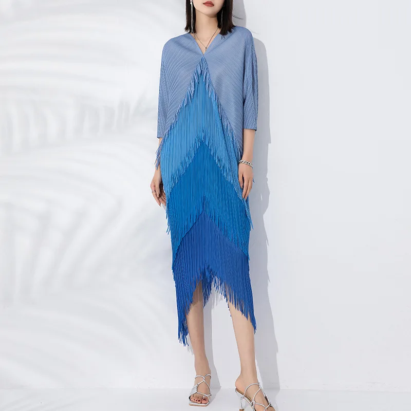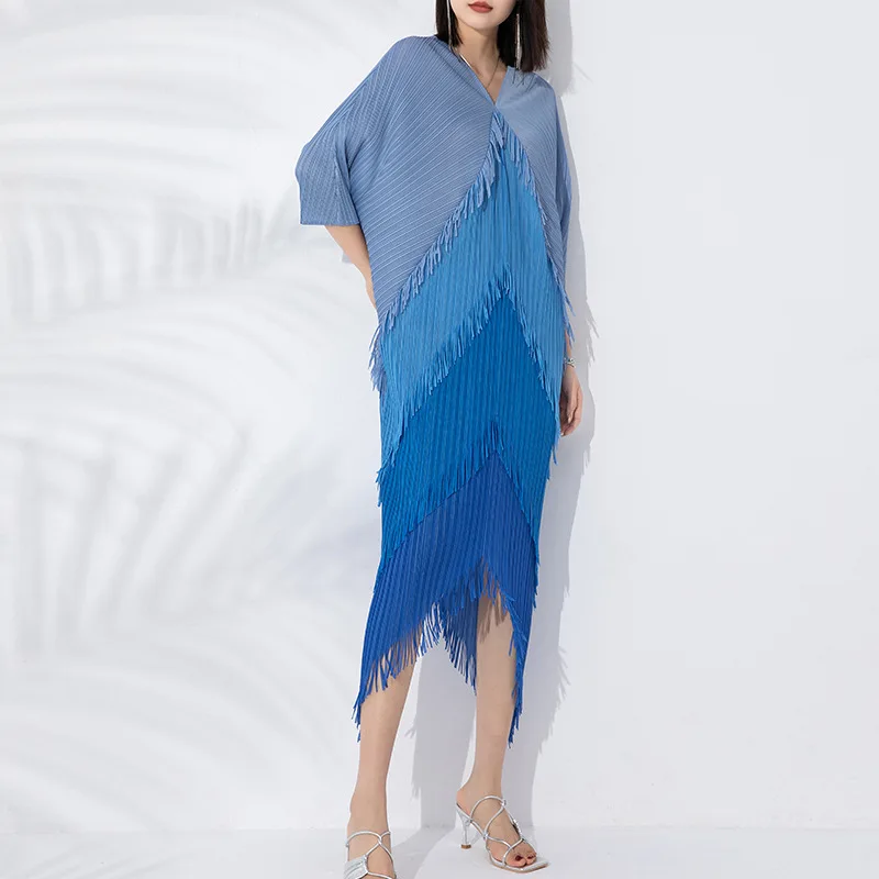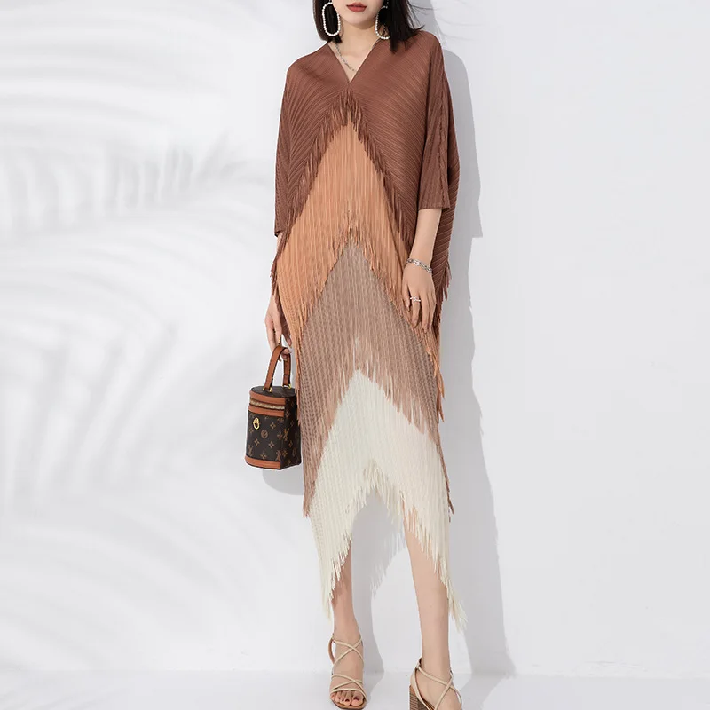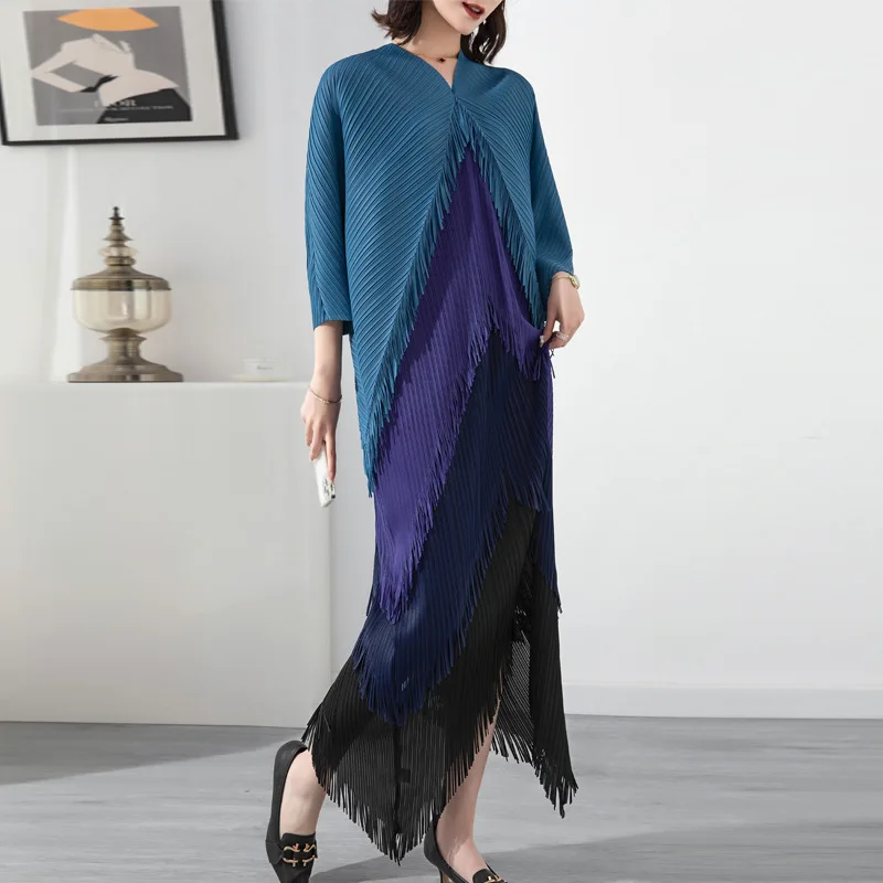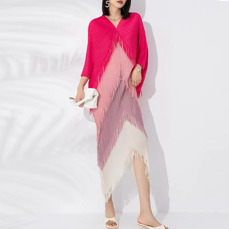 Miyake Pleated Dress 2025 Latest Popular Dress Fashion Tassel Stitching Colors Casual Style Women Bat Sleeve Dress