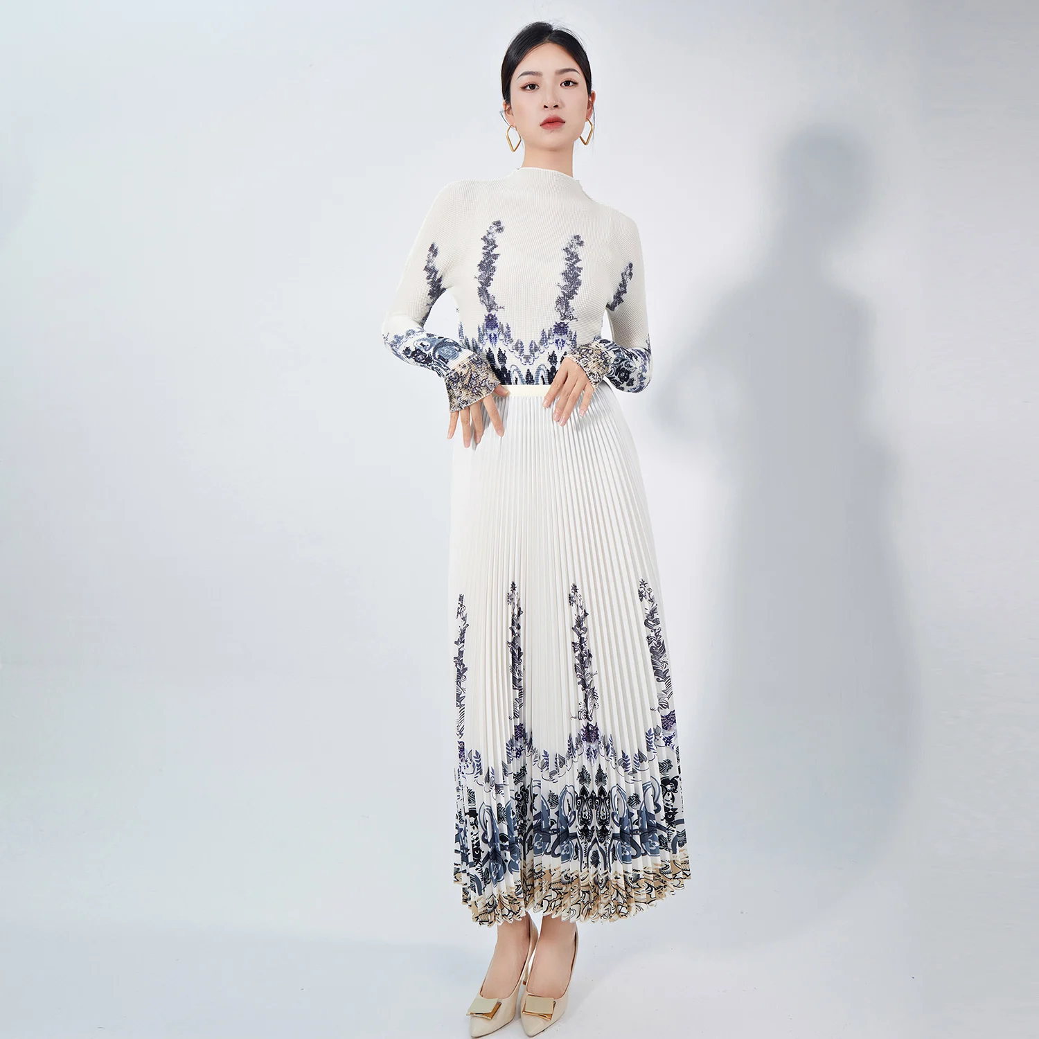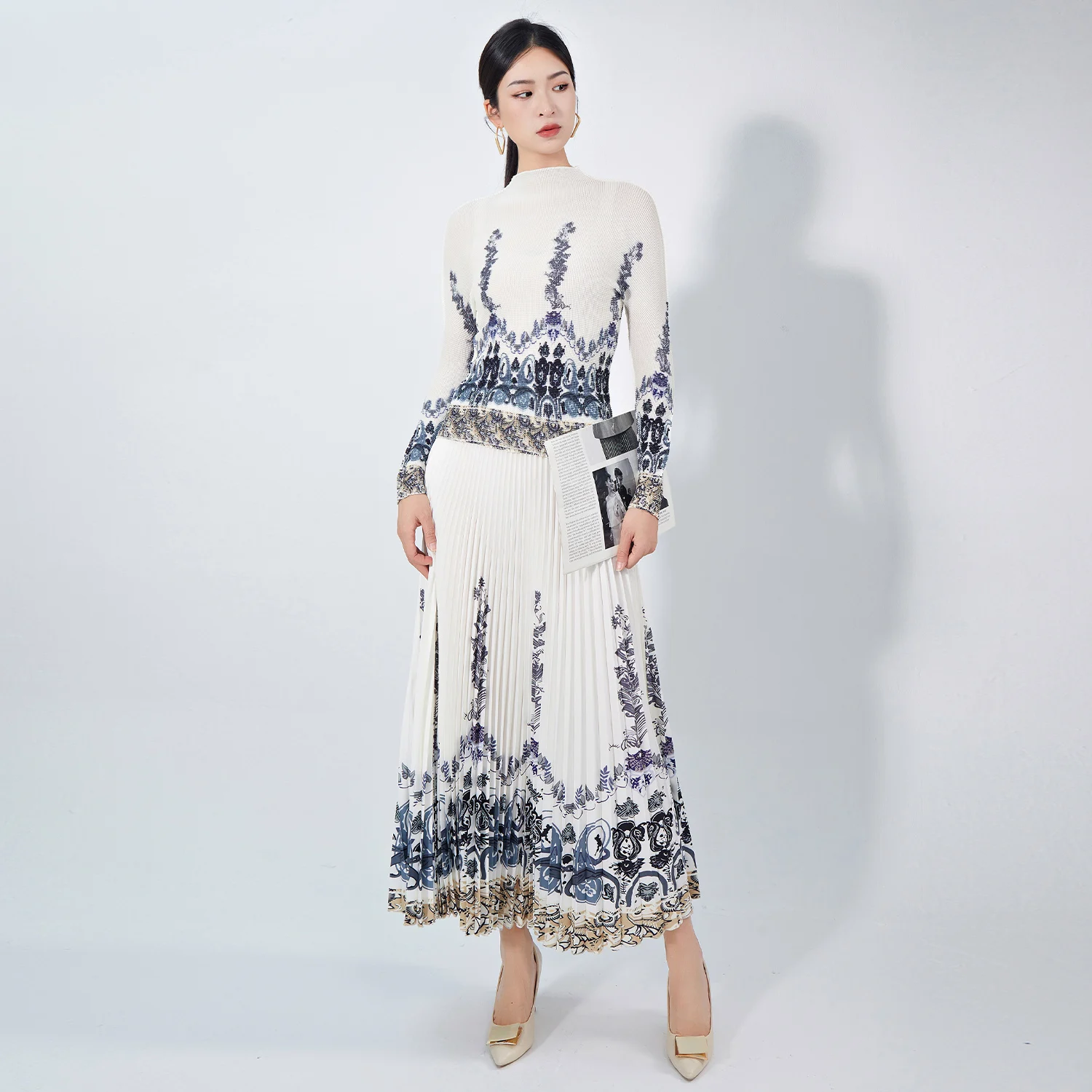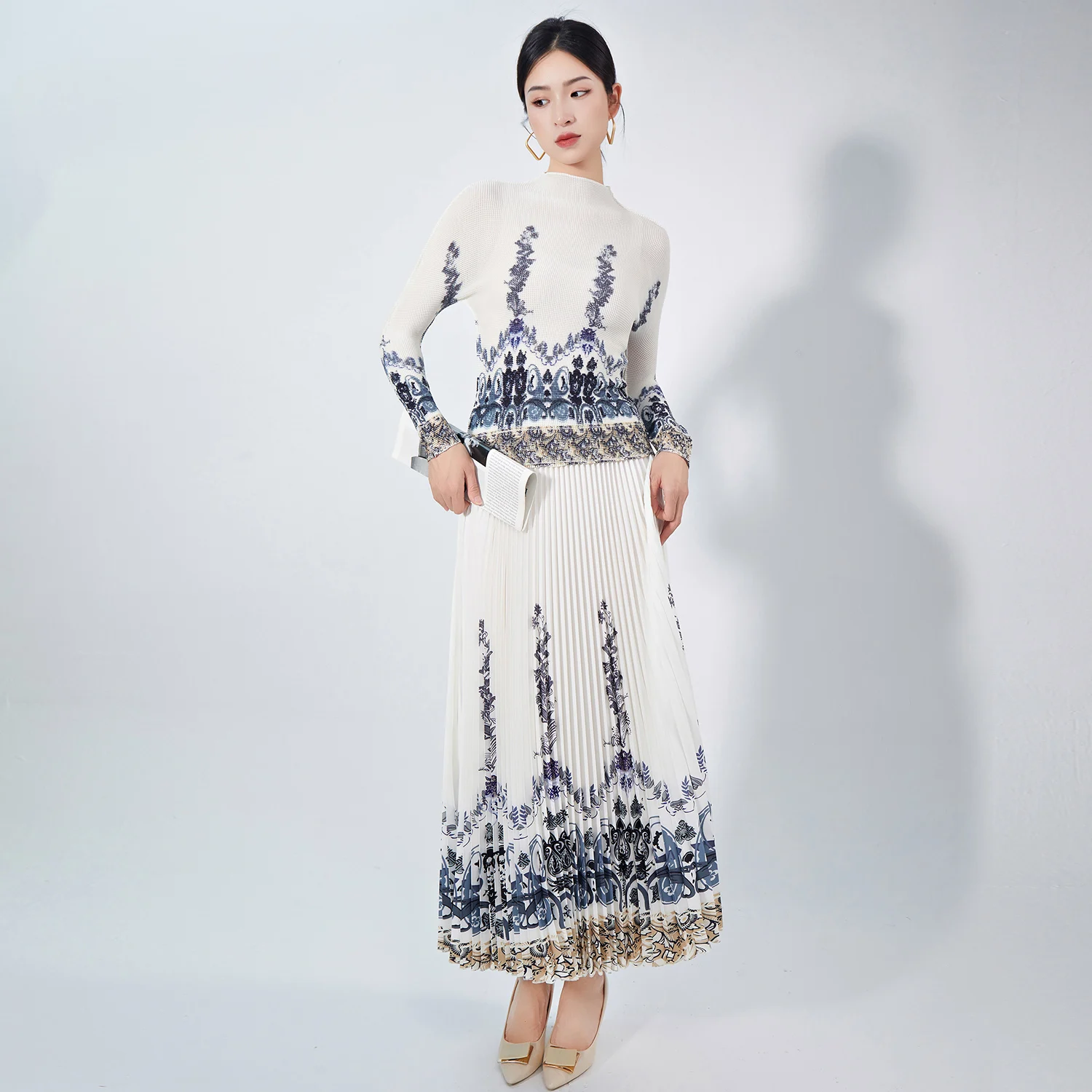 Latest Casual Style Elegant Two-Piece Set for Ladies Pleated Skirt Printed Top Turtleneck Polyester Fabric With Pattern Decor