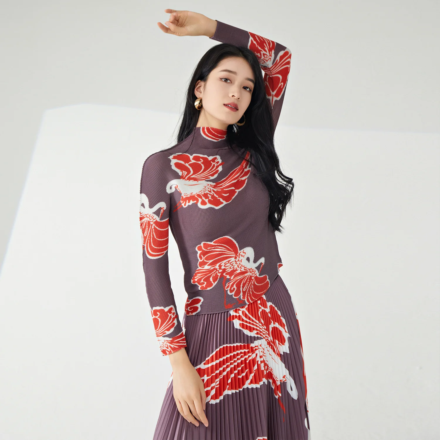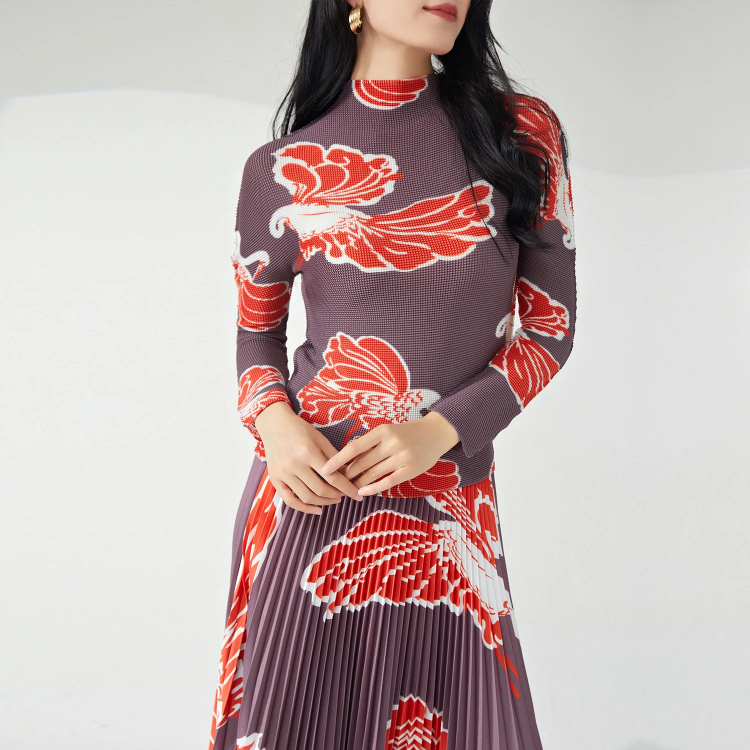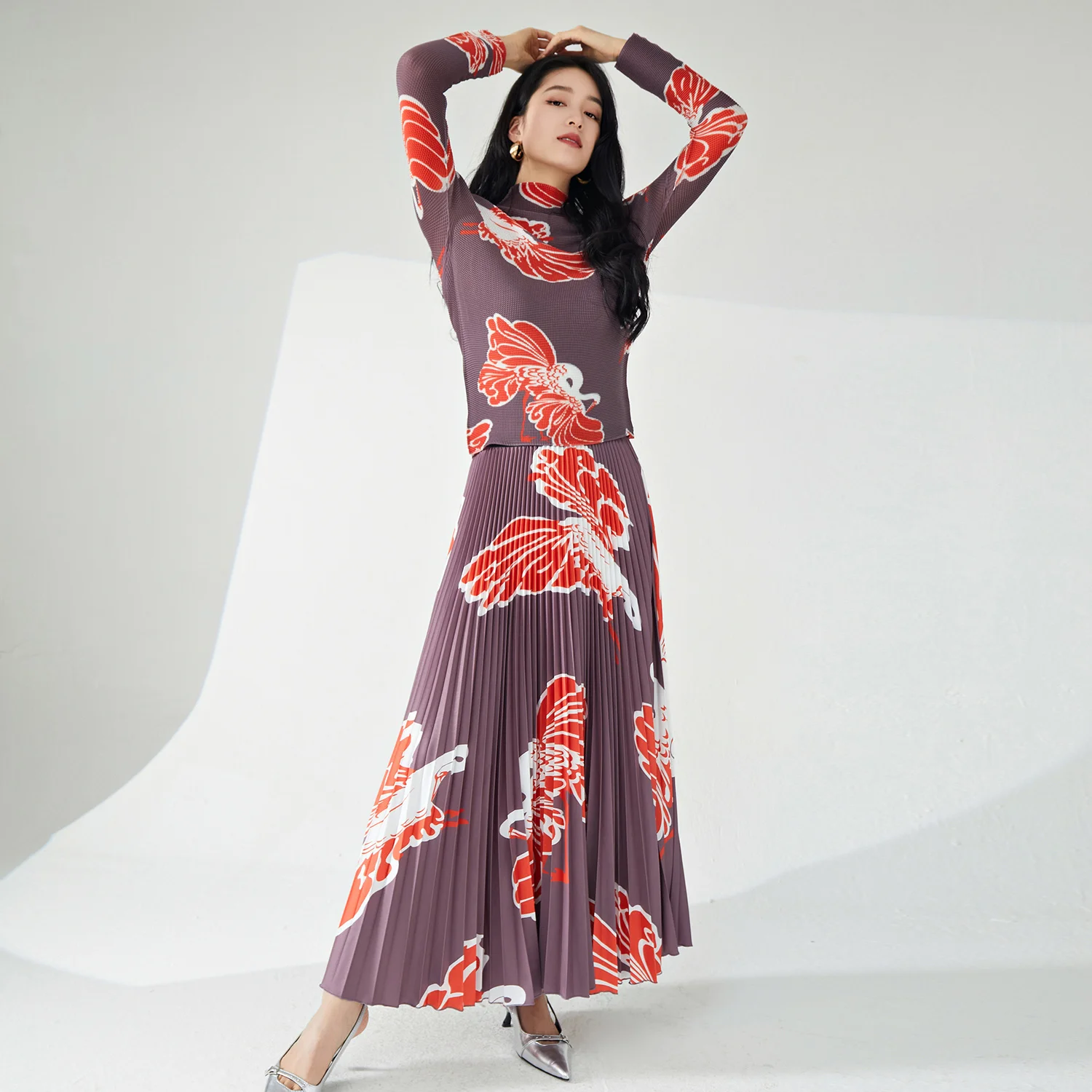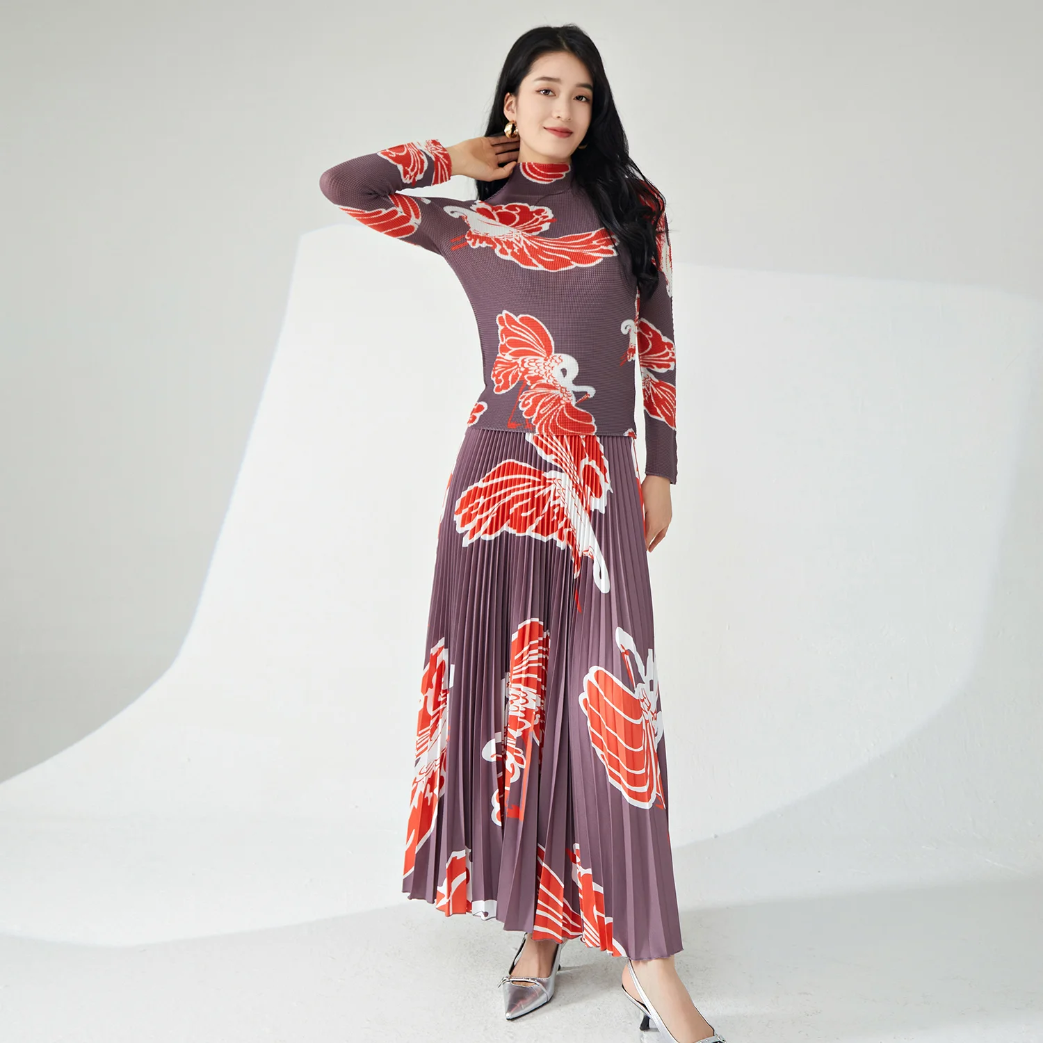 Miyake Women's Fashionable Two-Piece Set Pleated Stretch Fabric Long-Sleeved Top and Long Skirt Elegant Printed Design
