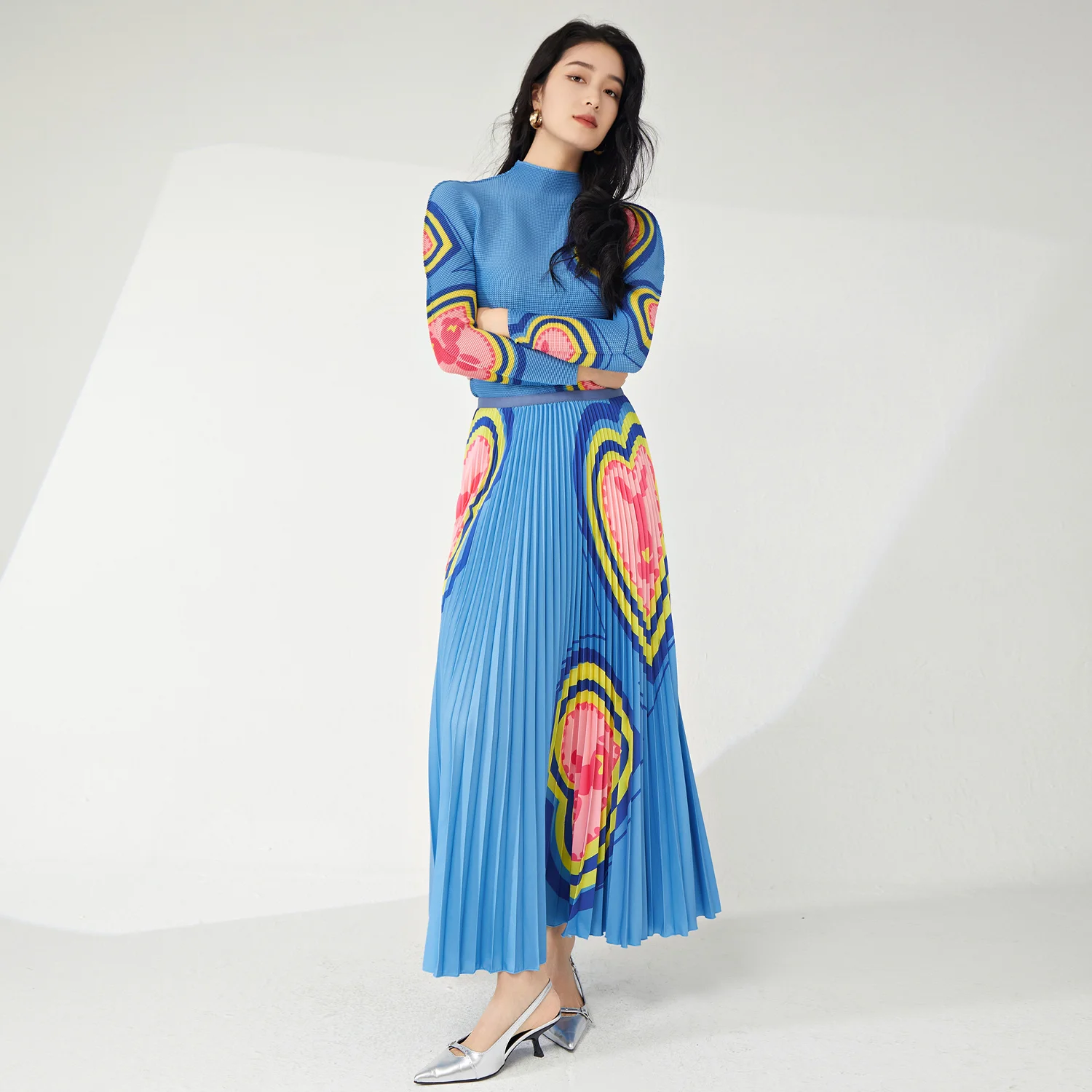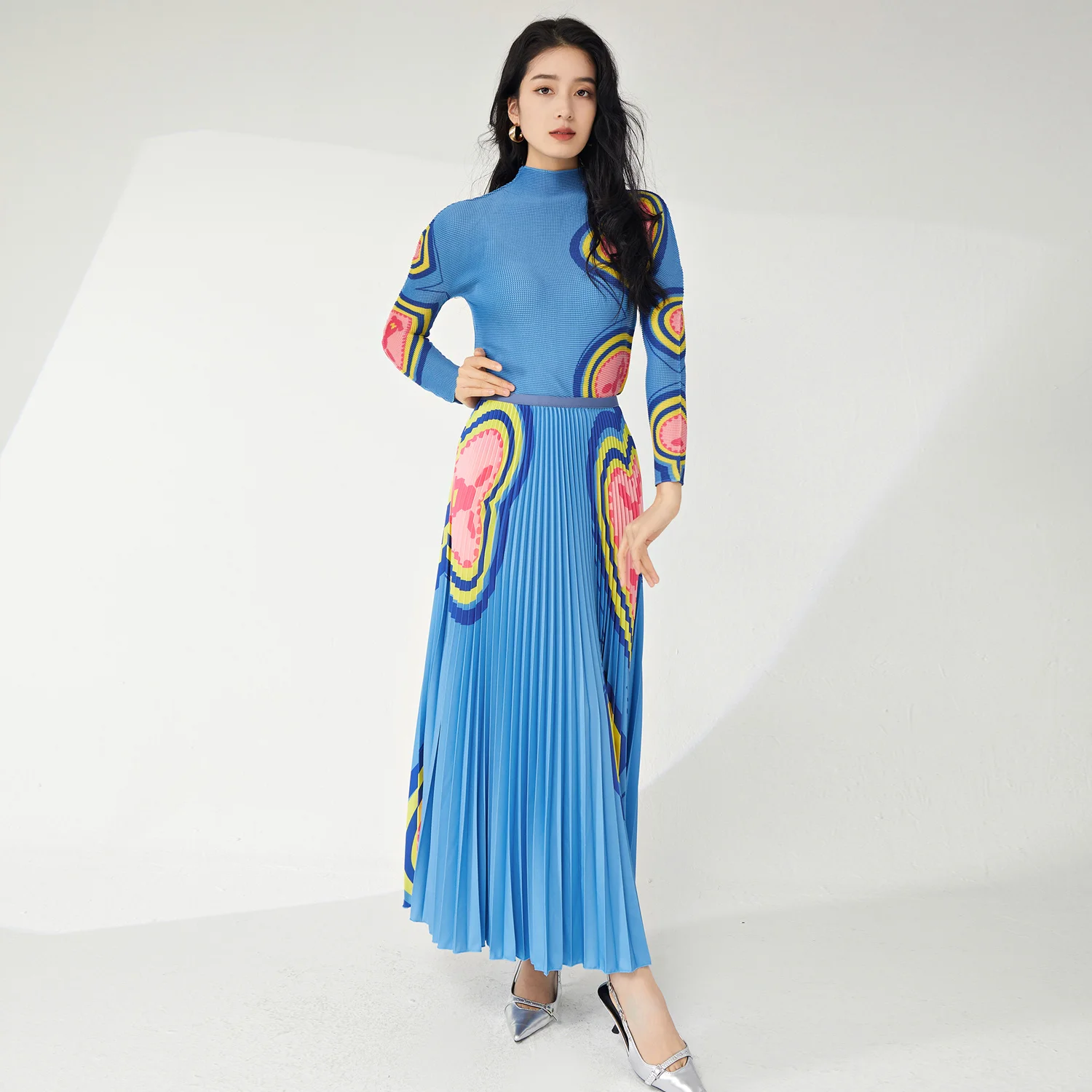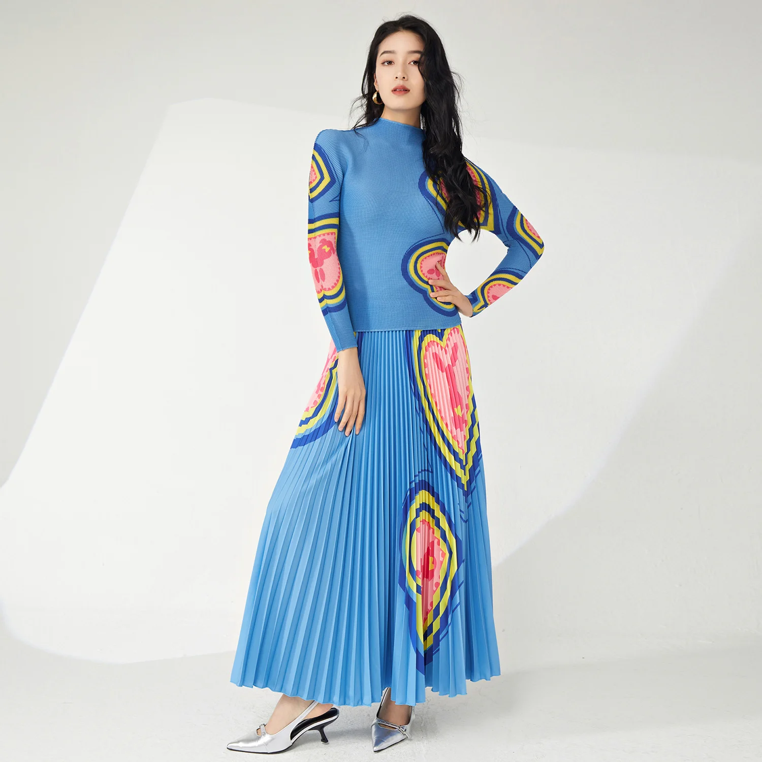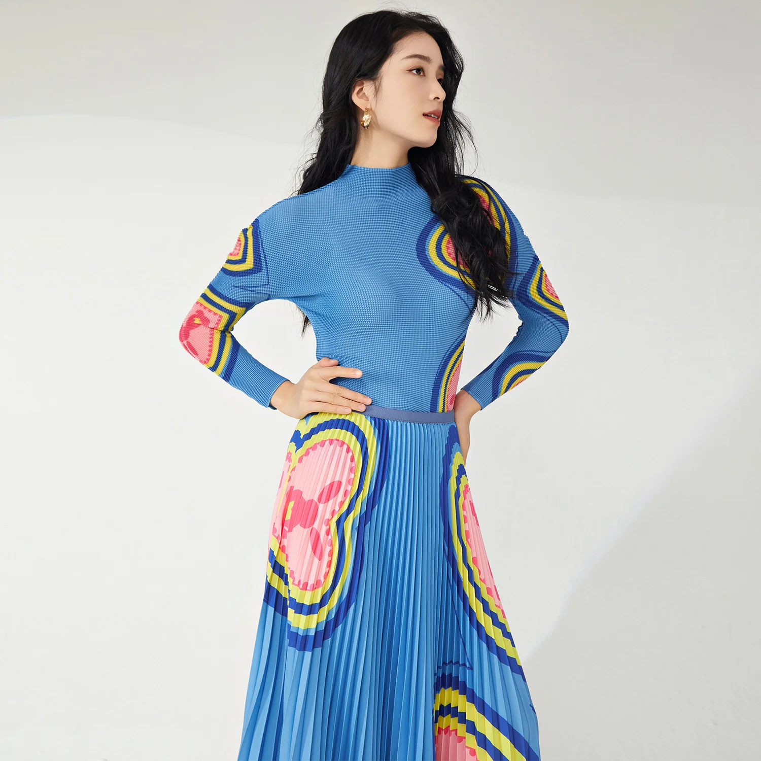 Miyake Women's Casual Stretch Polyester Suit Elegant Pleated Floral Print Two-Piece Set for Spring Fashion