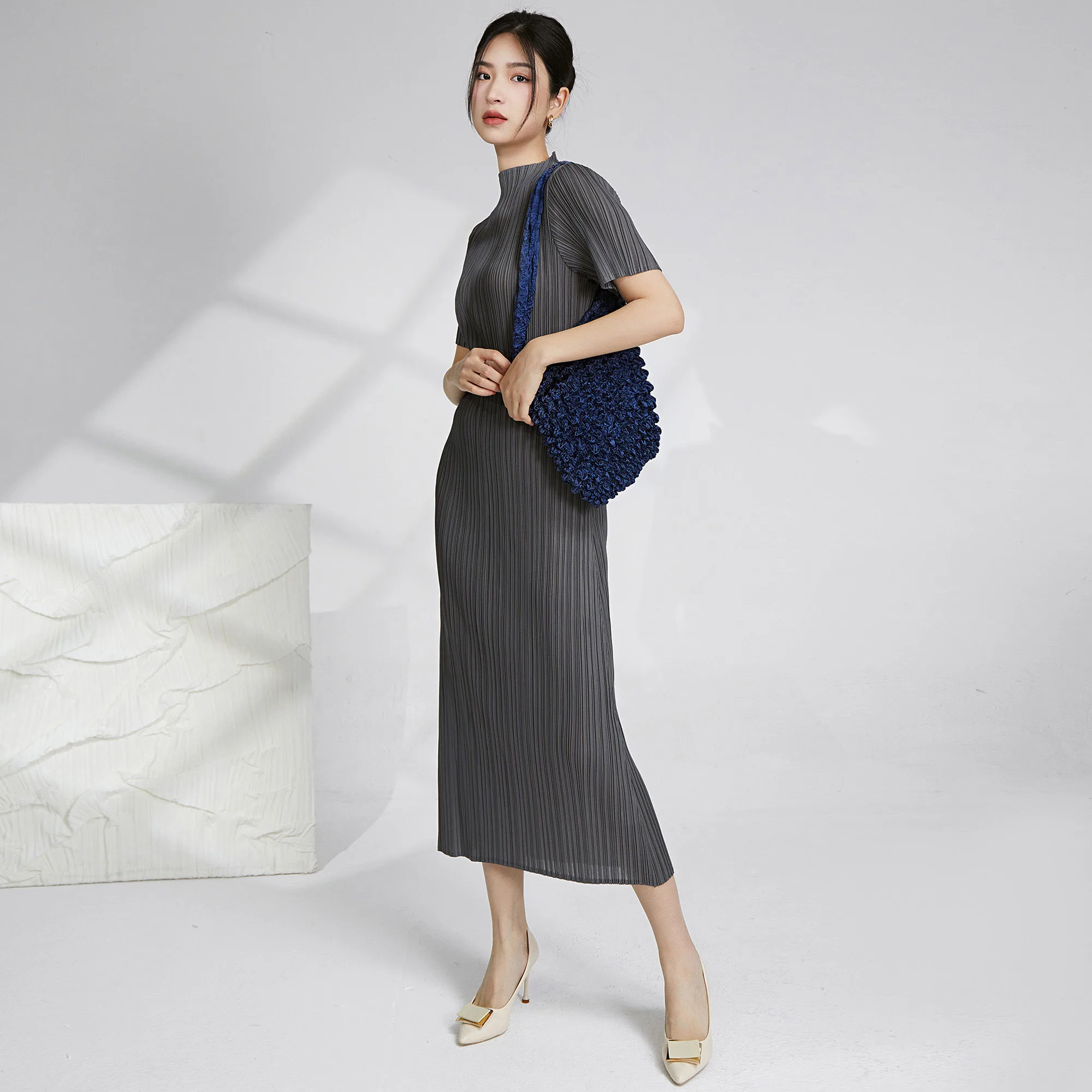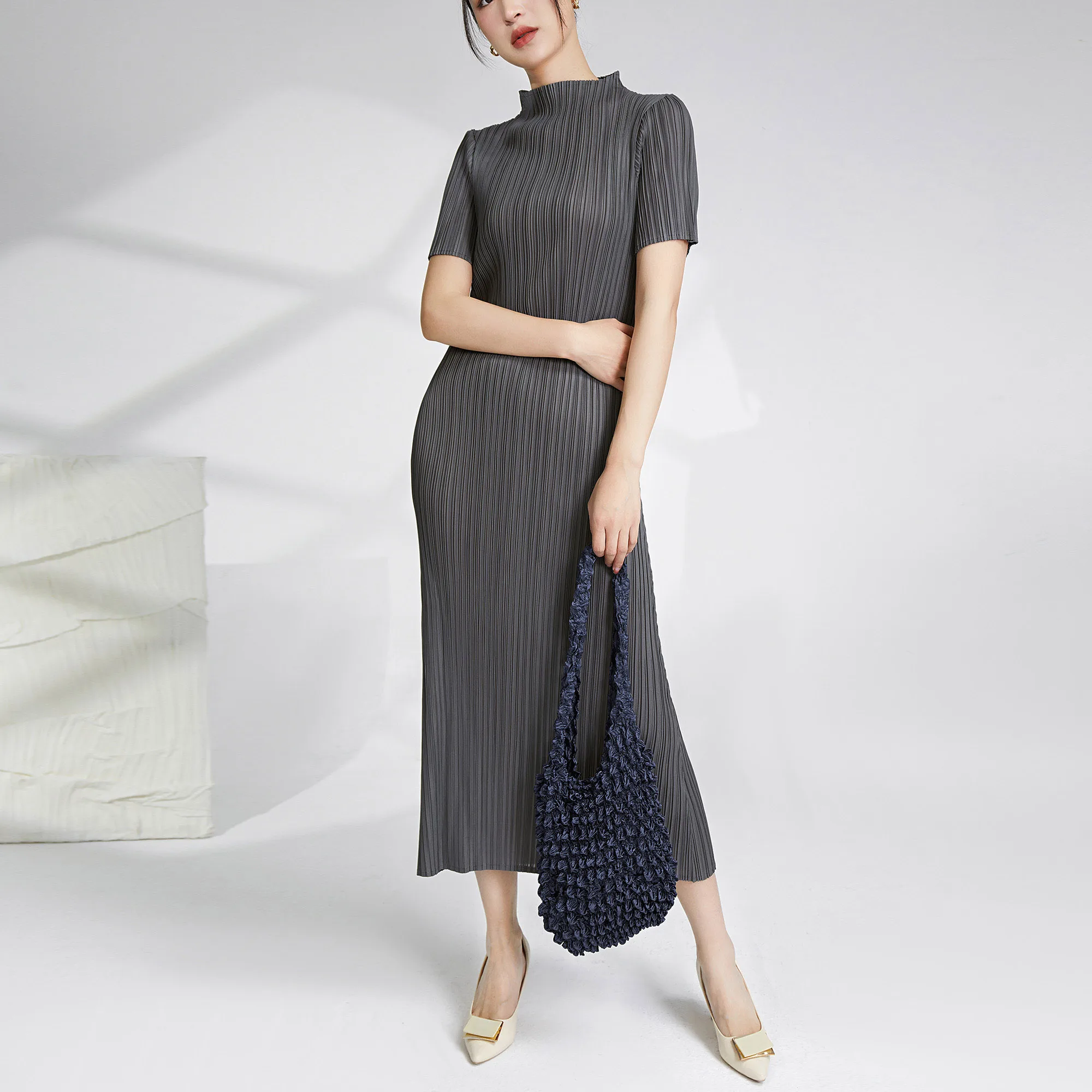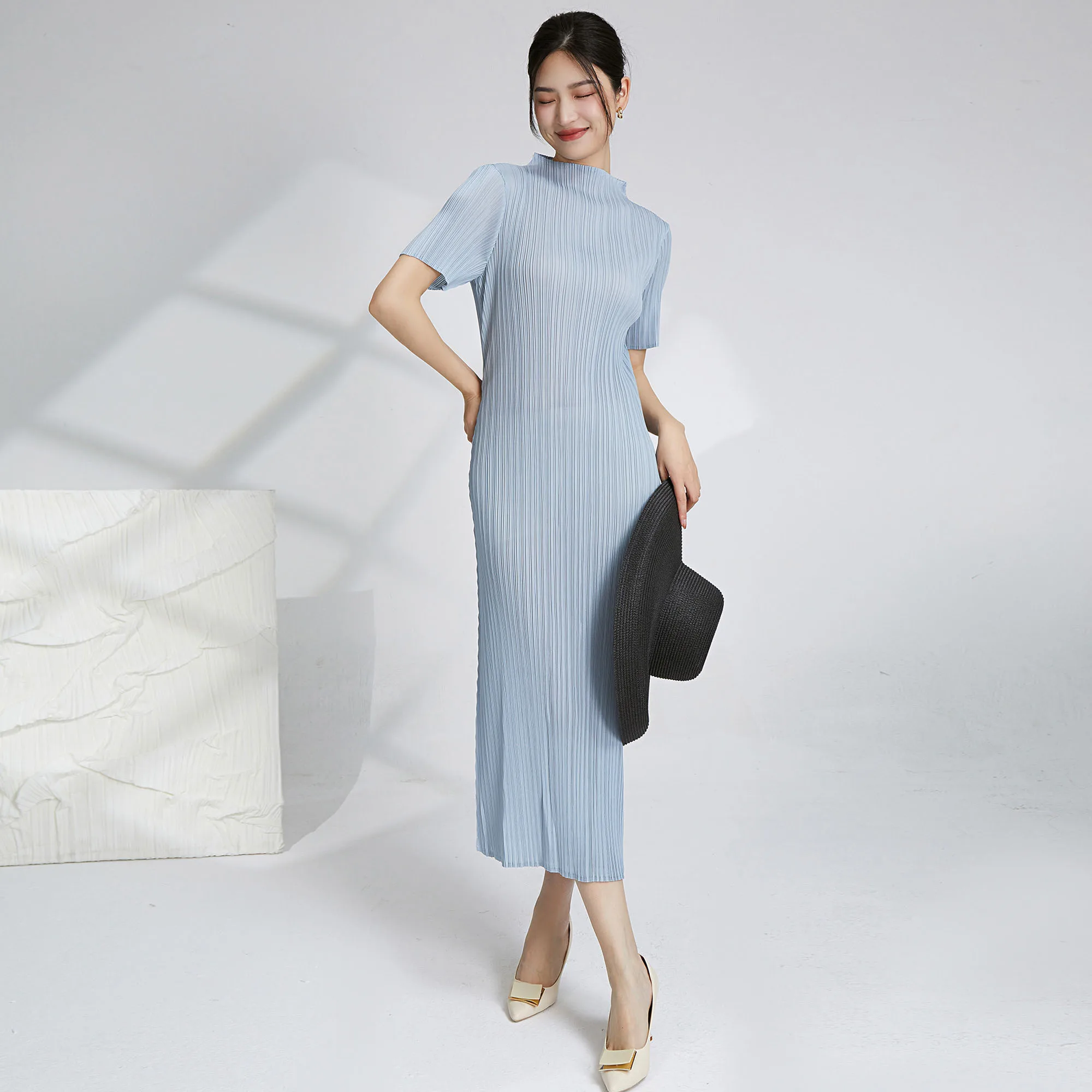 Miyake Pleated Casual Style Dress Woman Summer Half-high Collar Solid Color Short-sleeved Elegant Straight Long Dress