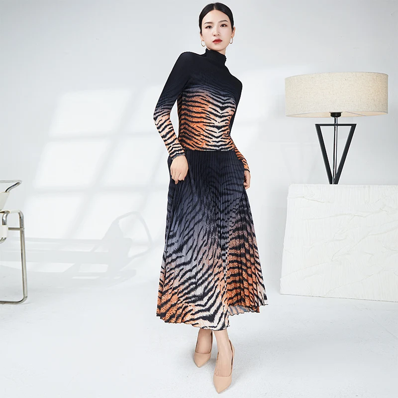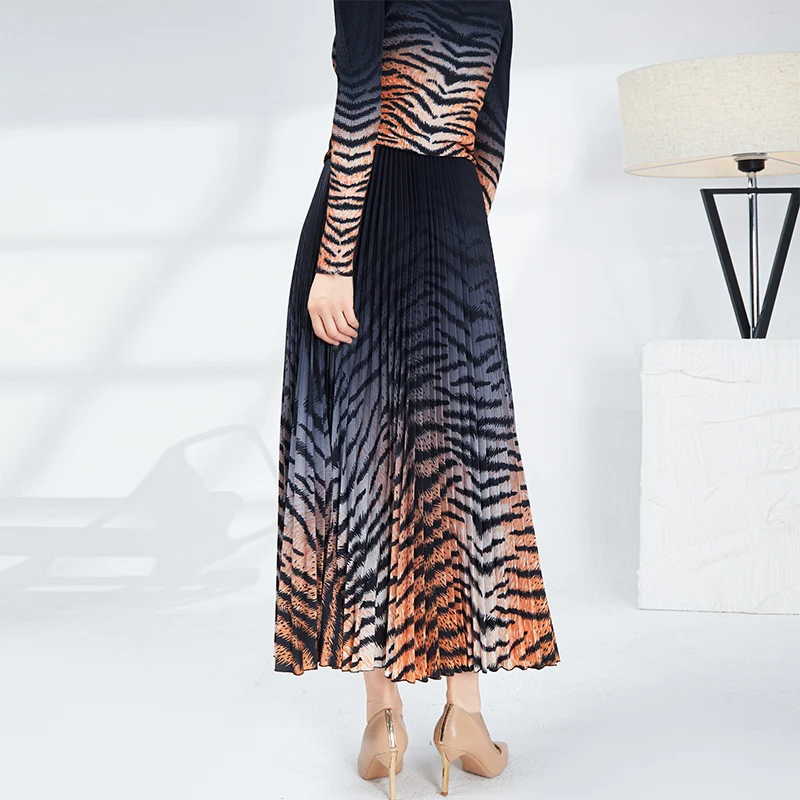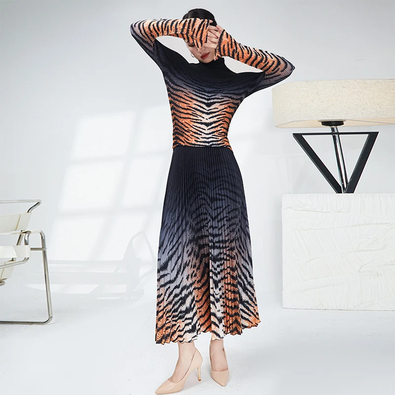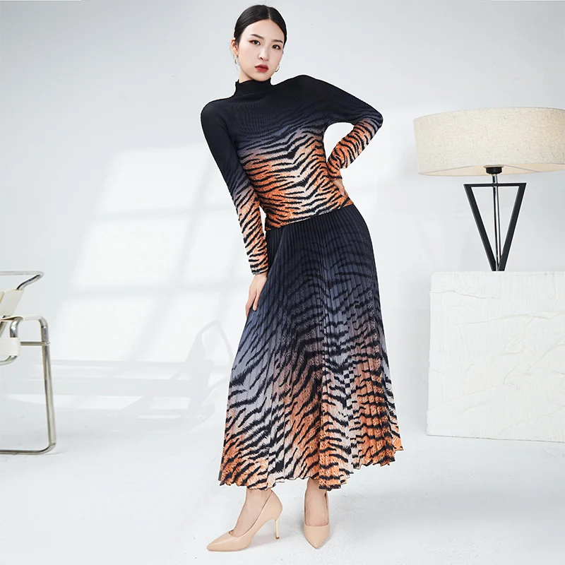 Woma Casual Style New Elastic Top and Long Pleated Skirt Two-Piece Set With Long Sleeve and Leopard Print for Women