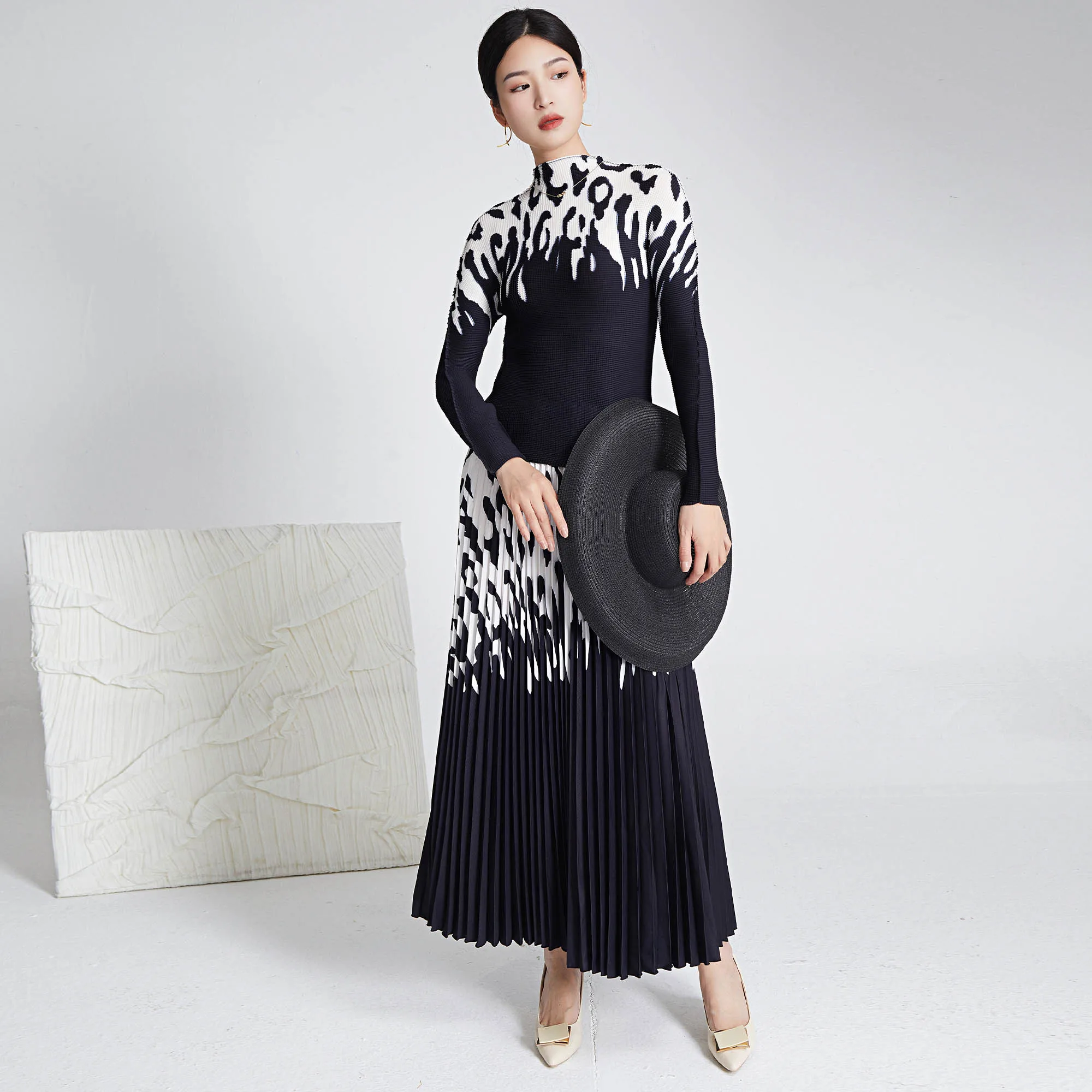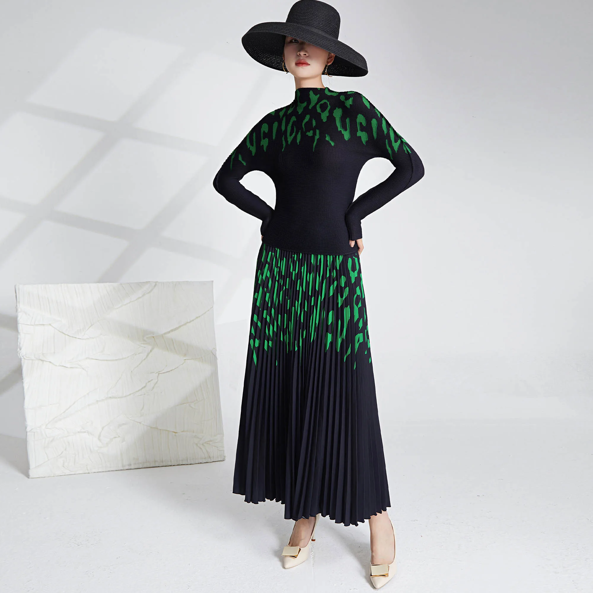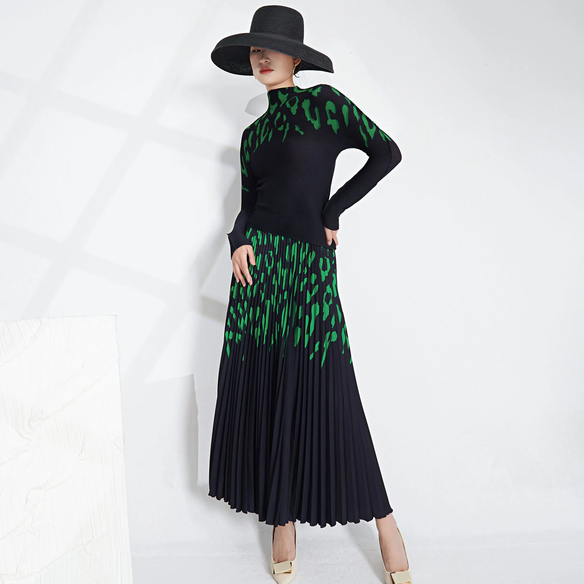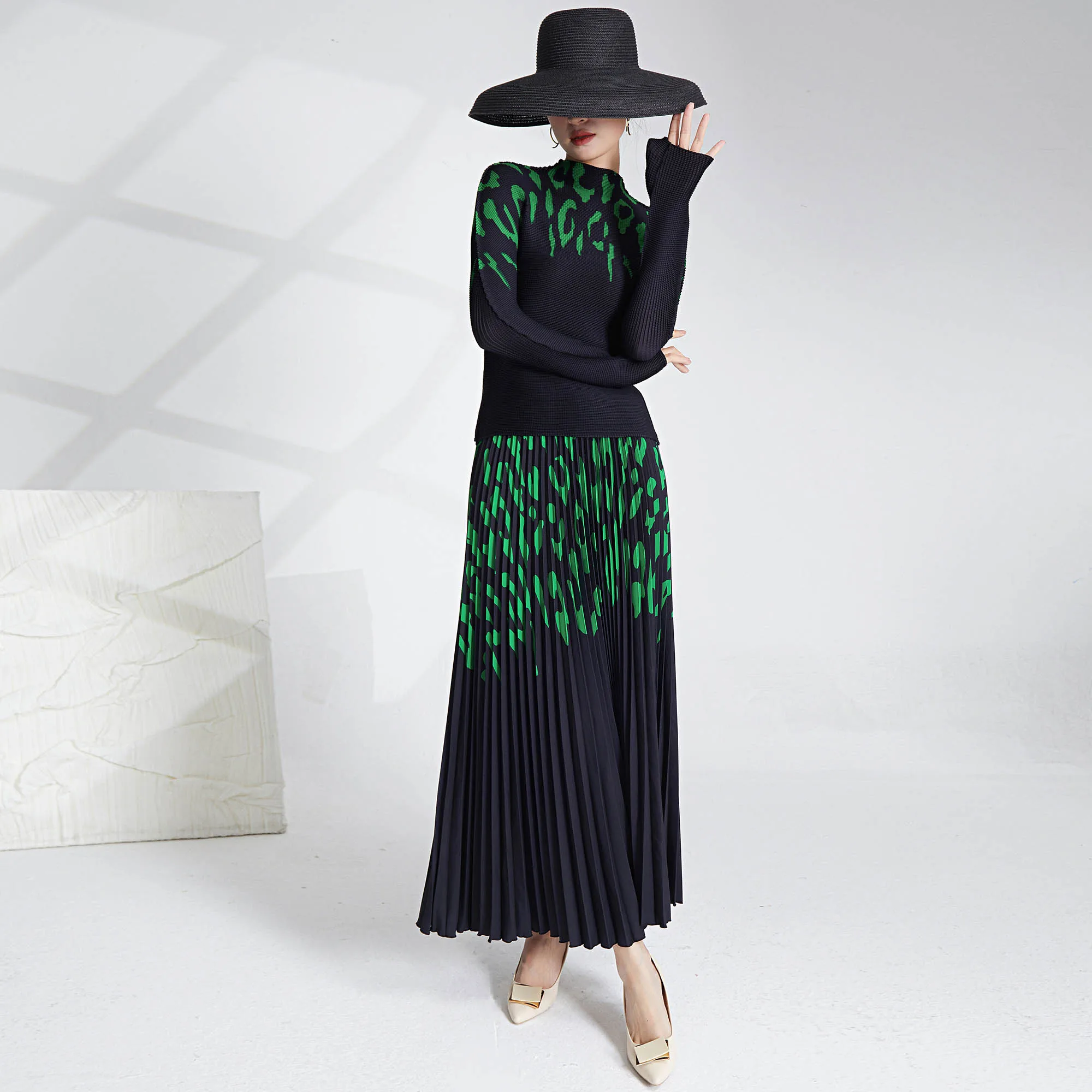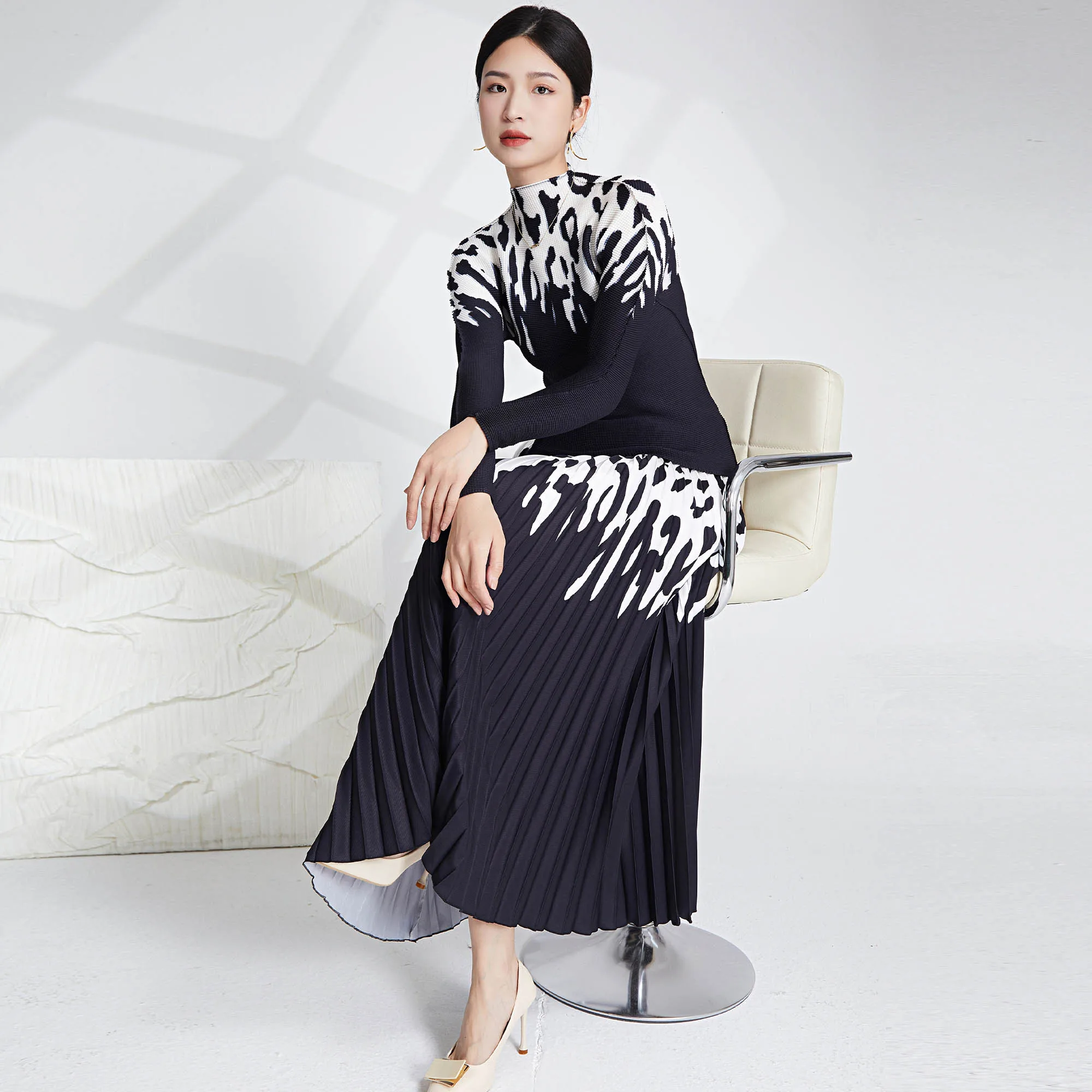 Ladies Casual Style Two-Piece Set Elastic Polyester Pleated Skirt and Long-Sleeved Top With Pattern Decoration